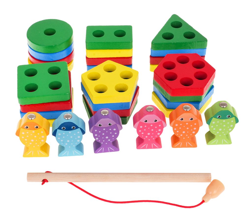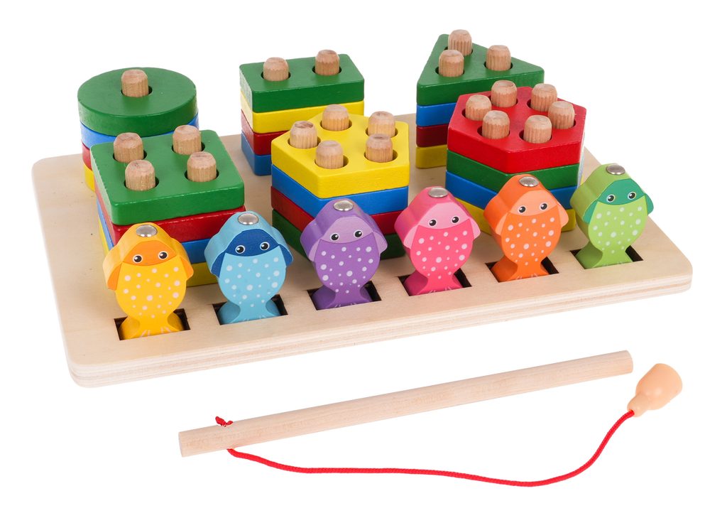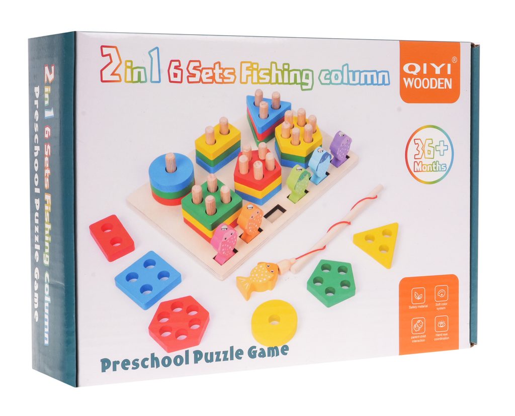 Sada 2v1, dřevěné puzzle a rybaření, je navržena pro děti od 3 let a nabízí zábavnou i vzdělávací aktivitu. Skládá se z dřevěné základny s kolíky a obdélníkovými prohlubněmi, na které děti umisťují barevné bloky různých geometrických tvarů, jako jsou kruh, obdélník, trojúhelník, čtverec, pětiúhelník a šestiúhelník. Každý tvar má odpovídající počet otvorů, které musí dítě správně přiřadit ke kolíkům.Další částí sady je magnetická rybářská hra, kde děti pomocí magnetického prutu chytají ryby a umisťují je do prohlubní. Tato sada pomáhá rozvíjet manuální dovednosti, zrakovou koordinaci, motoriku a kreativitu dítěte.