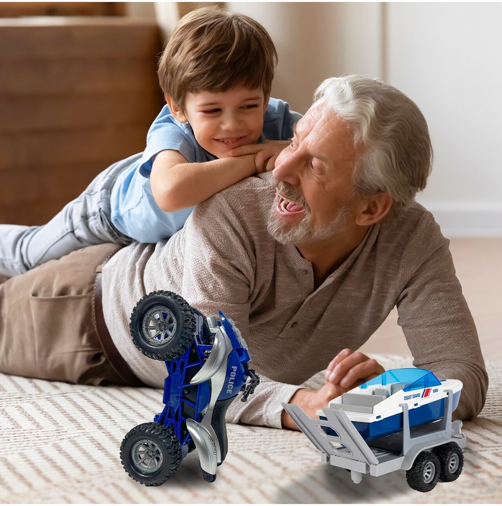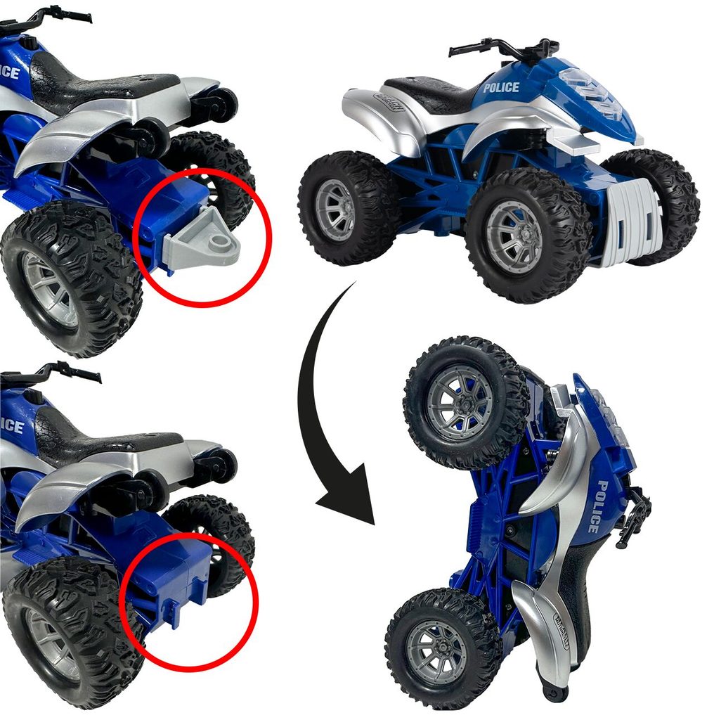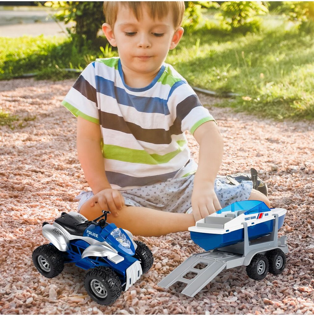 Dětská interaktivní čtyřkolka je ideální hračkou pro rozvoj manuální zručnosti a logického myšlení. Součástí sestavy je čtyřkolka s předním pohonem na setrvačník a přívěs s loďí. Hračka má ve výbavě také osvětlení a zvukové efekty. Zábava malého motoristického fandy je tak nekonečná. Hračka je určena pro děti od 36 měsíců věku.