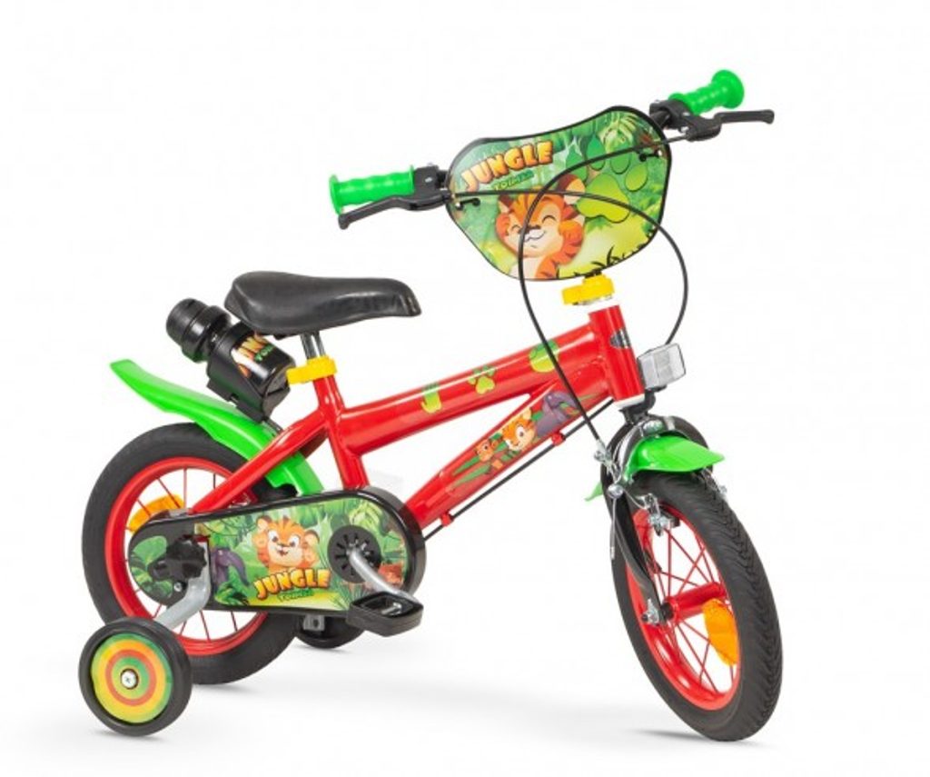 Originální dětské kolo od španělského výrobce Toimsa Jungle s velikostí ráfků 12 palců je určeno pro nejmenší děti ve věku od 3 do 4,5 let s výškou do 95 cm. Kolo je opatřeno demontovatelnými balančními kolečky, dítě se tedy bude cítit hned od první jízdy bezpečně a stabilně. Kolo je vybaveno 2 druhy brzd. Brždění probíhá buď zadní bubnovou brzdou nebo lze použít přední pákovou brzdu. Obě brzdy se ovládají pomocí páček umístěných na řídítkách. Proti nechtěnému namotání nohavice nebo tkaničky do řetězu má kolo kryt s barevným potiskem, který zakrývá celý řetěz. Sedadlo i řídítka jsou výškově nastavitelné. Za sedadlem je umístěný nosič s lahví na pití.