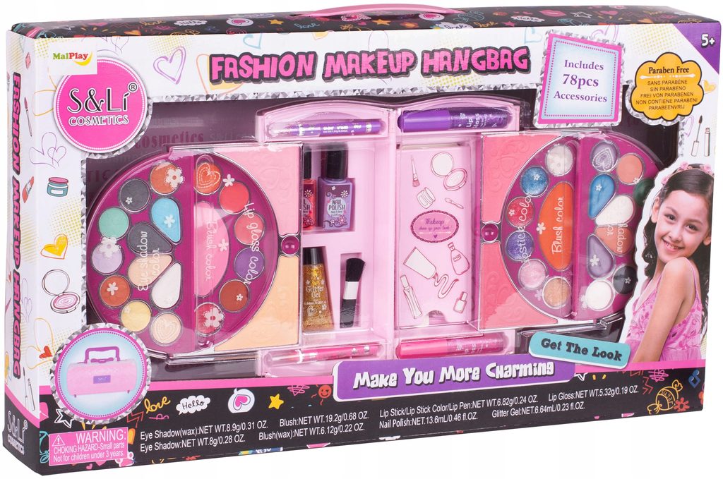 Kompletní kosmetická sada v rozkládací kabelce Fashion Handbag je ideální hračkou pro každou malou princeznu, která zde najde vše potřebné pro líčení. Kabelku lze jednoduše složit a přenášet. Součástí setu je celkem 78 součástí jako jsou laky na nehty, lesky na rty, rtěnky, oční stíny, štětečky, houbička a další. Vše je vyrobeno z bezpečných materiálů. Make-up lze jednoduše odstranit vatovými tampónky namočenými v mýdlovém roztoku. Hračka je vyrobená z plastu v pestrobarevném provedení a určena pro děti od 5 let.