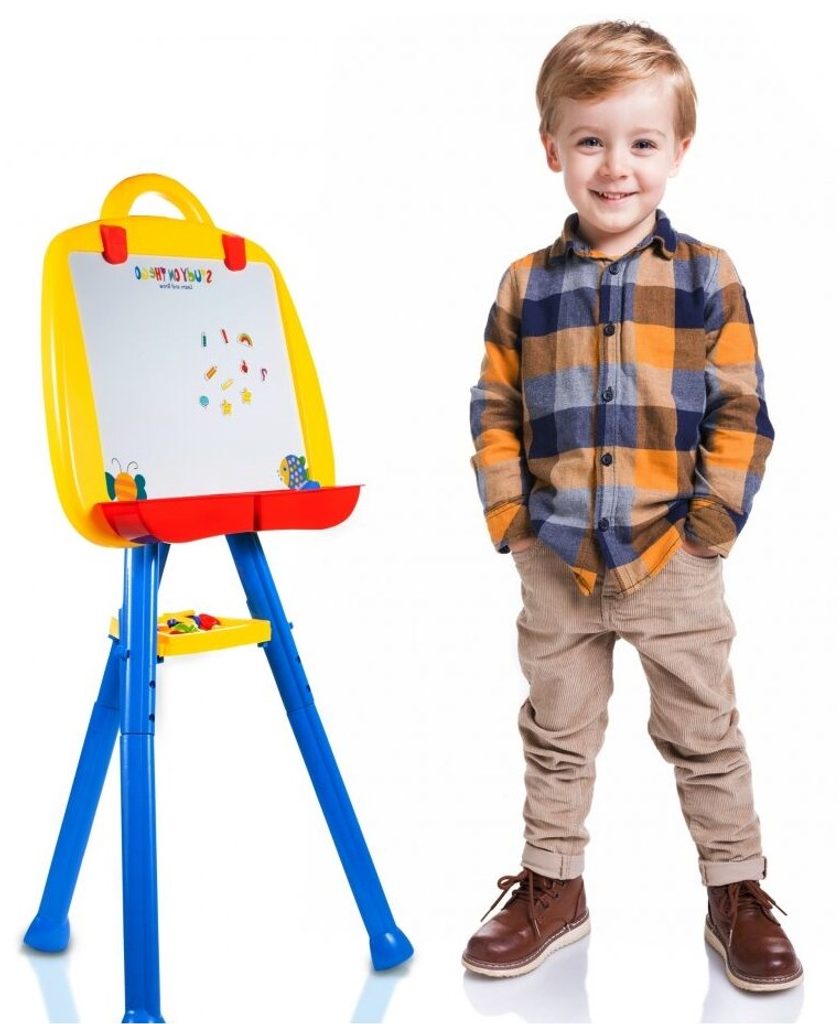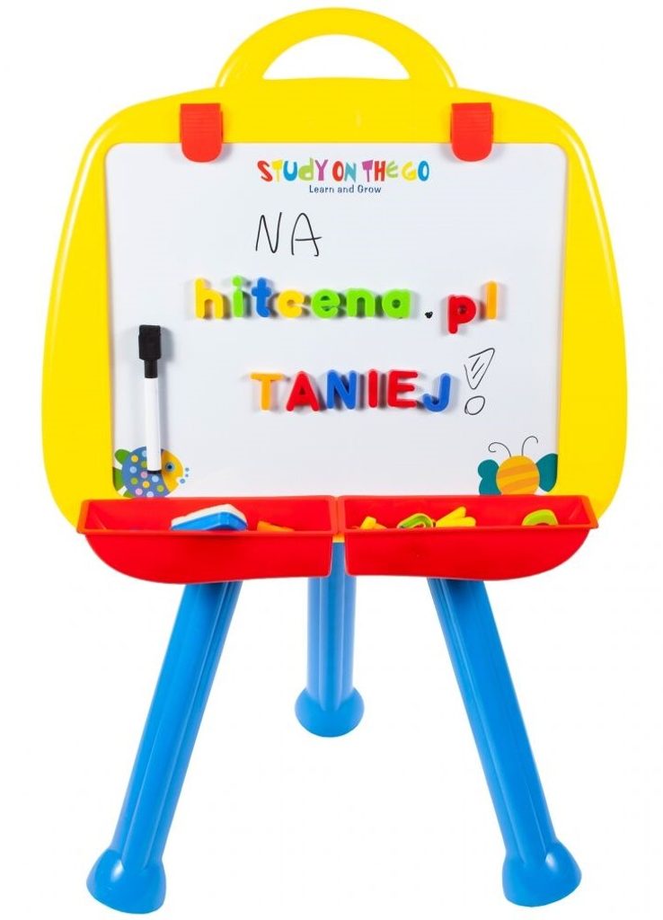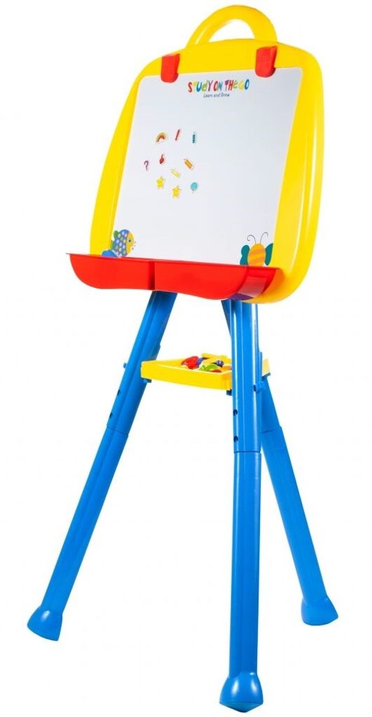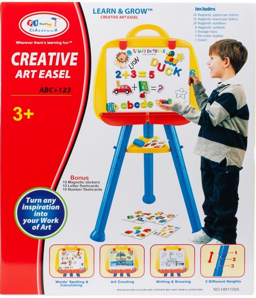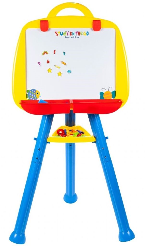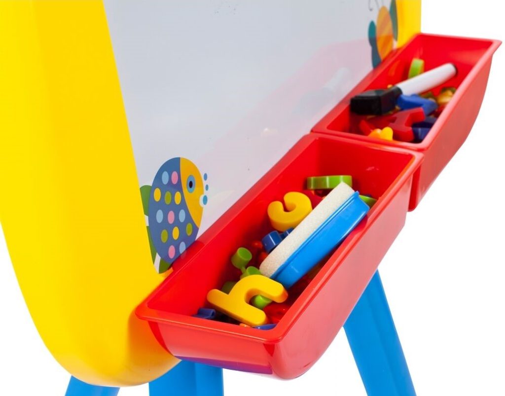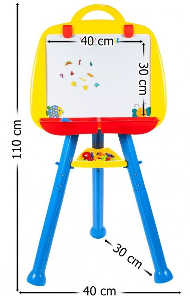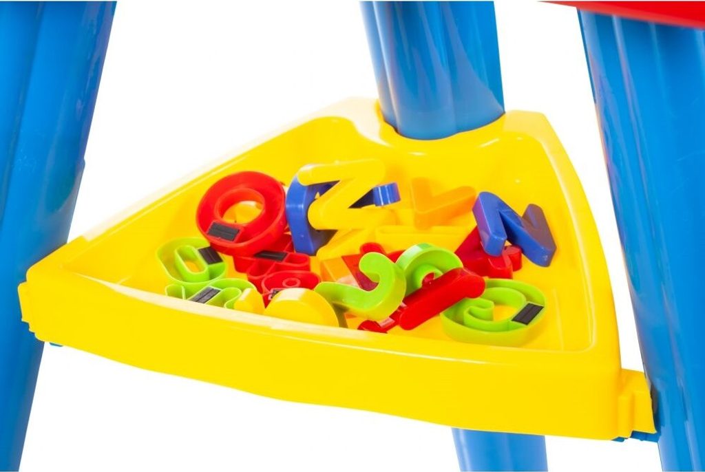 Kreslící tabule First Classroom je skvělou hračkou při první nauce psaní, kreslení a rozpoznávání písmenek. Magnetická strana tabule slouží pro psaní křídou a také pro připevnění písmenek a magnetek. Ve spodní části tabule jsou umístěny praktické poličky na příslušenství. Součástí sady jsou magnetické písmenka, symboly, fix, houbička a magnetické nálepky. Tabule je vyrobena z kvalitního plastu bez ostrých hran. Tato hračka je určena pro děti od 3 let věku.