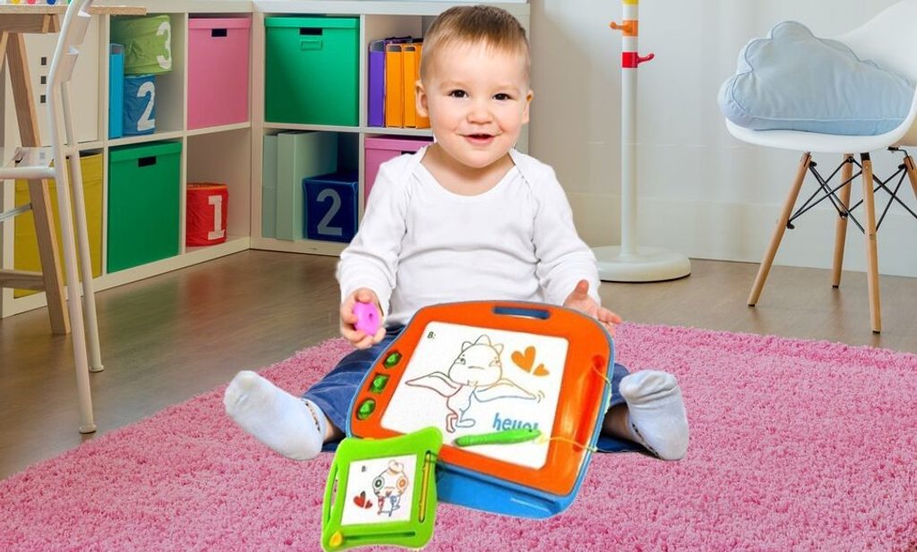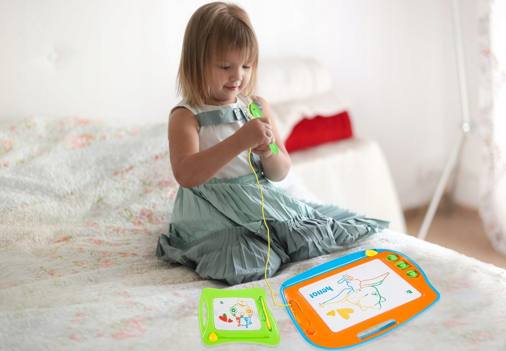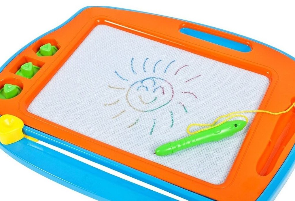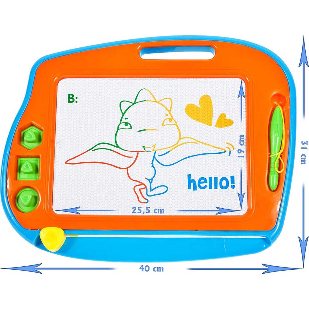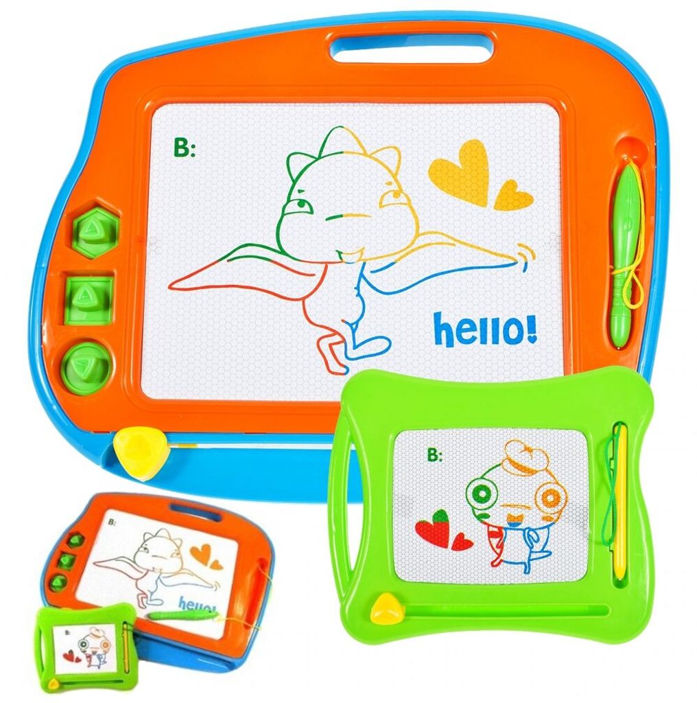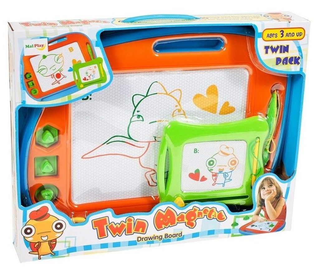 Kreslící tabulka 2v1 Twin Magnetic je skvělou hračkou při první nauce psaní a kreslení. Sada obsahuje větší a menší kreslící tabulku. Na boční straně větší tabulky jsou umístěny 3 razítka ve tvaru kruhu, čtverce a šestiúhelníku, které zcela jistě ještě více zpestří hru. Kreslící plocha je bílá a má zabudované 4 barvy. Na spodní straně je umístěný jezdec , kterým se mažou všechny kresby. Kreslí se speciálním fixem zavěšeným na šňůrce. Tabulky jsou vyrobeny z kvalitního plastu bez ostrých hran. Tato hračka je určena pro děti od 3 let věku.