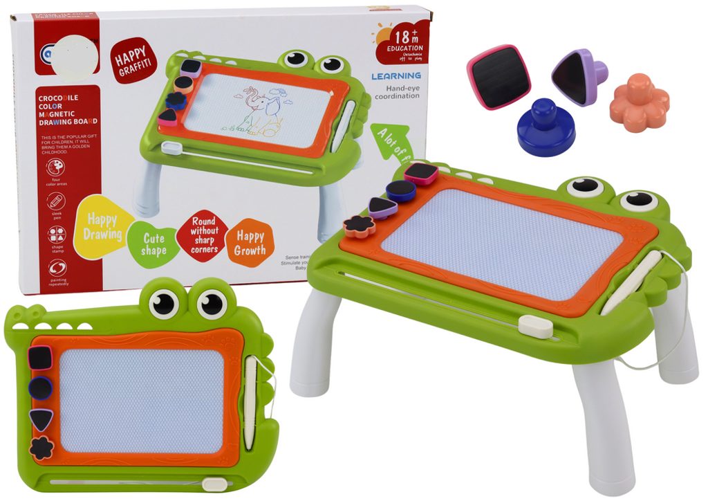 Kreslící tabulka Krokodýl s razítky je skvělou hračkou při první nauce psaní a kreslení. Na boku kreslící plochy jsou umístěny 4 razítka v různých tvarech, které zcela jistě ještě více zpestří hru. Kreslící plocha má zabudované 4 barvy. Na spodní straně je umístěný jezdec, kterým se mažou všechny kresby. Kreslí se speciálním fixem uloženým na boku tabulky. Tabulka je vyrobena z plastu bez ostrých hran. Tato hračka je určena pro děti od 18 měsíců věku.