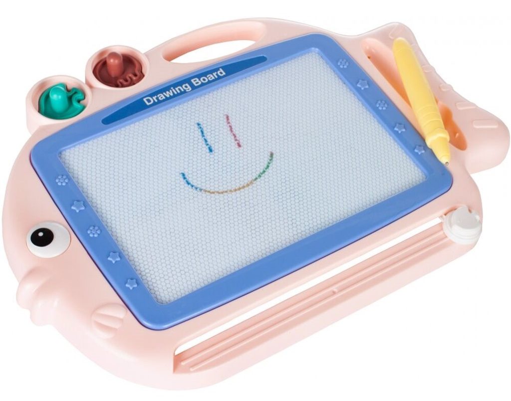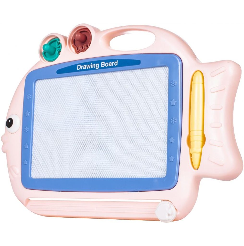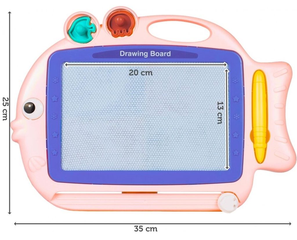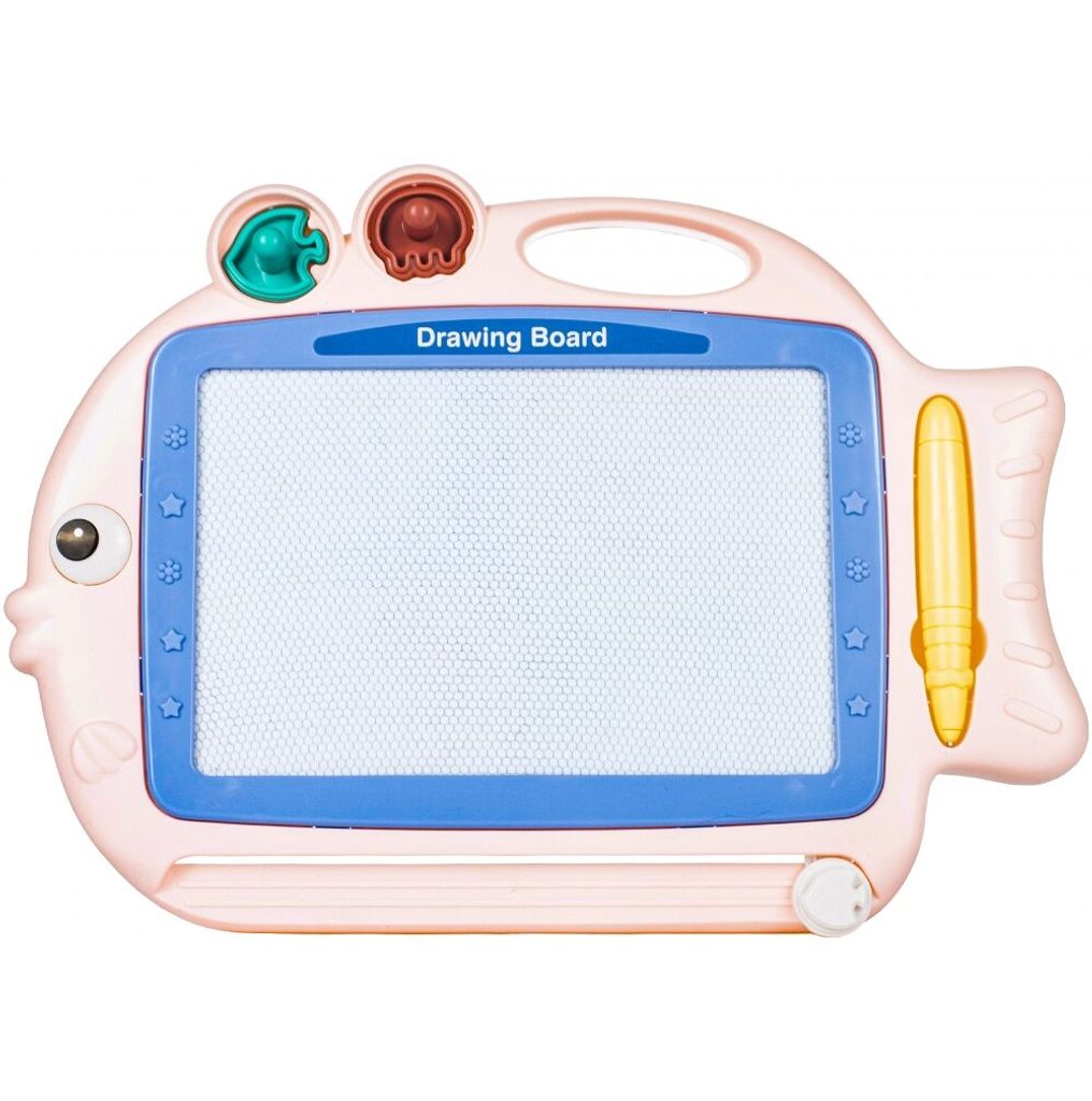 Kreslící tabulka Růžová rybka s razítky je skvělou hračkou při první nauce psaní a kreslení. Nad kreslící plochou jsou umístěny 2 razítka ve tvaru rybky a chobotnice, které zcela jistě ještě více zpestří hru. Kreslící plocha má zabudované 4 barvy. Na spodní straně je umístěný jezdec s rybičkou, kterým se mažou všechny kresby. Kreslí se speciálním fixem uloženým na boku tabulky. Tabulka je vyrobena z plastu bez ostrých hran. Tato hračka je určena pro děti od 3 let věku.