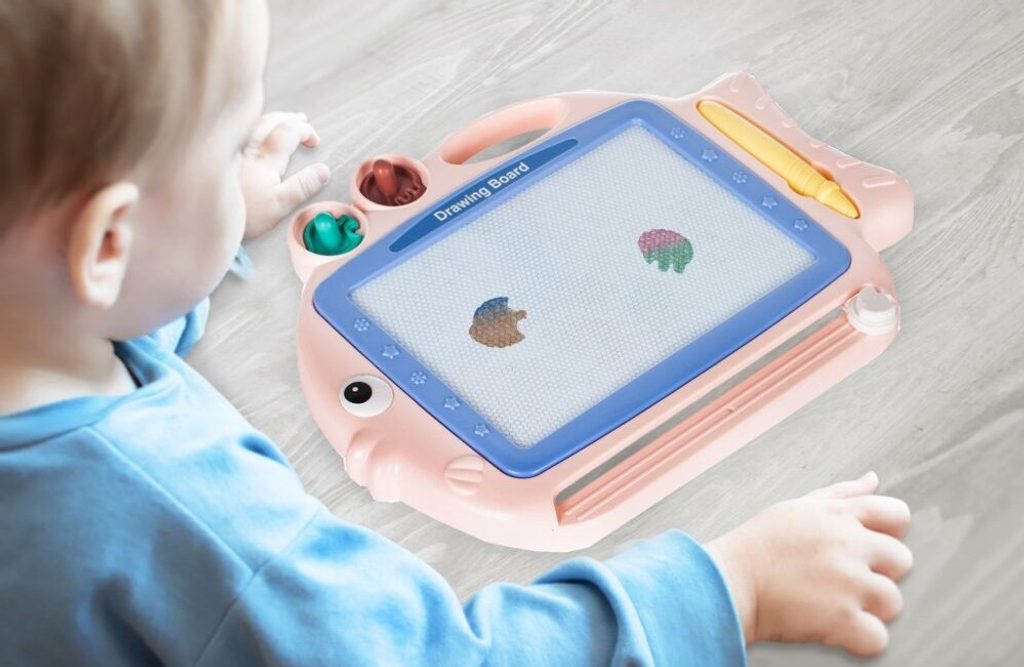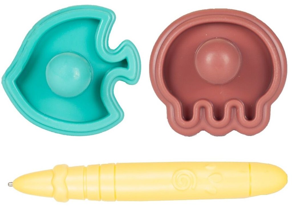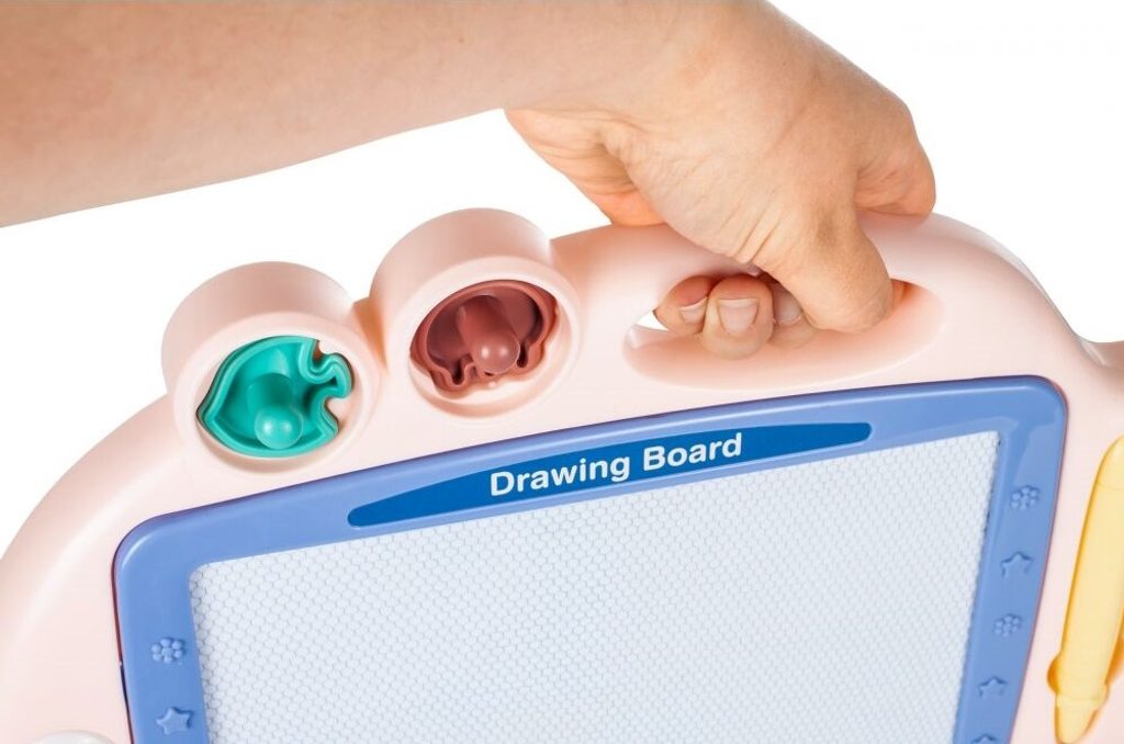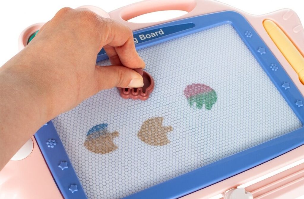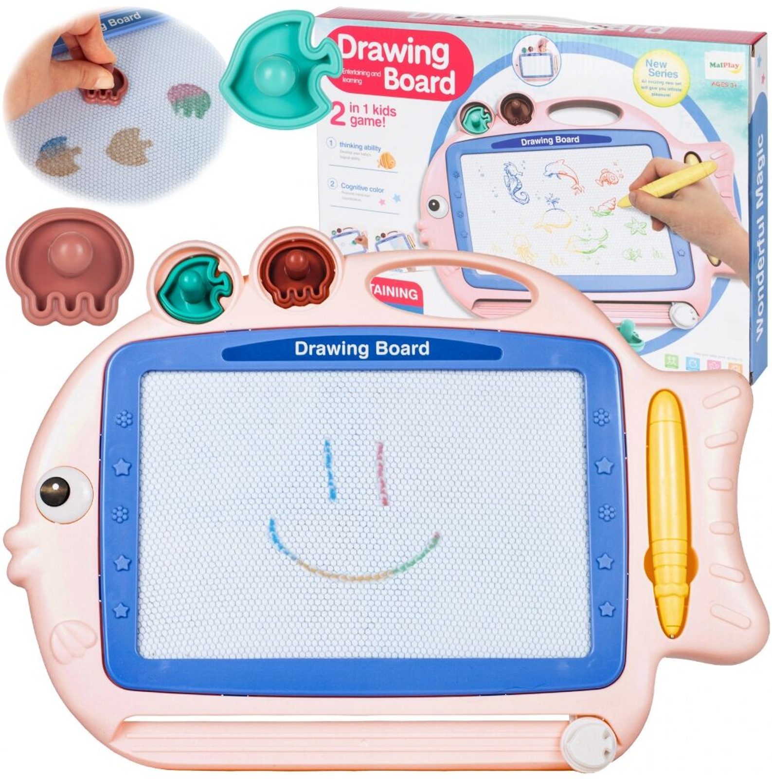 Kreslící tabulka Růžová rybka s razítky je skvělou hračkou při první nauce psaní a kreslení. Nad kreslící plochou jsou umístěny 2 razítka ve tvaru rybky a chobotnice, které zcela jistě ještě více zpestří hru. Kreslící plocha má zabudované 4 barvy. Na spodní straně je umístěný jezdec s rybičkou, kterým se mažou všechny kresby. Kreslí se speciálním fixem uloženým na boku tabulky. Tabulka je vyrobena z plastu bez ostrých hran. Tato hračka je určena pro děti od 3 let věku.