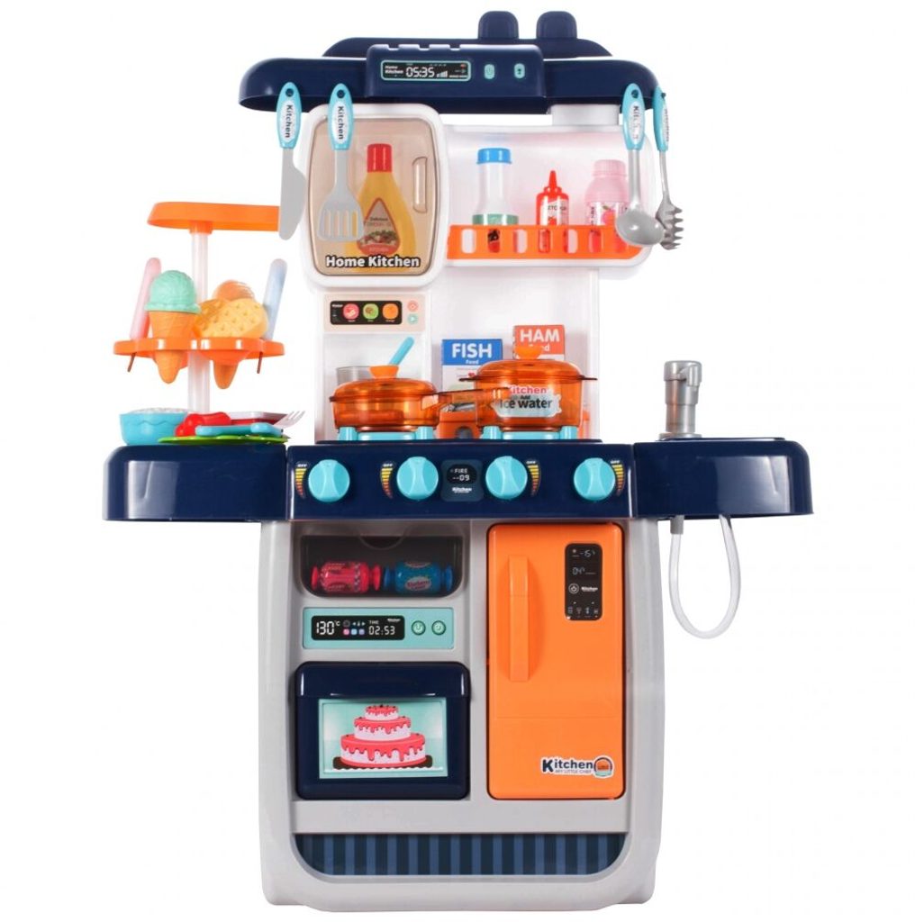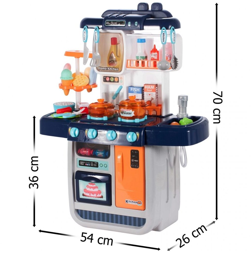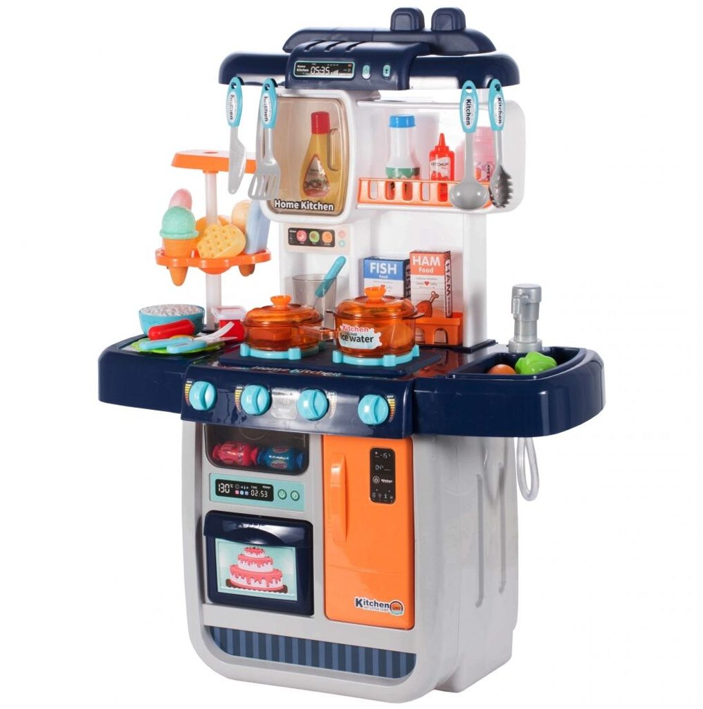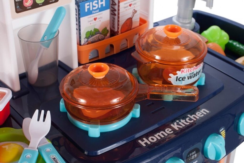 Interaktivní dětská kuchyňka Home Kitchen pro nejmenší děti se studenou párou a tekoucí vodou je určena pro děti od 36 měsíců věku. Je vybavena příslušenstvím jako jsou příbory, hrnce s poklicí, imitace potravin a mnoho dalších. Levý hořák způsobuje po nalití malého množství vody efekt studené páry takže vaření bude opravdu jako skutečné. Po nalití vody do dřezu a zmáčknutí speciálního tlačítka začne téct voda a děti mohou mýt nádobí jako v reálné kuchyni. Vaše dítě se určitě s touto velkou kuchyňkou nudit nebude. Vpředu je umístěna otevírací lednice a trouba. Je vyrobena z plastu v pestrobarevném provedení.