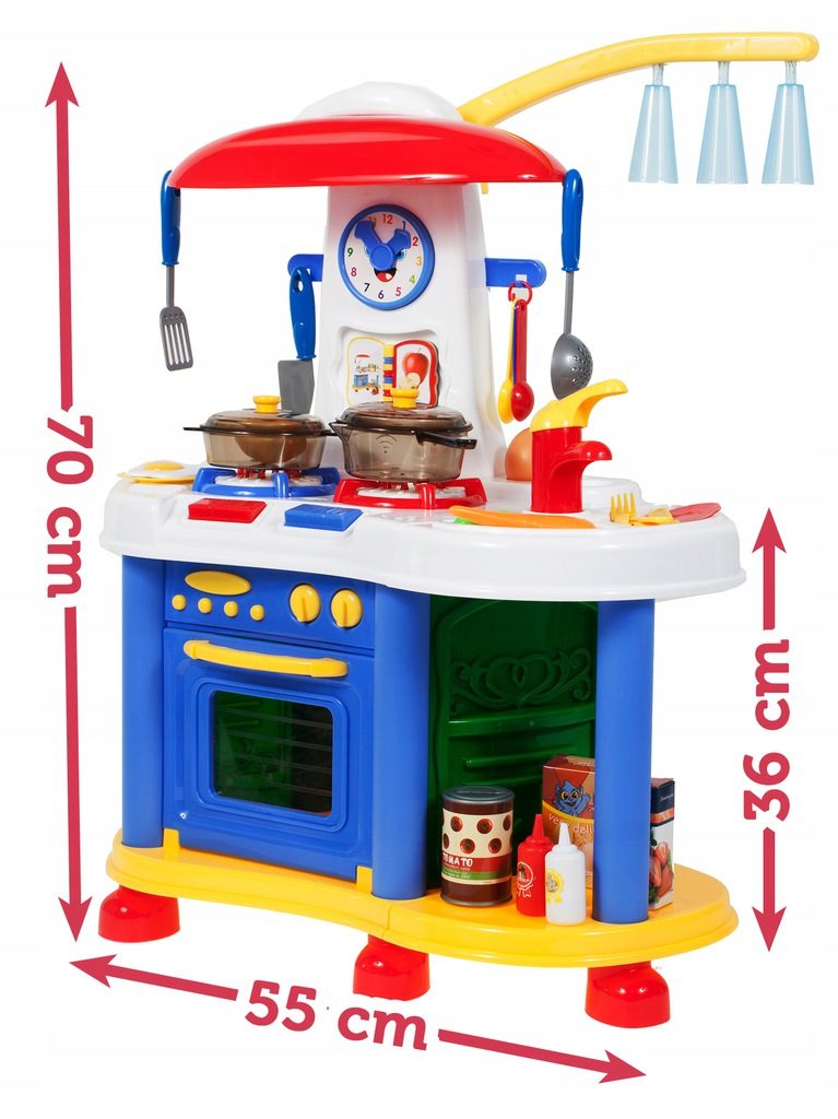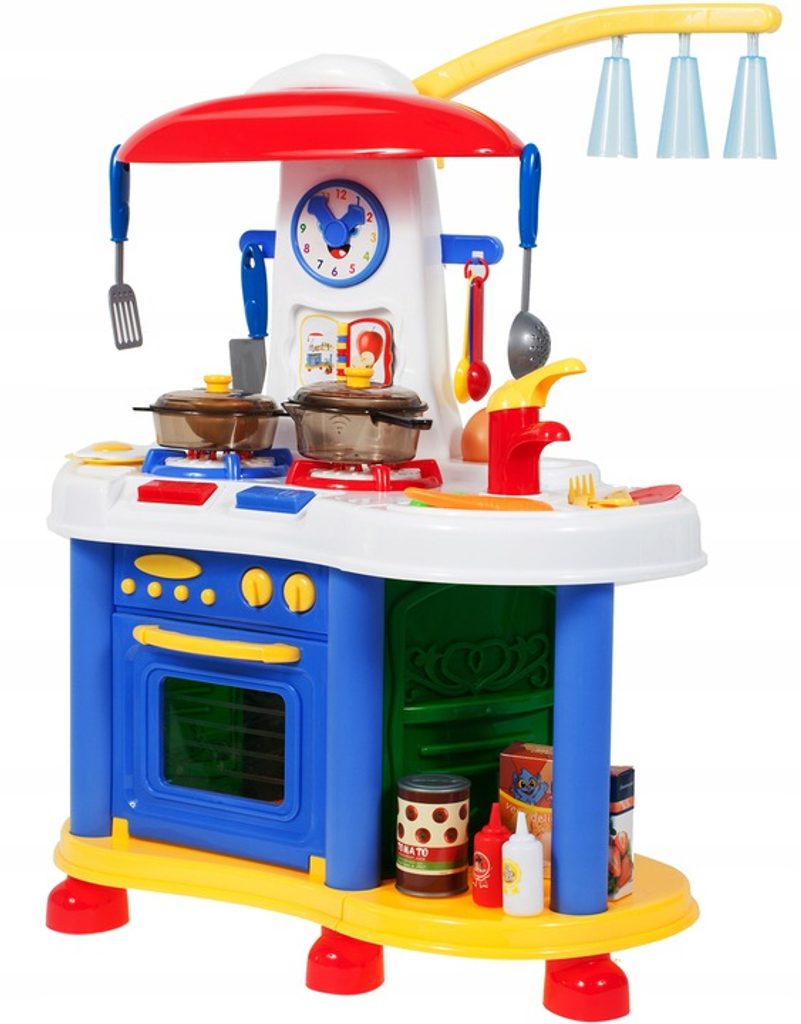 Interaktivní dětská kuchyňka Clock Kitchen se světelnými a zvukovými efekty je určena pro děti od 3 let věku. Je vybavena příslušenstvím jako jsou příbory, talíře, hrnce s pokličkami, imitace potravin a mnoho dalších. Vaše dítě se určitě s touto velkou kuchyňkou nudit nebude. Trouba kuchyňky je otevírací. Po otočení vypínačů se rozsvítí hořáky a spustí zvuk napodobující smažení a bublání. Kuchyňka je vyrobena z plastu v pestrobarevném provedení.