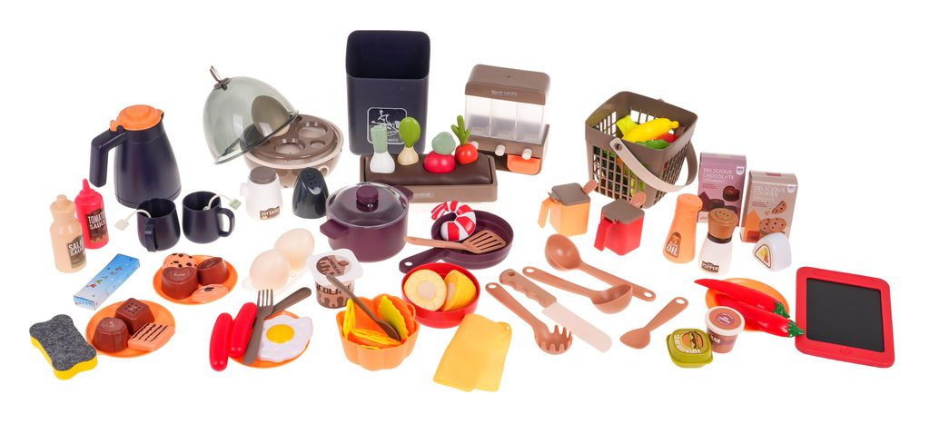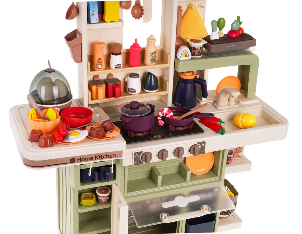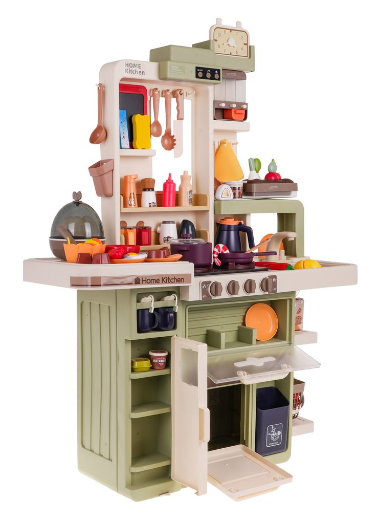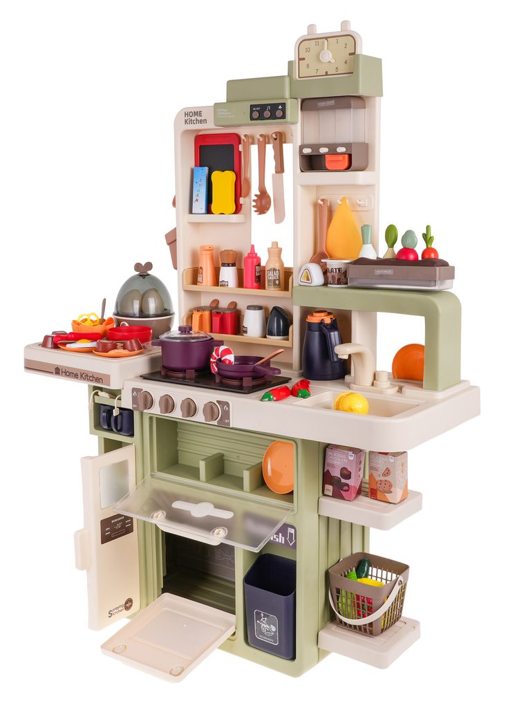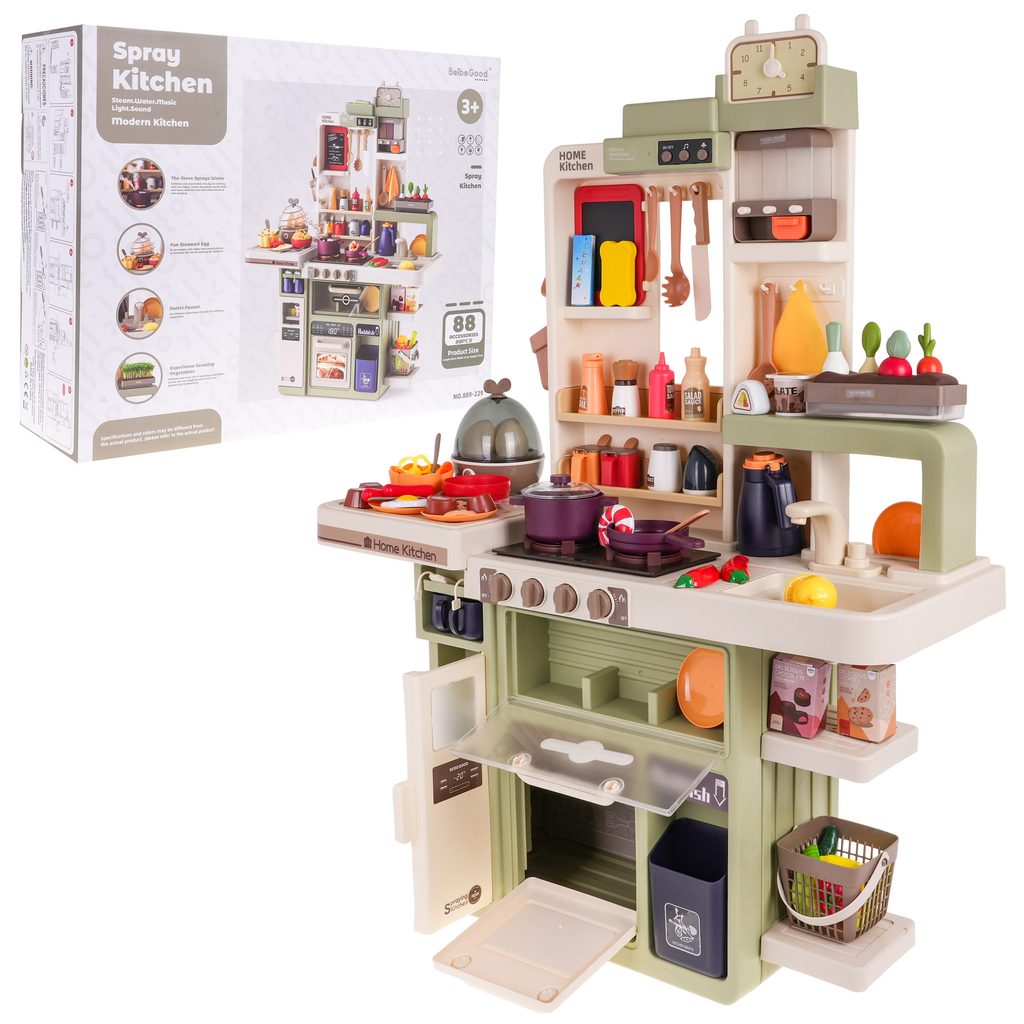 Interaktivní dětská kuchyňka Spray Kitchen se zvuky a světlem a tekoucí vodou je určena pro děti od 36 měsíců věku. Je vybavena celkem 88 elementy jako jsou příbory, pánev, salátová miska, čajová souprava, hotová jídla, talíře a mnoho dalších. Hořák způsobuje po nalití malého množství vody efekt studené páry takže vaření bude opravdu jako skutečné. V přední části je umístěn panel ze kterého lze ovládat melodie. Po nalití vody do dřezu a zmáčknutí speciálního tlačítka začne téct voda a děti mohou mýt nadobí jako v reálné kuchyni. Vaše dítě se určitě s touto velkou kuchyňkou nudit nebude. Trouba,lednice a skříňky jsou otevírací. Hodiny s posuvnými ručičkami pomůžou hlídat čas vaření, na kreslící tabuli může dítě psát třeba jídelníček. Kuchyňka je vybavena také funkčním vařičem vajíček a digestoří se světly a zvuky. Je vyrobena z kvalitního plastu v pestrobarevném provedení.