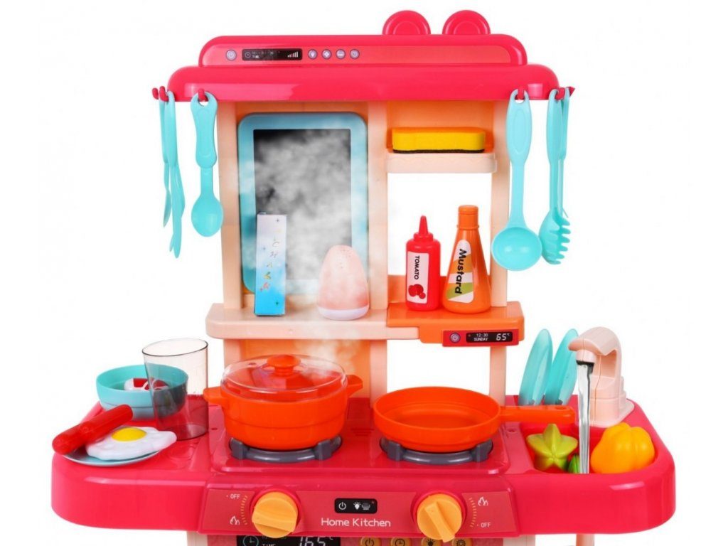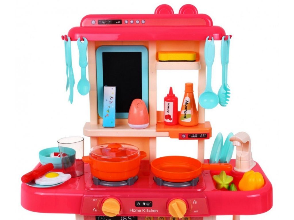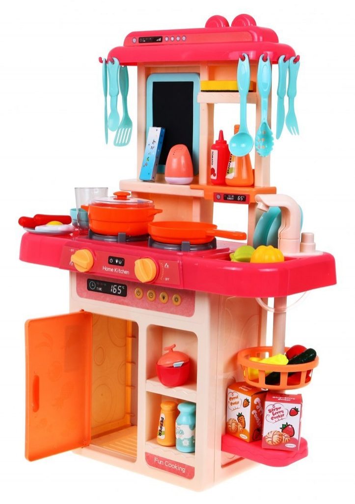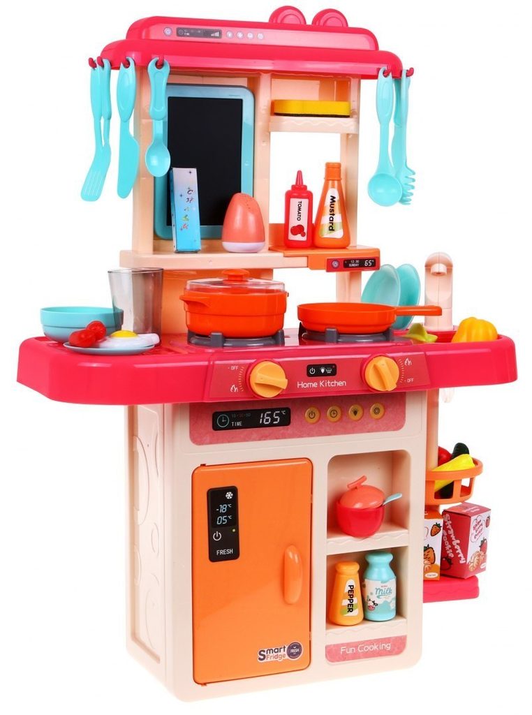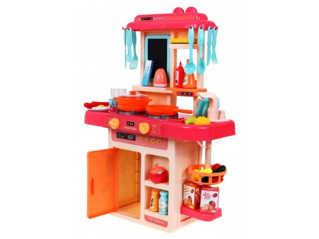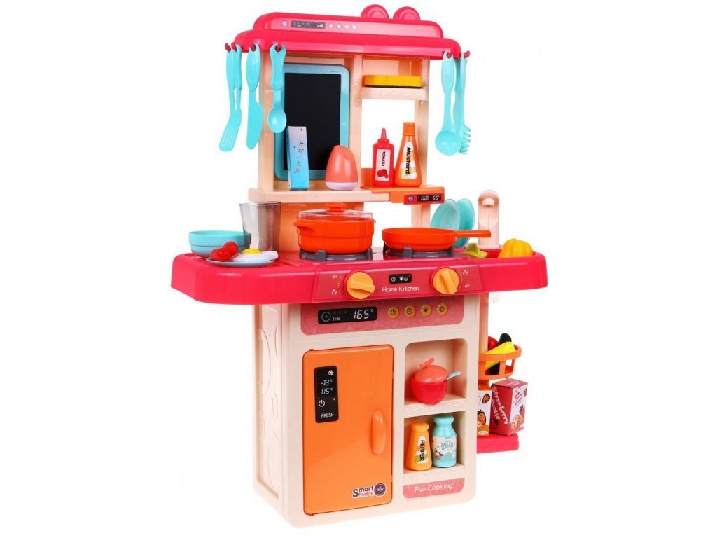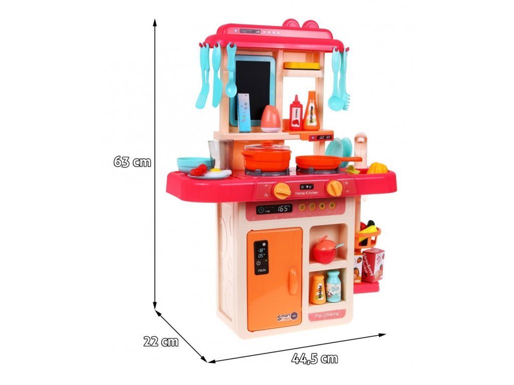 Interaktivní dětská mini kuchyňka pro nejmenší děti se studenou párou a tekoucí vodou je určena pro děti od 36 měsíců věku. Je vybavena celkem 42 elementy jako jsou příbory, pánev, salátová miska, hrnec s poklicí, hotová jídla, imitace ovoce a zeleniny a mnoho dalších. Levý hořák způsobuje po nalití malého množství vody efekt studené páry takže vaření bude opravdu jako skutečné. Po nalití vody do dřezu a zmáčknutí speciálního tlačítka začne téct voda a děti mohou mýt nádobí jako v reálné kuchyni. Vaše dítě se určitě s touto velkou kuchyňkou nudit nebude. Vpředu je umístěna otevírací lednice. Na kreslící tabuli může dítě psát třeba jídelníček. Je vyrobena z kvalitního plastu v pestrobarevném provedení.