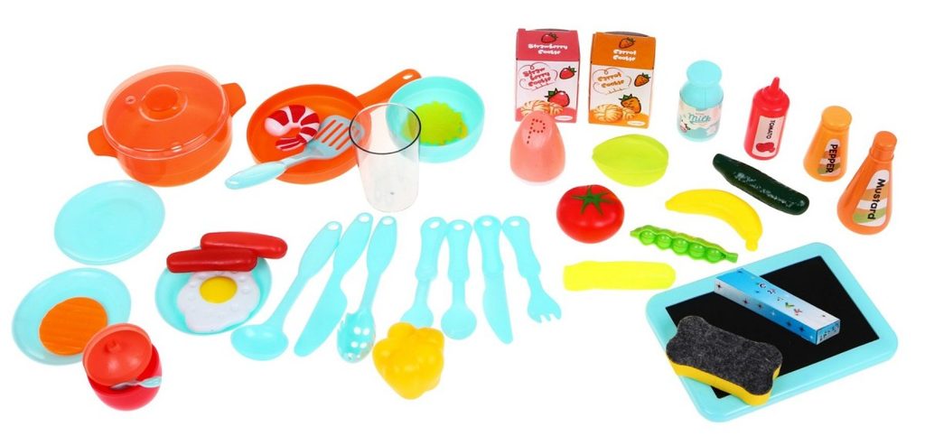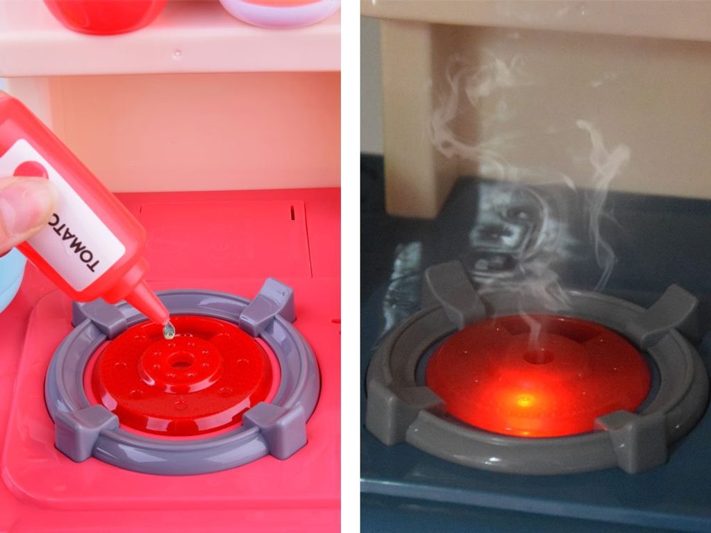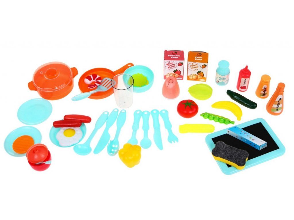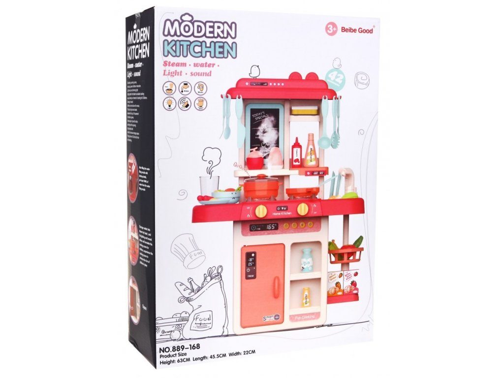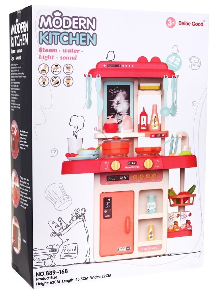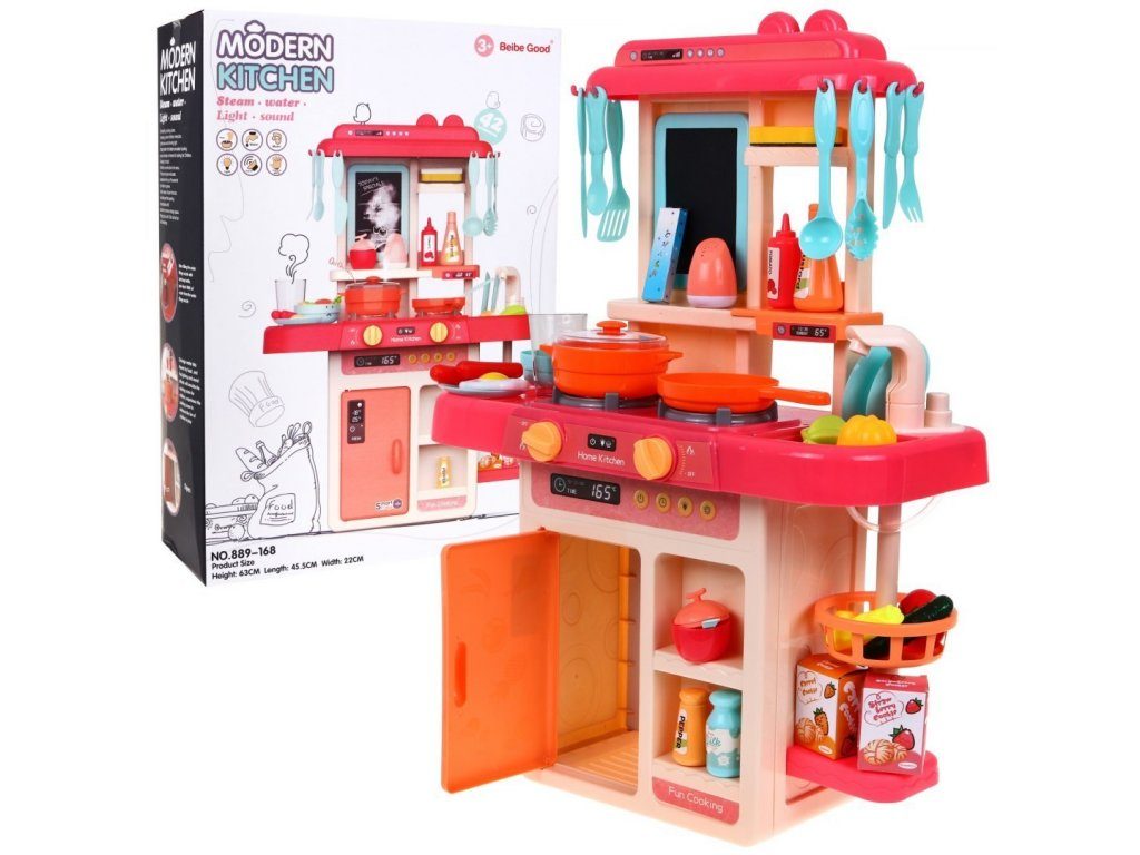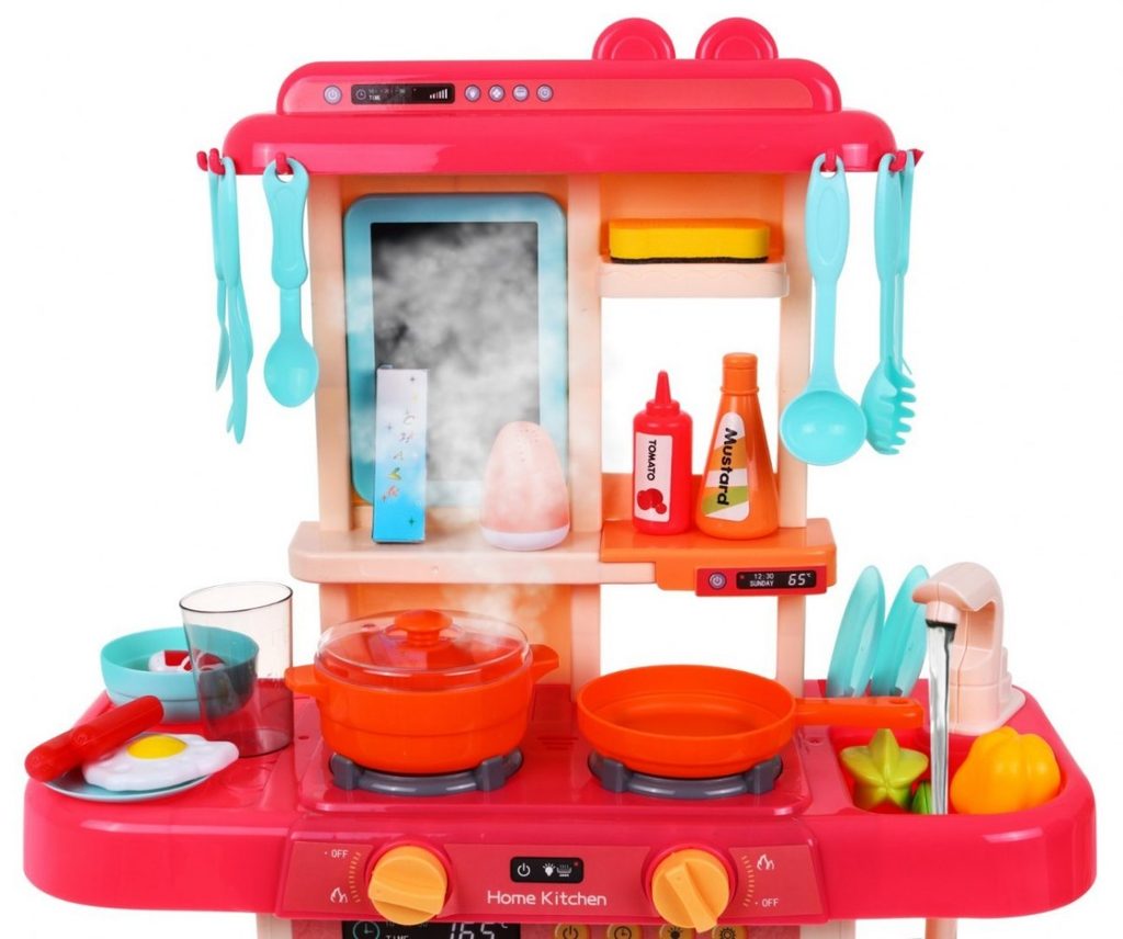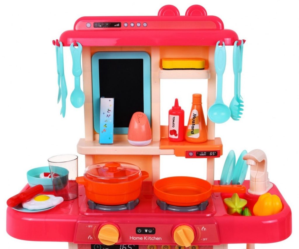 Interaktivní dětská mini kuchyňka pro nejmenší děti se studenou párou a tekoucí vodou je určena pro děti od 36 měsíců věku. Je vybavena celkem 42 elementy jako jsou příbory, pánev, salátová miska, hrnec s poklicí, hotová jídla, imitace ovoce a zeleniny a mnoho dalších. Levý hořák způsobuje po nalití malého množství vody efekt studené páry takže vaření bude opravdu jako skutečné. Po nalití vody do dřezu a zmáčknutí speciálního tlačítka začne téct voda a děti mohou mýt nádobí jako v reálné kuchyni. Vaše dítě se určitě s touto velkou kuchyňkou nudit nebude. Vpředu je umístěna otevírací lednice. Na kreslící tabuli může dítě psát třeba jídelníček. Je vyrobena z kvalitního plastu v pestrobarevném provedení.
