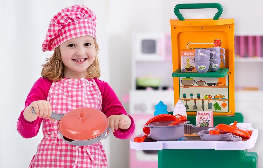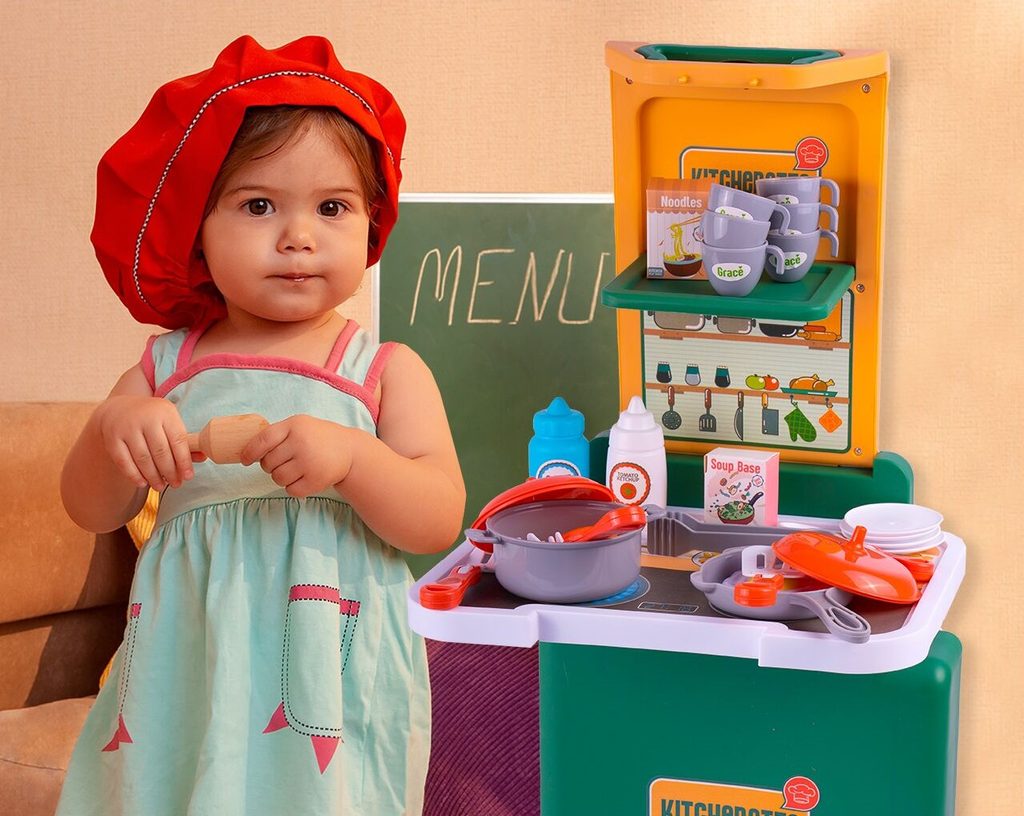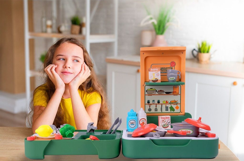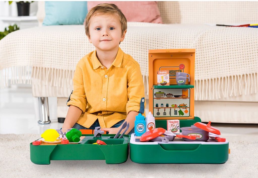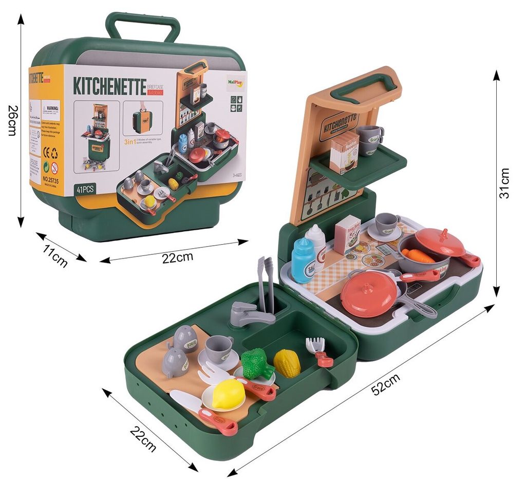 Skládací dětská mini kuchyňka Child Kitchenette je určena pro děti od 3 let věku. Je vybavena příslušenstvím jako je hrnec a pánev s pokličkami, imitace potravin, kuchyňské nářadí, kleště, hrnečky, talíře a další. Vaše dítě se určitě s touto kuchyňkou nudit nebude. Nespornou výhodou je možnost složení kuchyňky do kufříku s úchytem. Dítě si ji tak může vzít všude sebou. Je vyrobena z plastu v pestrobarevném provedení.