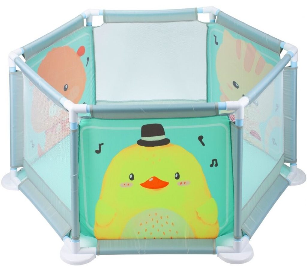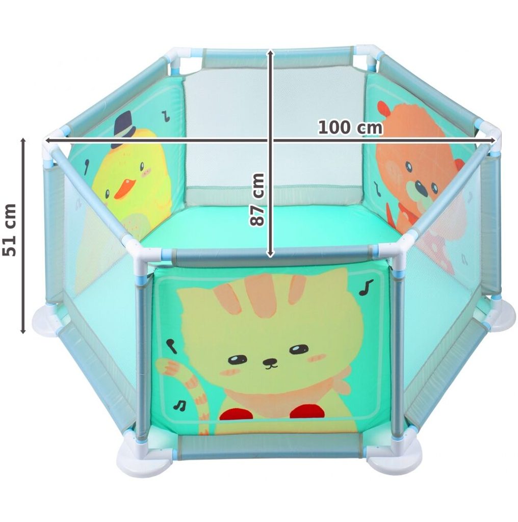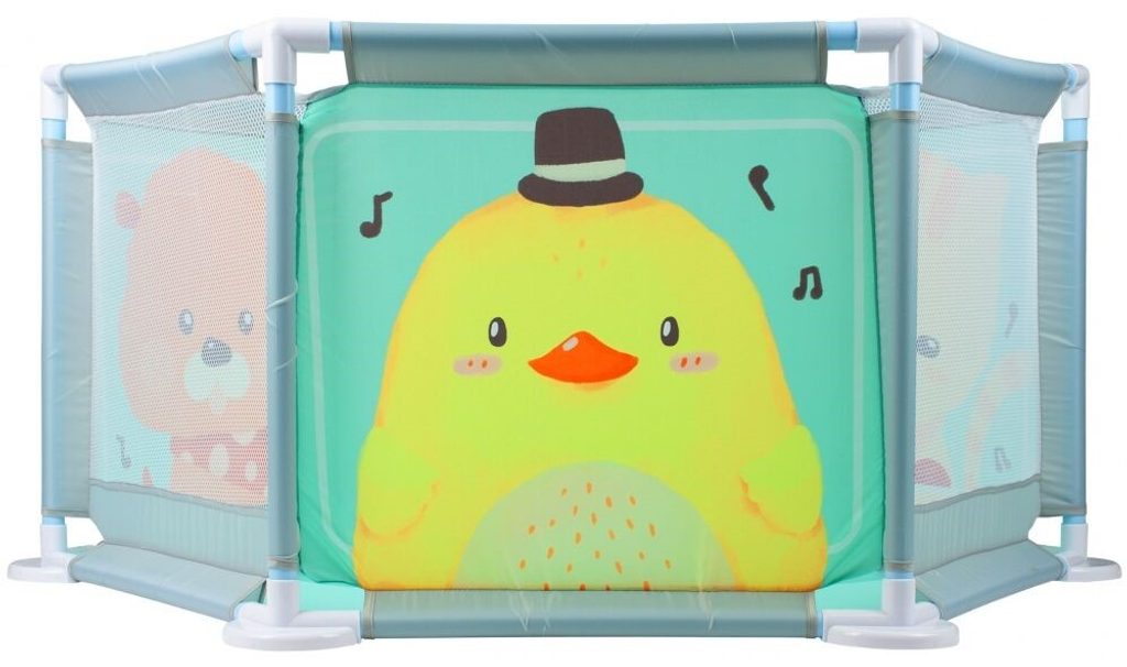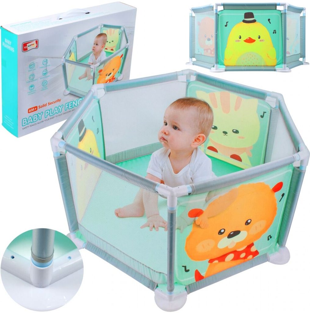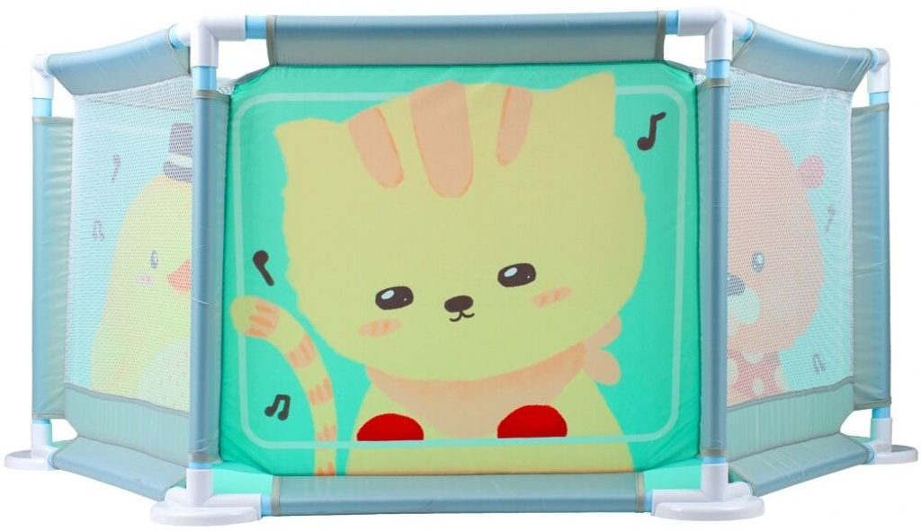 Bezpečná ohrádka Play Fence je určenapro miminka od 6 měsíců. Poskytuje prostor pro pohyb bez rizika zranění či pádu. Je vyrobená z bezpečných materiálů bez ostrých či malých prvků, snadno čistitelná. Stabilní rám zajišťuje pevnost a odolnost. Pohodlně přenositelná z místnosti do místnosti nebo ven na zahradu, aby dítě bylo v bezpečí i během každodenních aktivit rodičů. Ohrádka má tři stěny vyrobené ze síťoviny, umožňující pozorování miminka při hře. Jedna stěna je vybavena zipem pro snadný vstup a výstup. Na třech stěnách jsou velké obrázky: kočička, medvídek, ptáček.