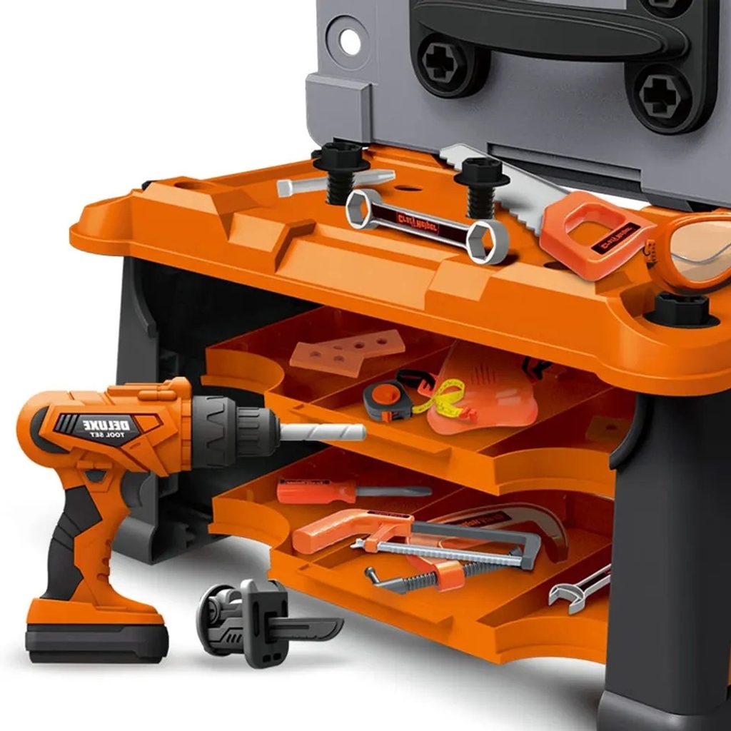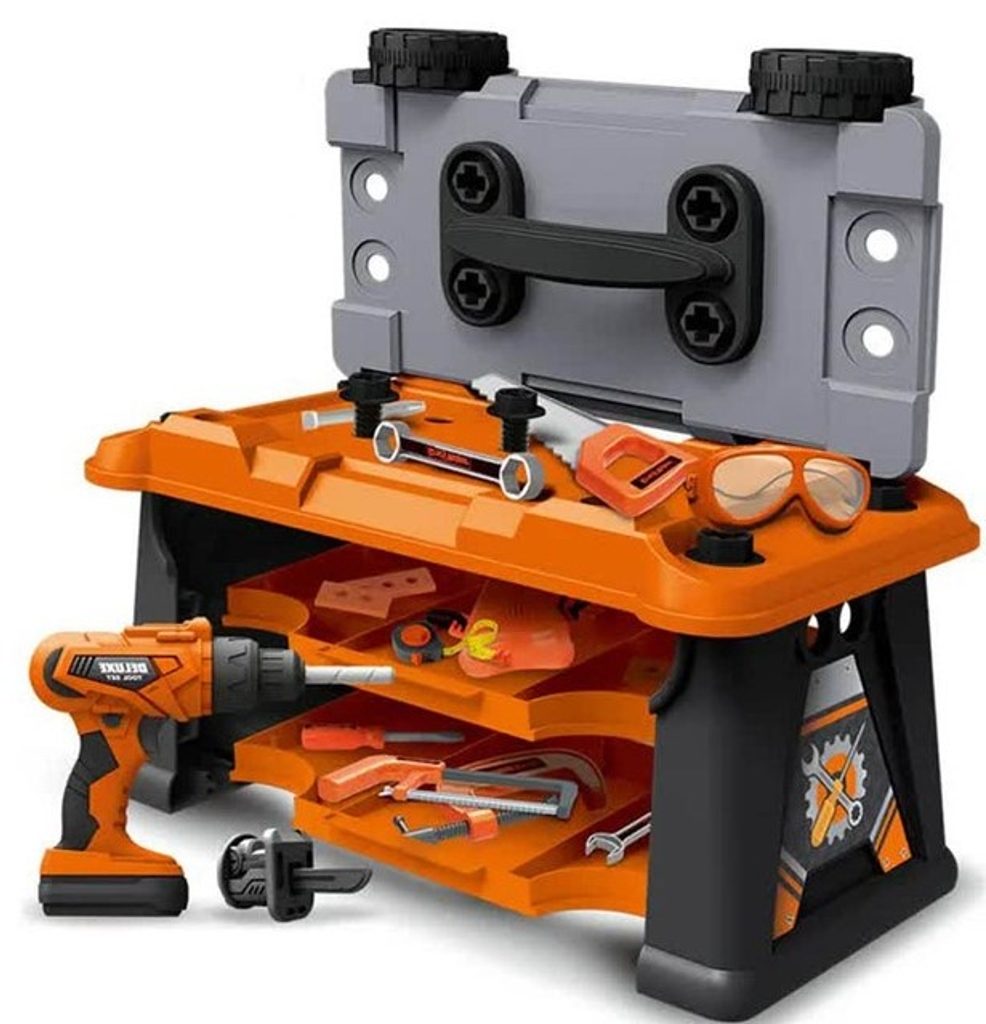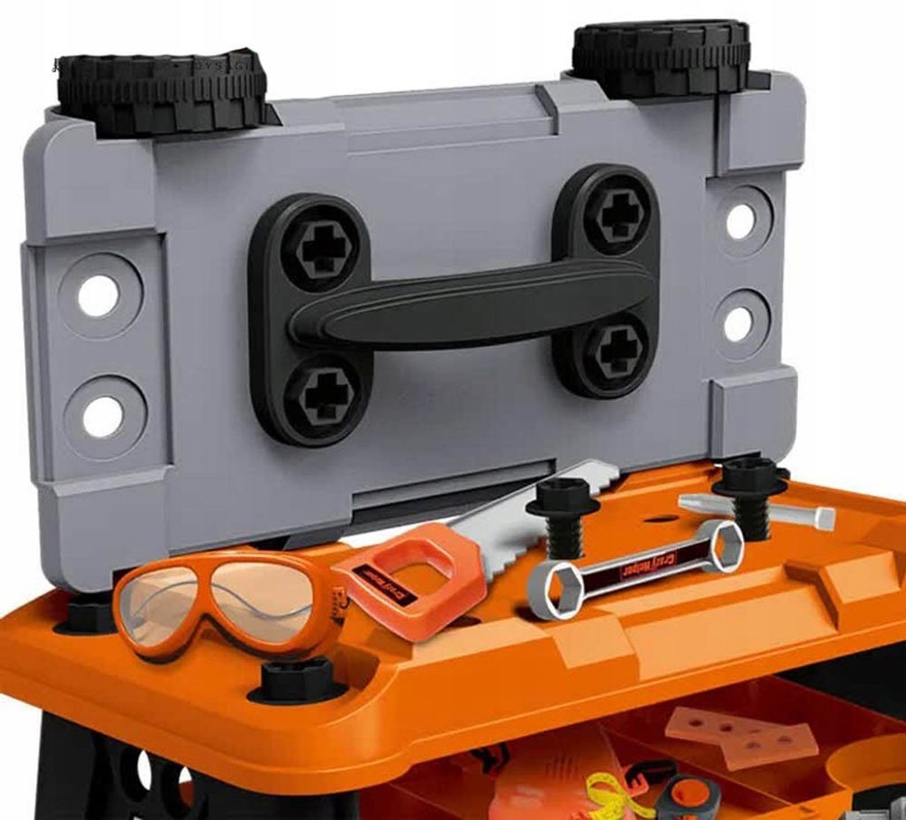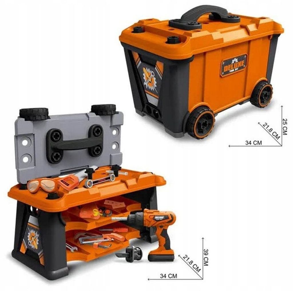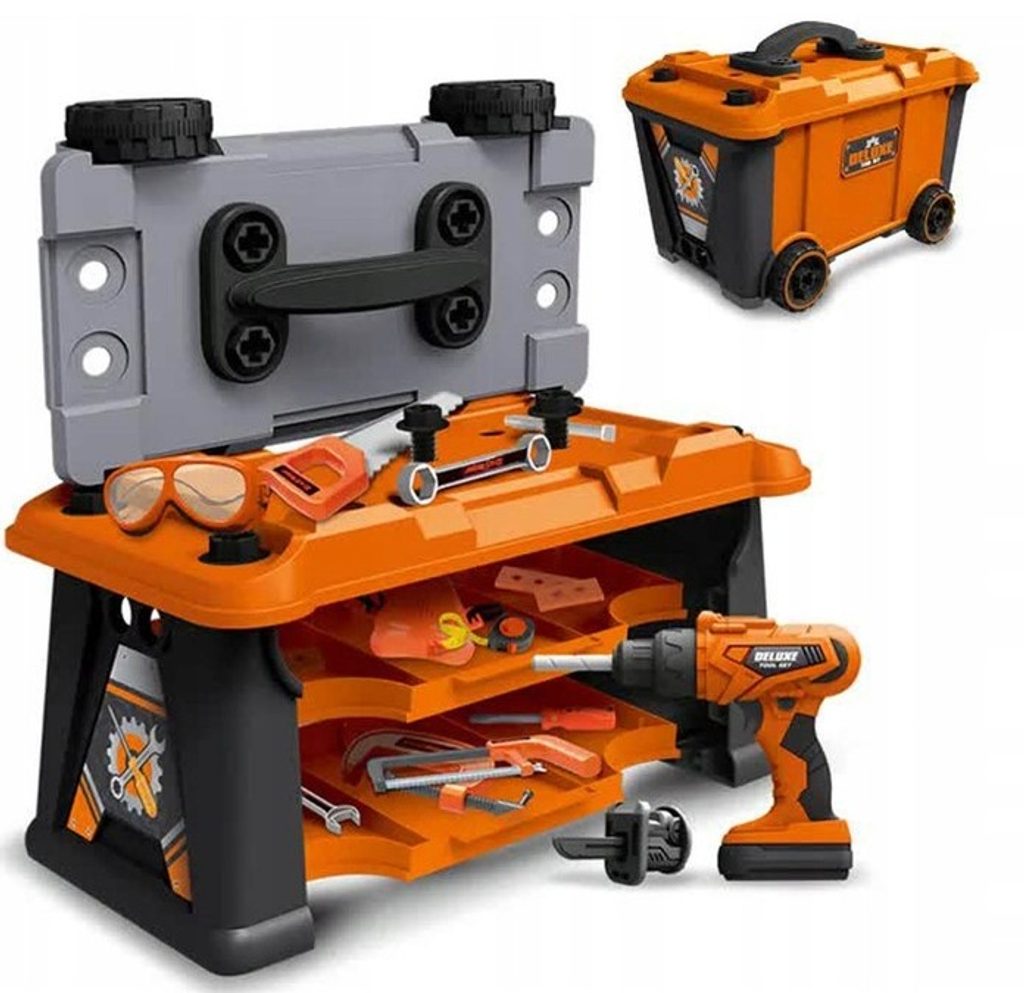 Plastová pracovní dílna v kufříku s kolečky je určena pro ty nejmenší kutily. Sada obsahuje celkem 65 součástí včetně šroubováku, metru, kladívka, klíčů, šroubků, matic a dalších konstrukčních prvků. Součástí je také vrtačka na baterie, bez které se žádný kutil neobejde. Hračka je určena pro děti od 36 měsíců věku.