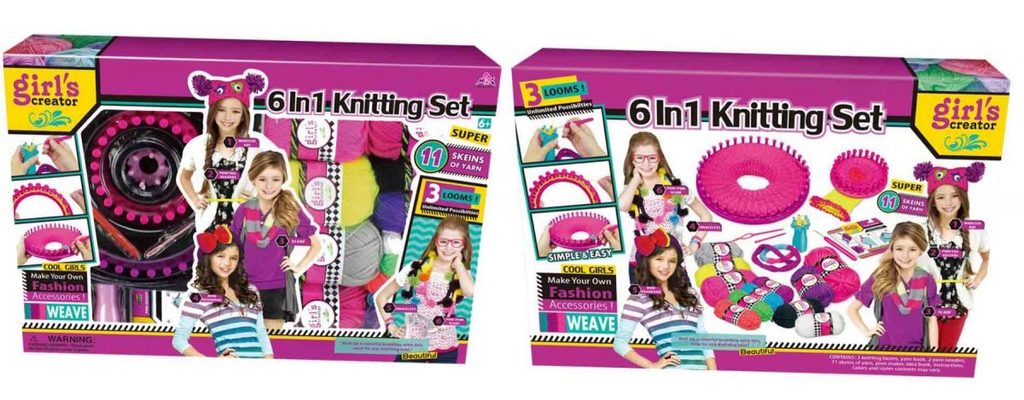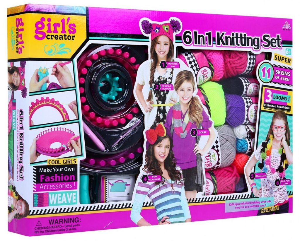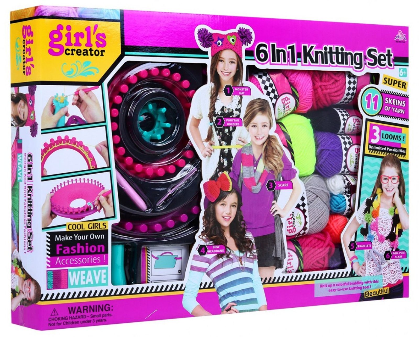 Sada na pletení pro děti Knitting Set umožní dětem uplést neskutečné množství vlastních výrobků. Mohou využít přiložené šablony a inspirovat se jimi nebo použít vlastní fantazii a uplést si šálu, čepici, mašli, náramek nebo cokoliv dalšího. Součástí sady je pletací strojek, háček na háčkování, tkalcovský stav, bezpečná vlasová jehla a 12 kusů různobarevných přízí. Hračka je vyrobená z plastu v pestrobarevném provedení a určena pro děti od 6 let.