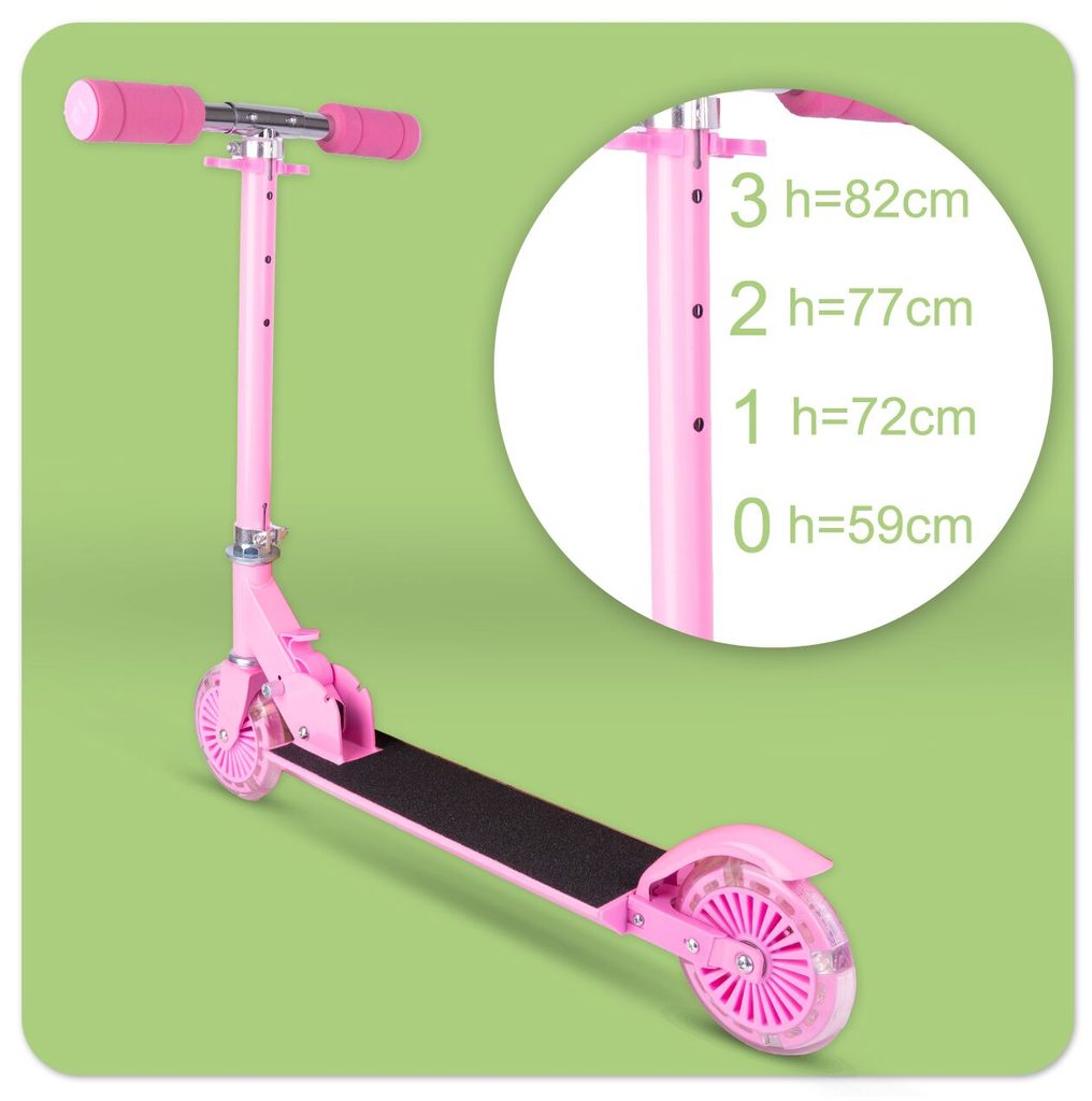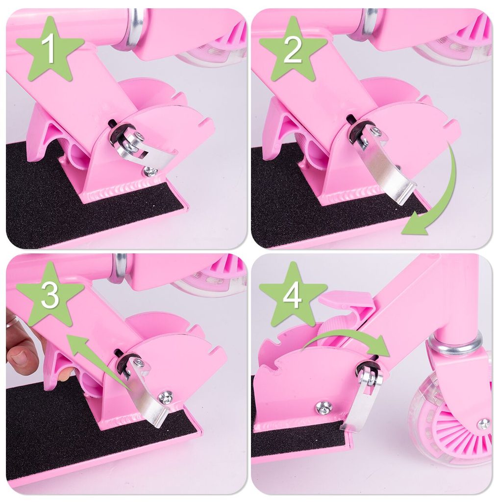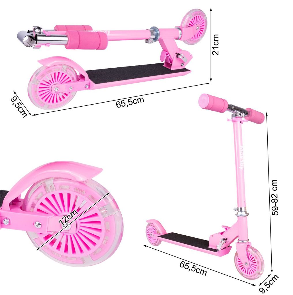 Dětská skládací koloběžka Scooter s LED svítícími koly. Je osazena tichými protiskluzovými koly s LED světly, které svítí během jízdy. Řídítka mají nastavitelnou výšku ve čtyřech polohách. V zadní části je umístěn blatník, který slouží jako nožní brzda. Koloběžka je určena pro děti od 3 let věku a 50 kg hmotnosti.