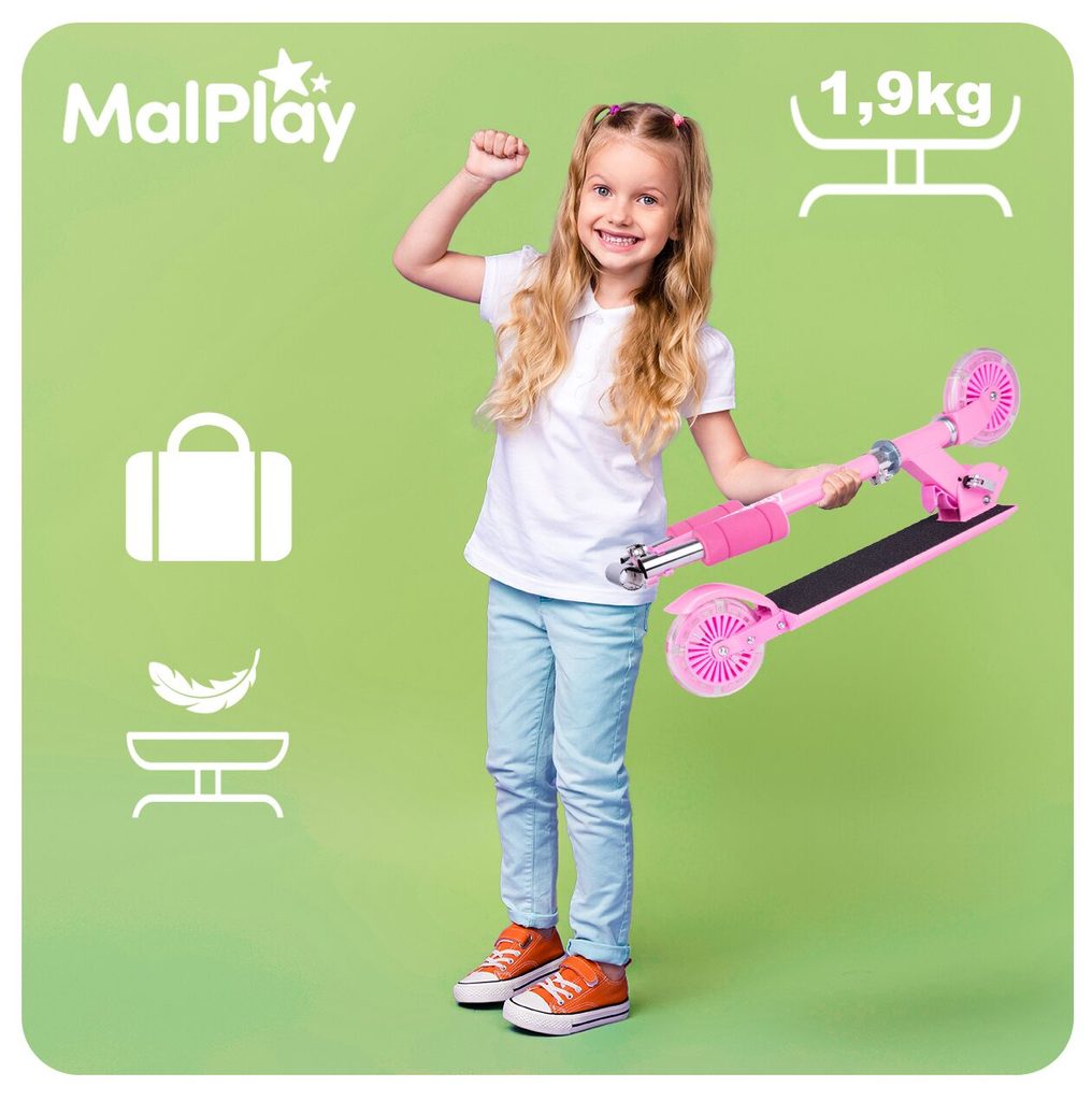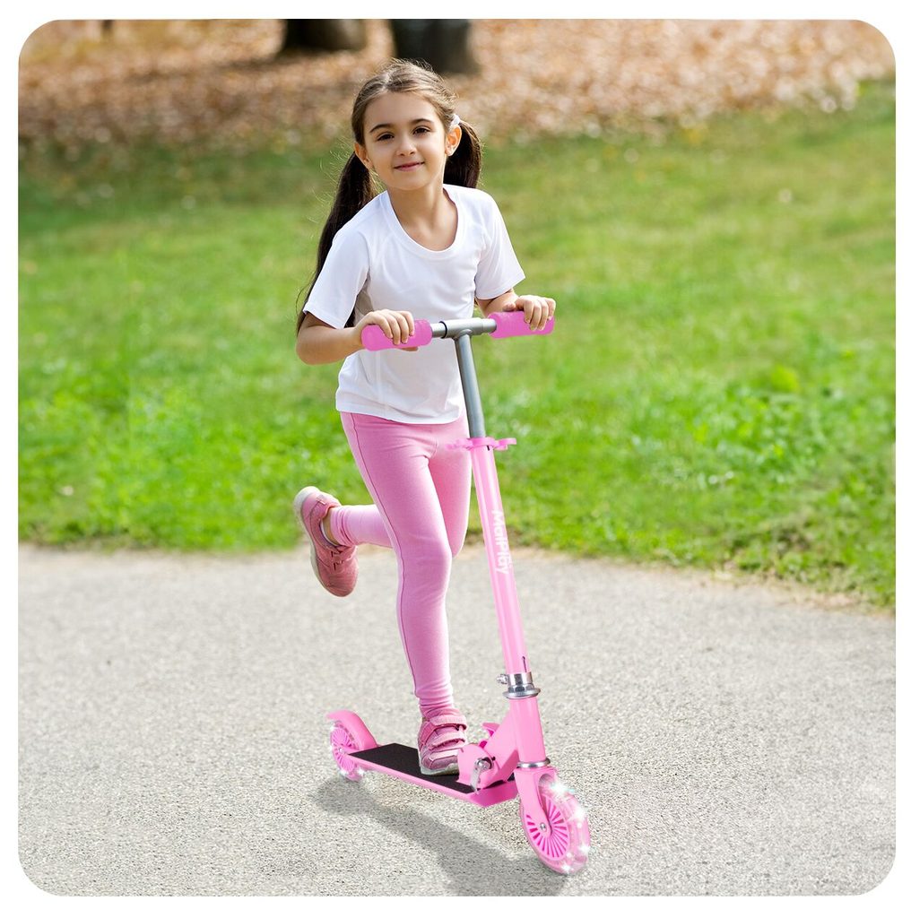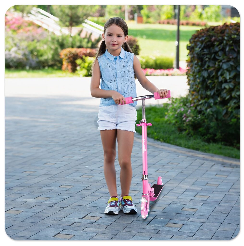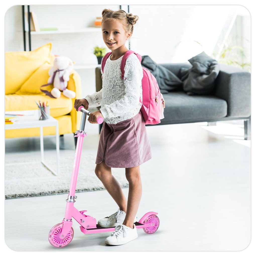 Dětská skládací koloběžka Scooter s LED svítícími koly. Je osazena tichými protiskluzovými koly s LED světly, které svítí během jízdy. Řídítka mají nastavitelnou výšku ve čtyřech polohách. V zadní části je umístěn blatník, který slouží jako nožní brzda. Koloběžka je určena pro děti od 3 let věku a 50 kg hmotnosti.