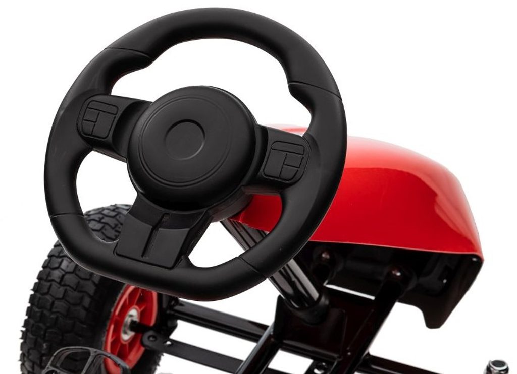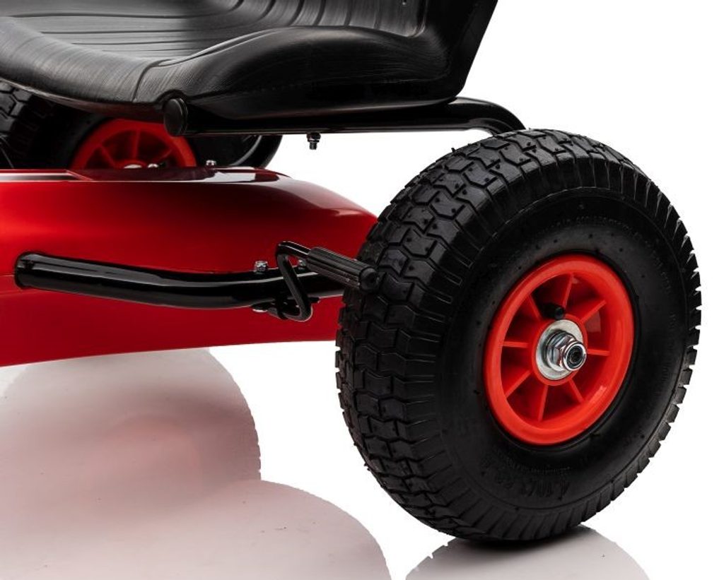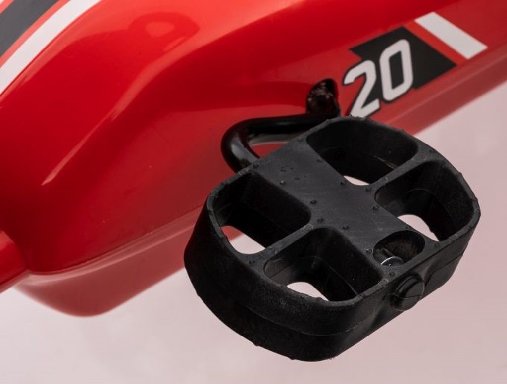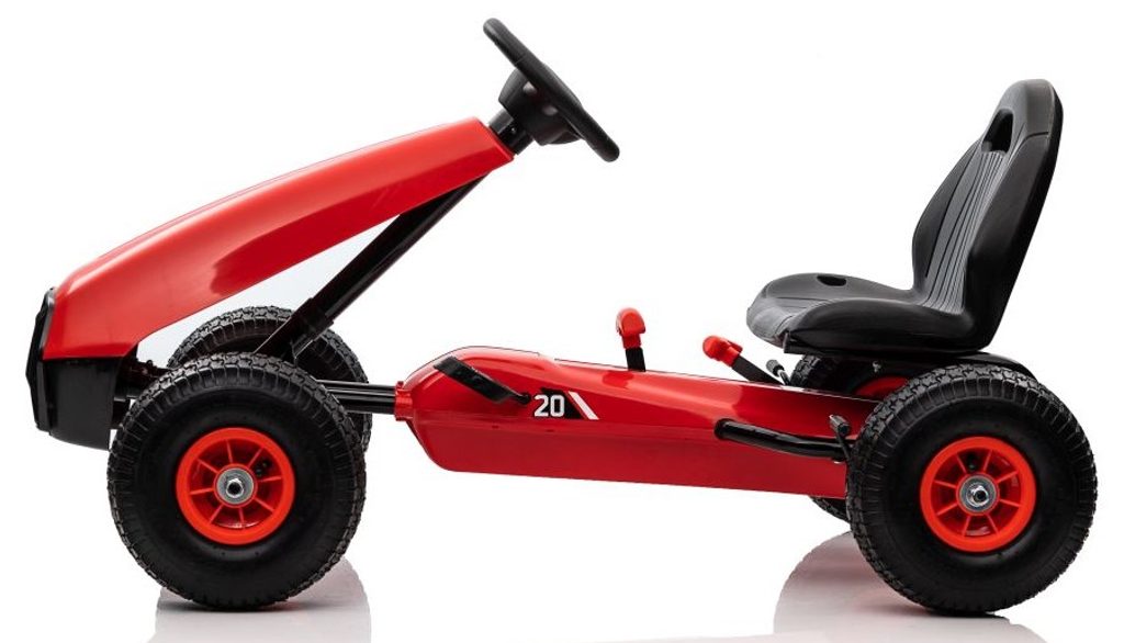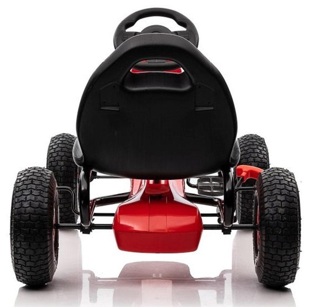 Dětská šlapací motokára Formule 208 se širokými nafukovacími koly o průměru 25 cm je určena pro děti od 3 let a hmotnosti 30 kg. Pohon zajištuje řetěz, který je zabezpečen ochranným krytem. Motokára je vybavena ruční brzdou na dvou kolech. Rám motokáry je vyroben z kvalitního kovu.