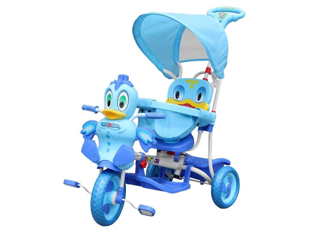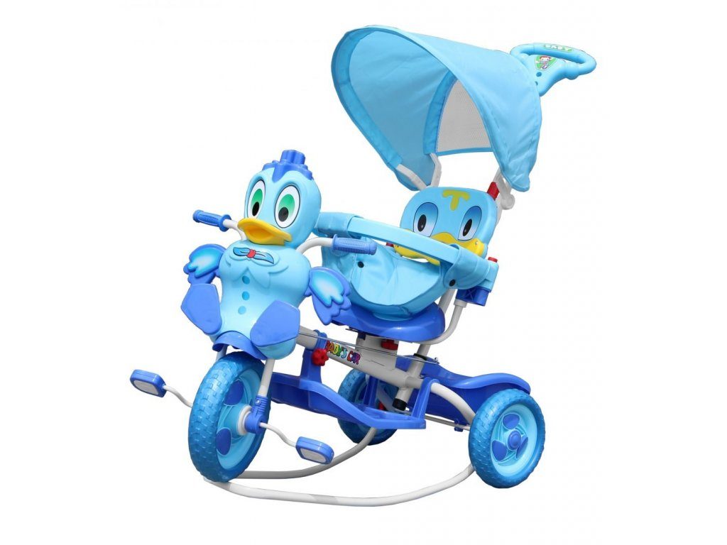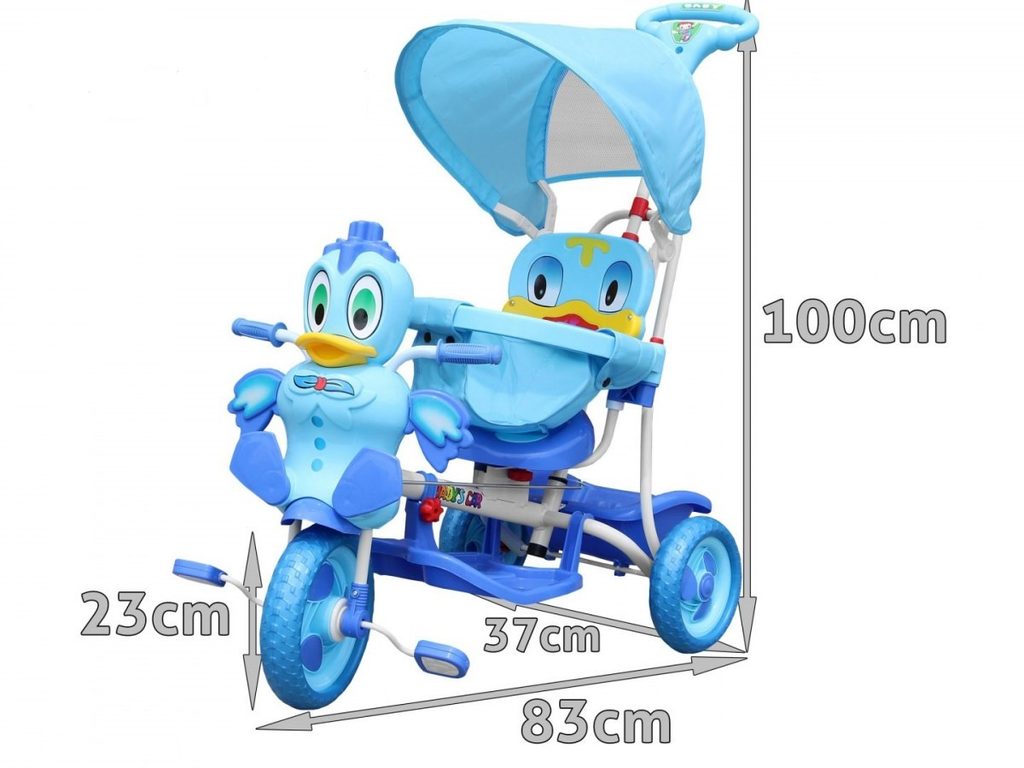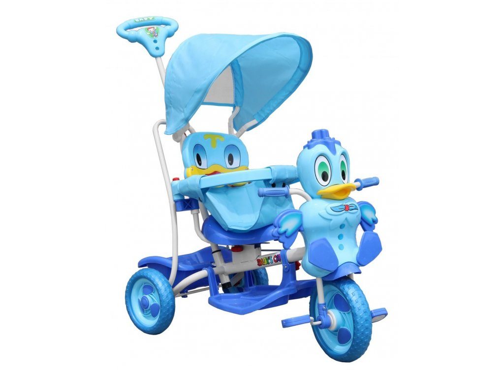 Dětská tříkolka s motivem zelené kačenky. Součástí je vodící tyč, spojená s koly takže rodič může určovat směr jízdy a zároveň tříkolku tlačit. V zadní části je umístěn košík na hračky. Skládací ochranná stříška proti slunci. Lehká konstrukce z kovu a odolného plastu. Zábavu dítěte navíc umocní tlačítko na hlavě kačenky, jehož zmáčknutím pohybuje křidélky. Vypadnutí dítěte zabraňuje bezpečnostní obruč.
