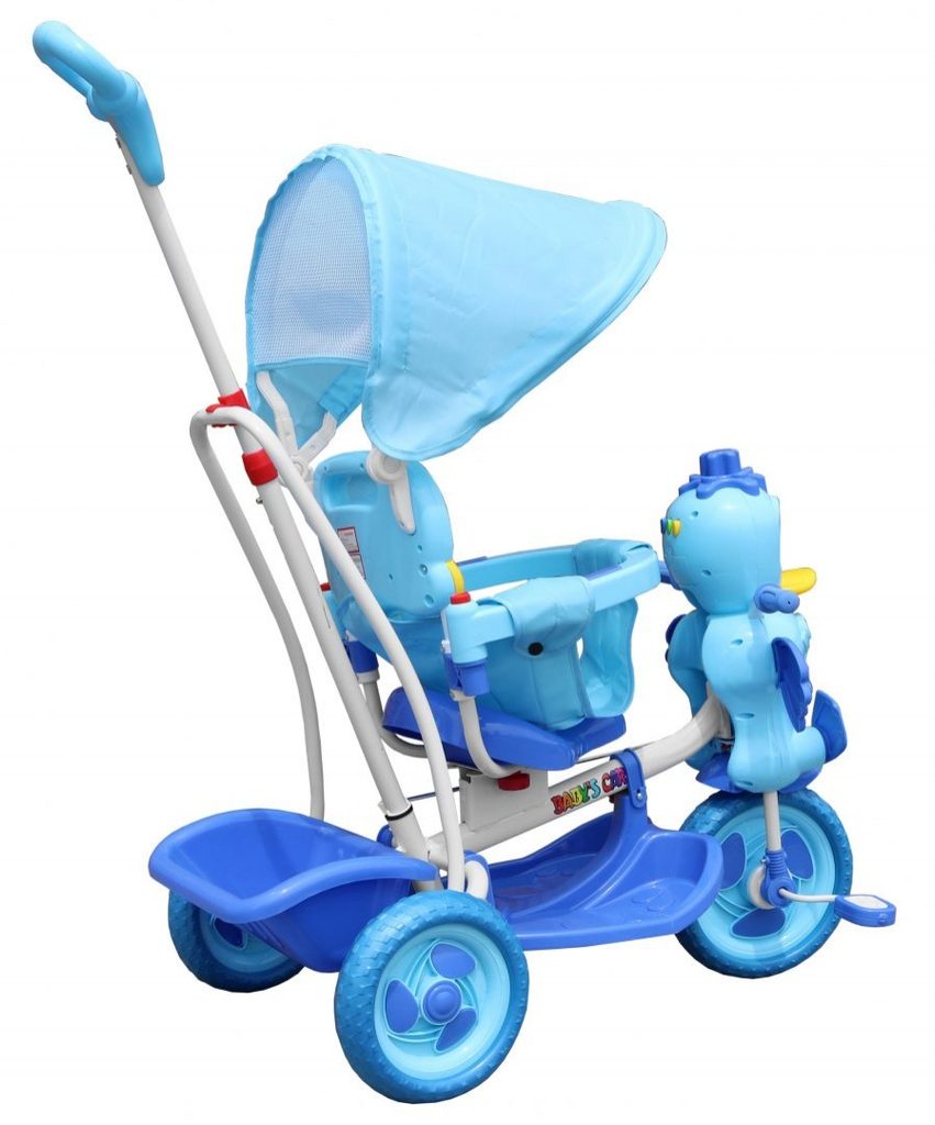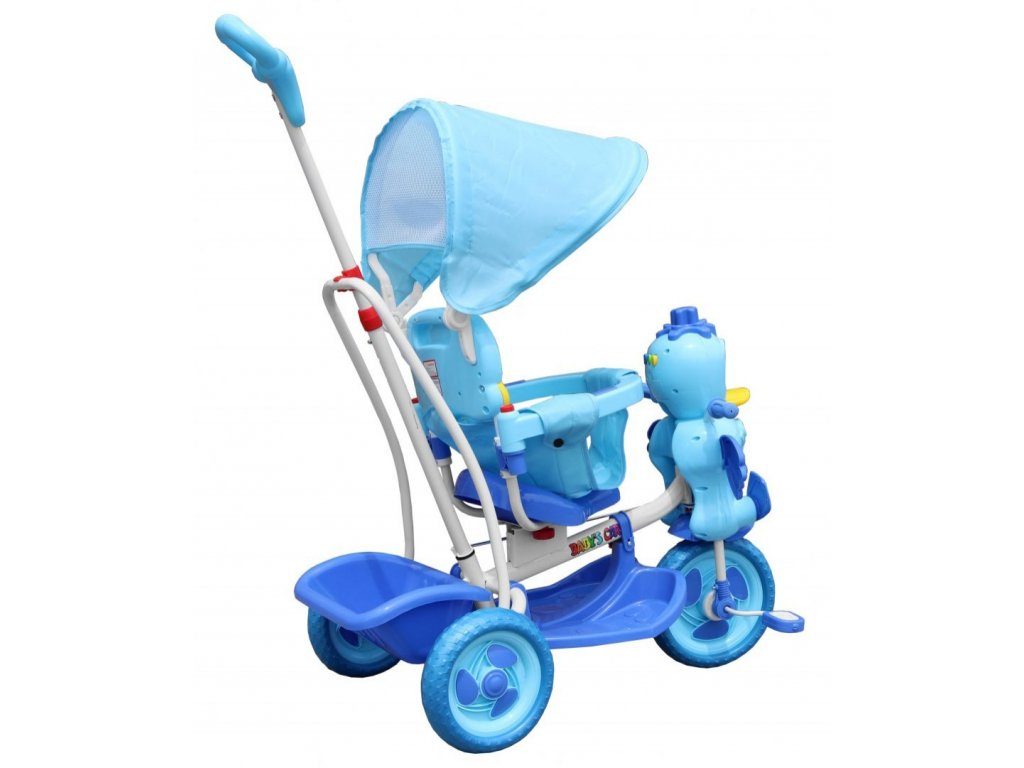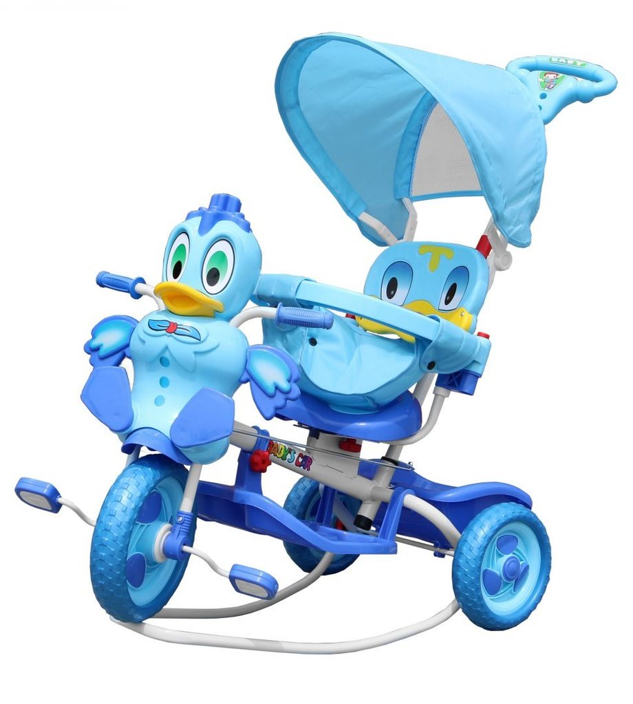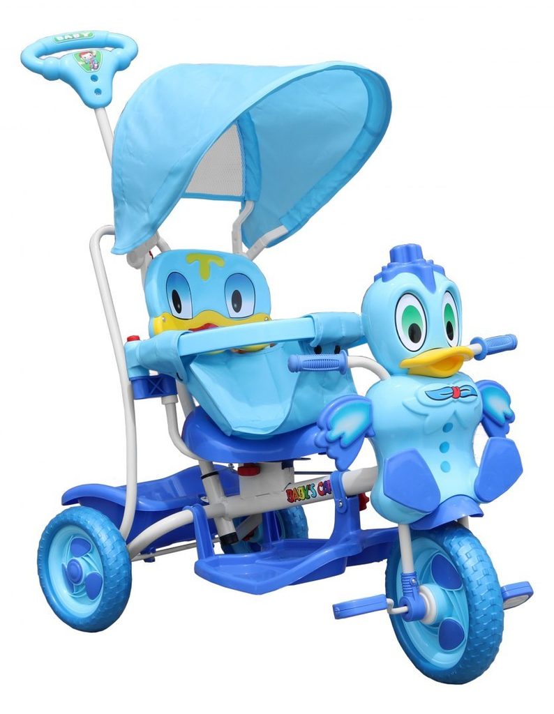 Dětská tříkolka s motivem zelené kačenky. Součástí je vodící tyč, spojená s koly takže rodič může určovat směr jízdy a zároveň tříkolku tlačit. V zadní části je umístěn košík na hračky. Skládací ochranná stříška proti slunci. Lehká konstrukce z kovu a odolného plastu. Zábavu dítěte navíc umocní tlačítko na hlavě kačenky, jehož zmáčknutím pohybuje křidélky. Vypadnutí dítěte zabraňuje bezpečnostní obruč.
