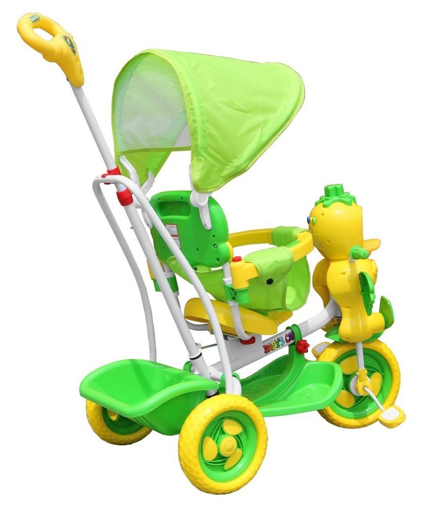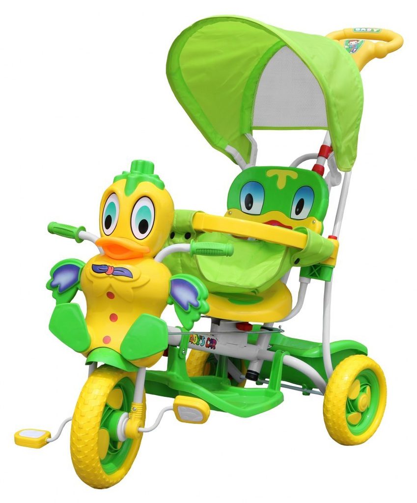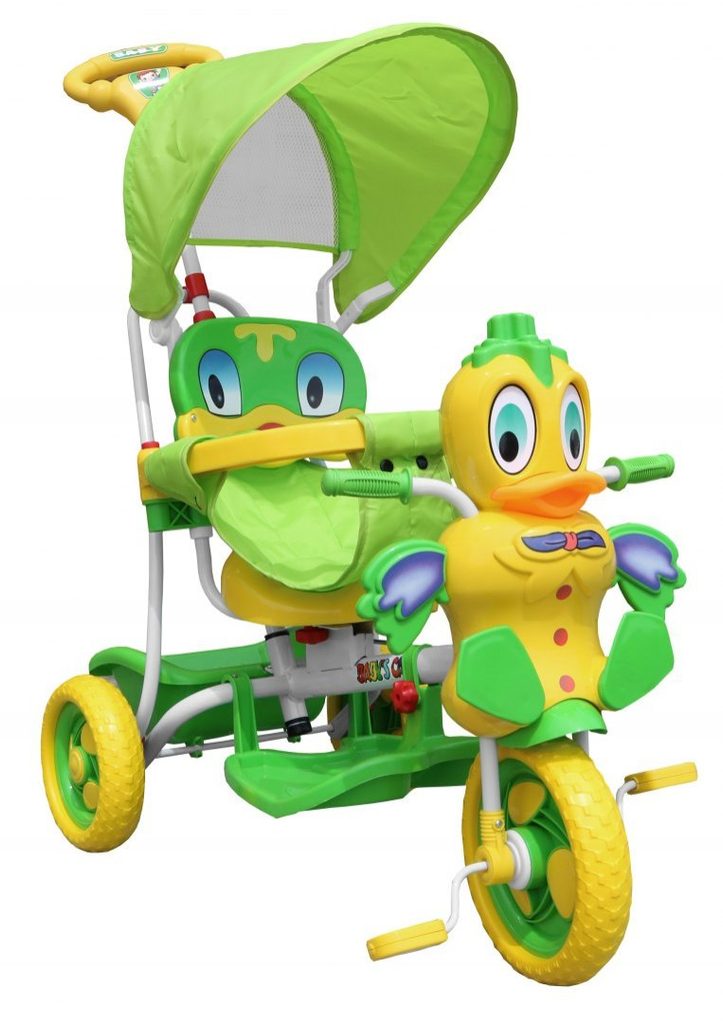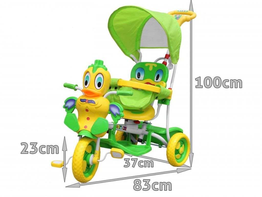 Dětská tříkolka s motivem zelené kačenky. Součástí je vodící tyč, spojená s koly takže rodič může určovat směr jízdy a zároveň tříkolku tlačit. V přední části je umístěn menší a v zadní větší košík na hračky. Skládací ochranná stříška proti slunci. Lehká konstrukce z kovu a odolného plastu. Zábavu dítěte navíc umocní tlačítko na hlavě kačenky, jehož zmáčknutím pohybuje křidélky. Vypadnutí dítěte zabraňuje bezpečnostní obruč.