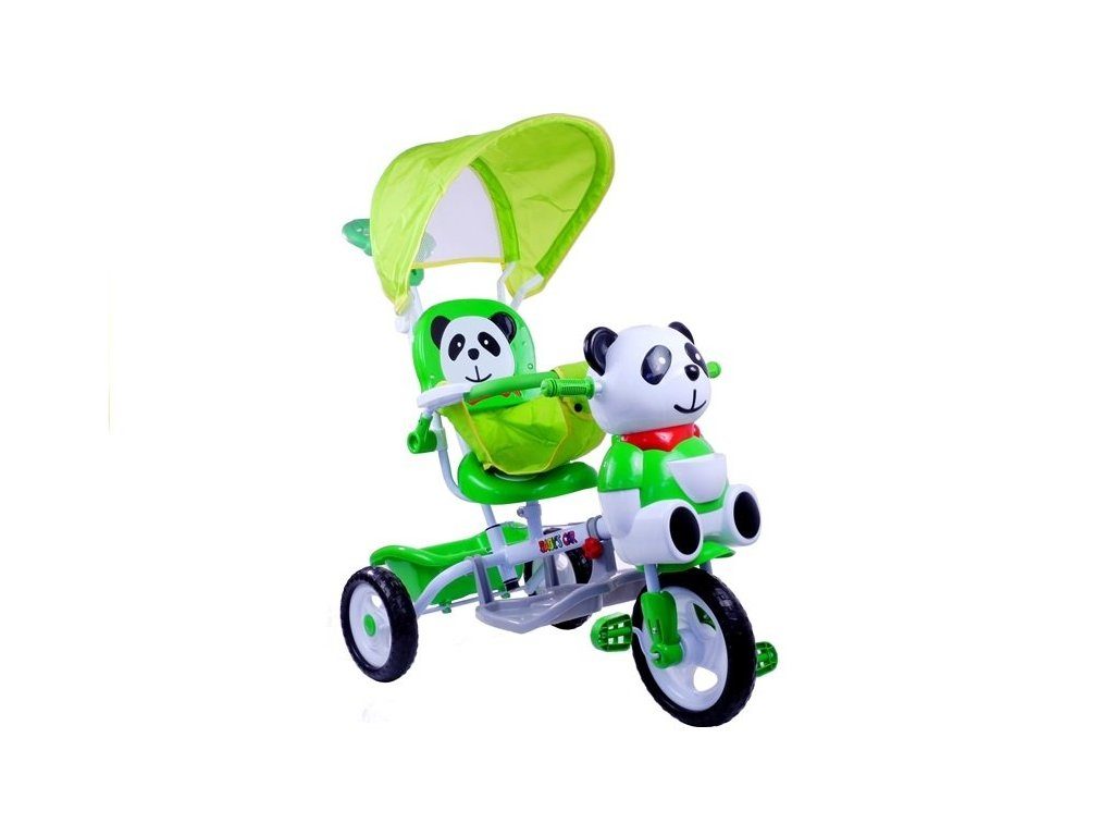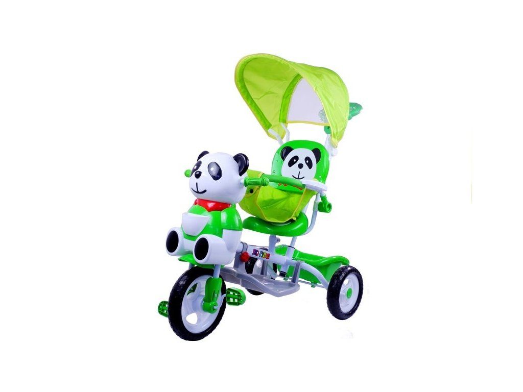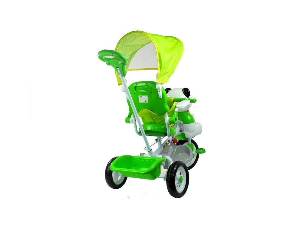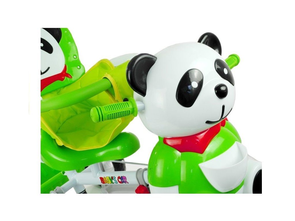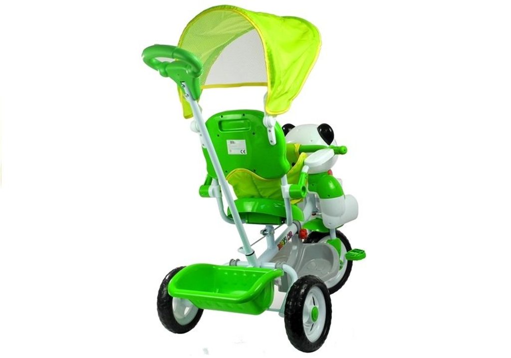 Dětská tříkolka s motivem zelené pandy. Součástí je vodící tyč, spojená s koly takže rodič může určovat směr jízdy a zároveň tříkolku tlačit. V zadní části je umístěn košík na hračky. Skládací ochranná stříška proti slunci. Lehká konstrukce z kovu a odolného plastu. Vypadnutí dítěte zabraňuje bezpečnostní obruč.