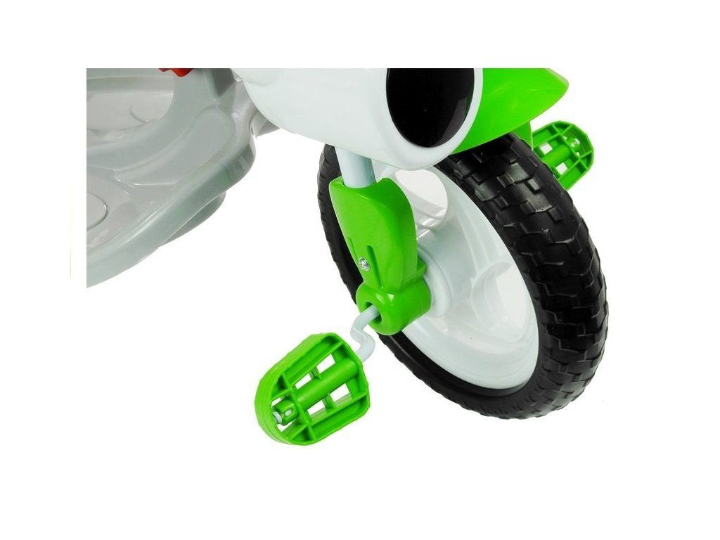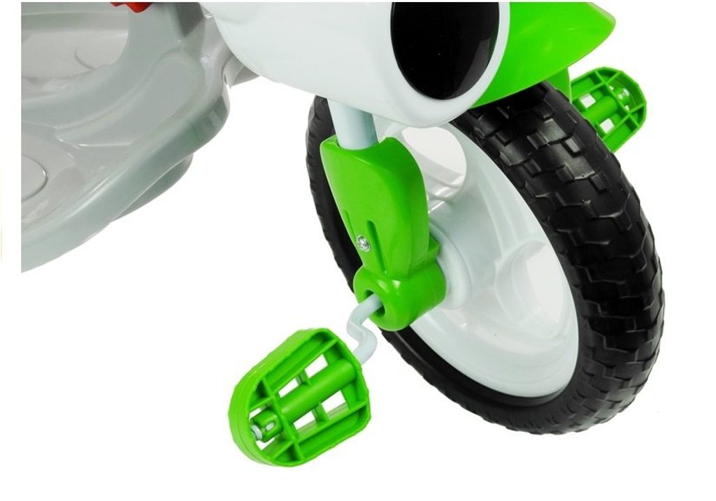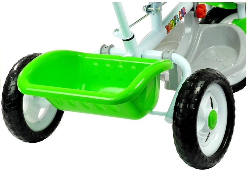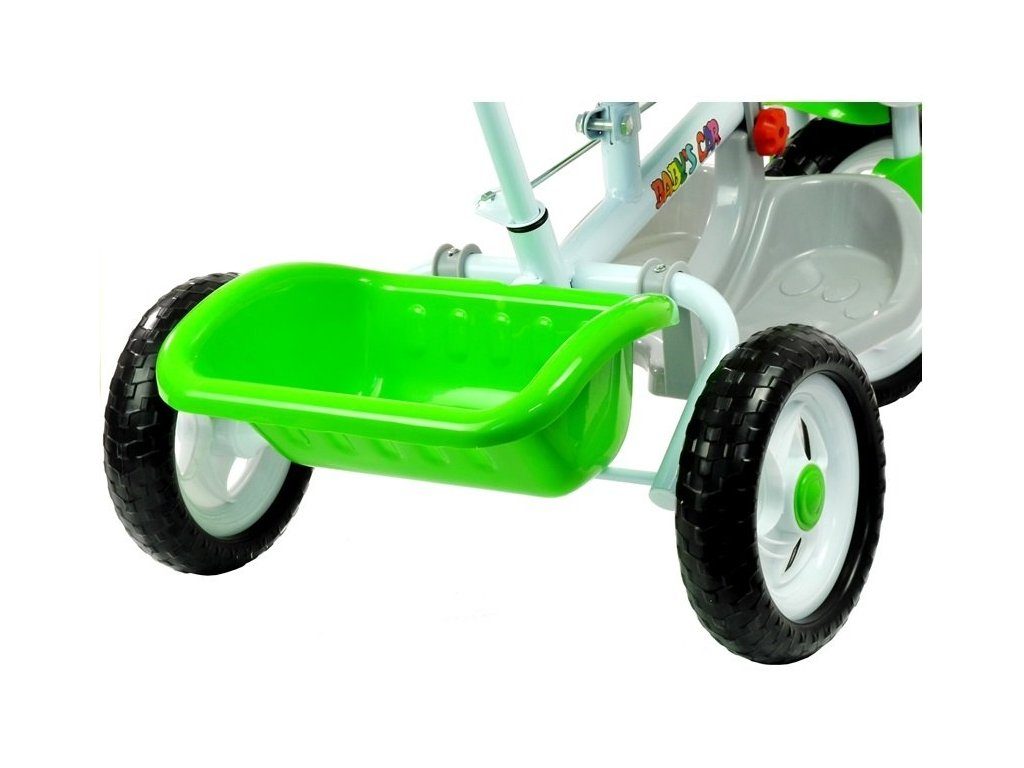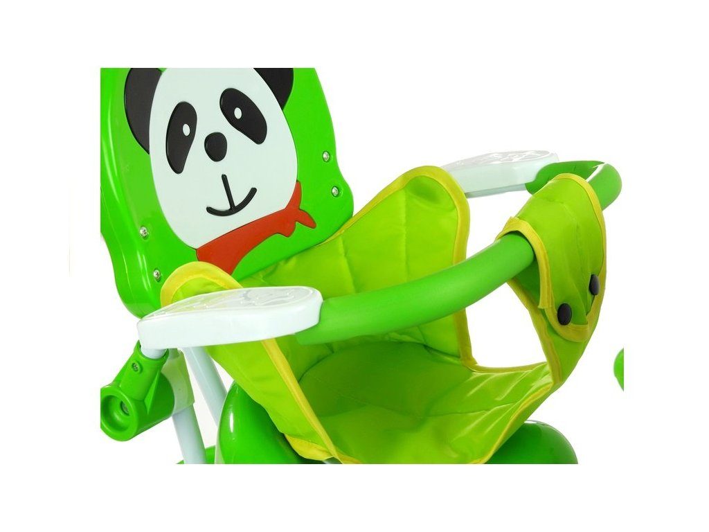 Dětská tříkolka s motivem zelené pandy. Součástí je vodící tyč, spojená s koly takže rodič může určovat směr jízdy a zároveň tříkolku tlačit. V zadní části je umístěn košík na hračky. Skládací ochranná stříška proti slunci. Lehká konstrukce z kovu a odolného plastu. Vypadnutí dítěte zabraňuje bezpečnostní obruč.