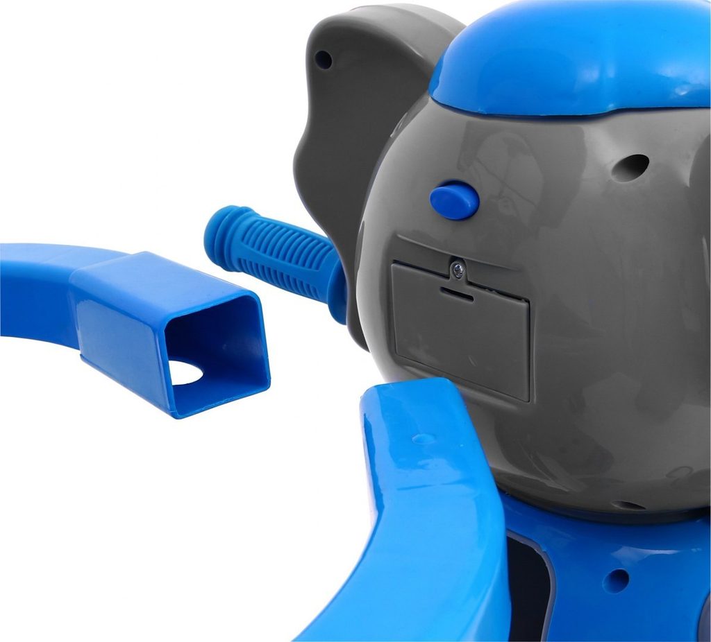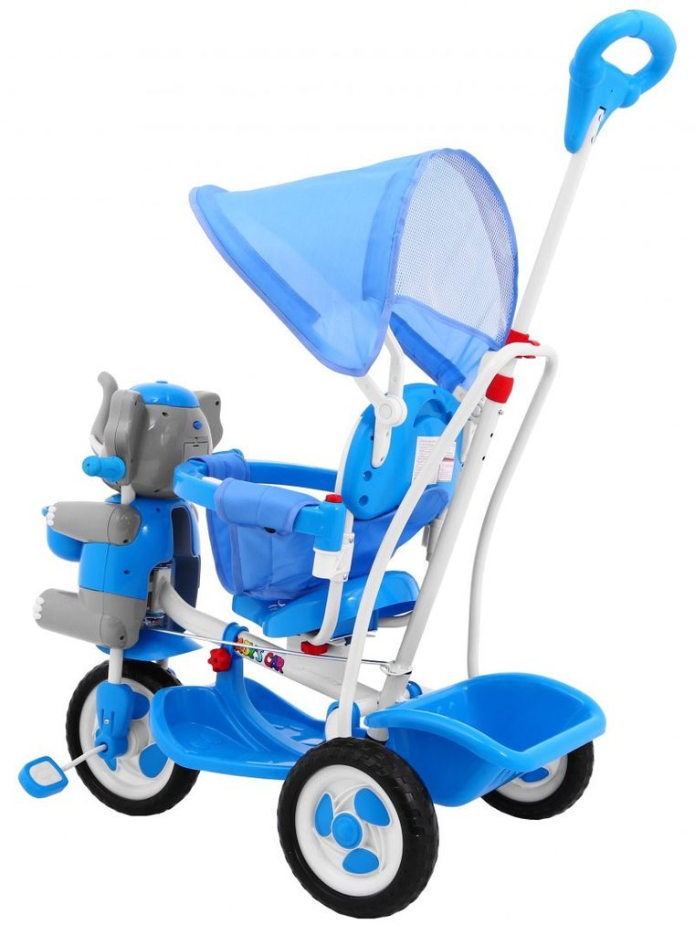 Dětská tříkolka s motivem Slona lze využít i jako kolébku. Součástí je vodící tyč, spojená s koly takže rodič může určovat směr jízdy a zároveň tříkolku tlačit. V zadní části je umístěn košík na hračky. Skládací ochranná stříška proti slunci. Lehká konstrukce z kovu a odolného plastu. Zábavu dítěte navíc umocní tlačítko na hlavě slona, které spouští veselou melodii. Vypadnutí dítěte zabraňuje bezpečnostní obruč.