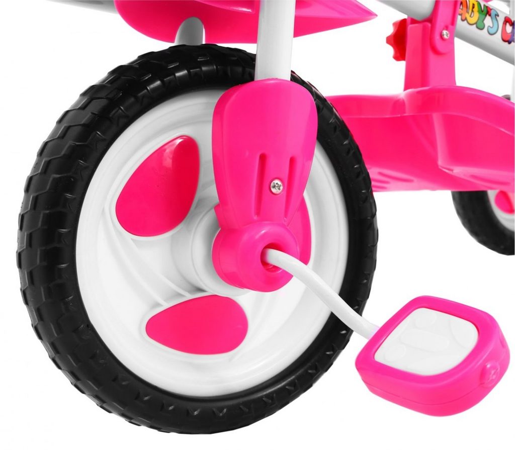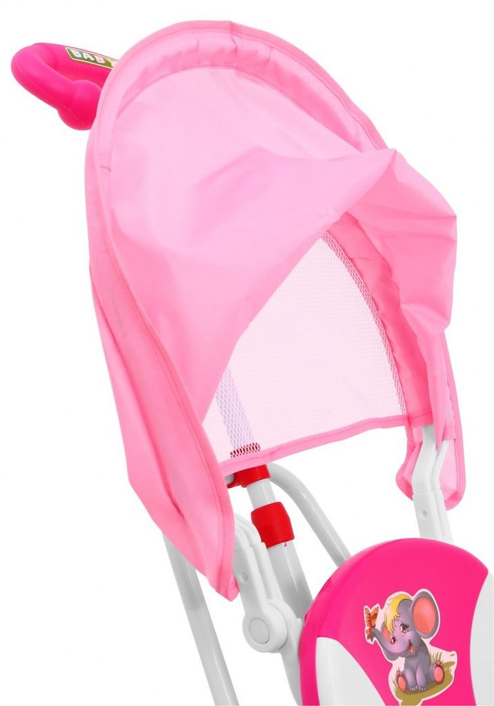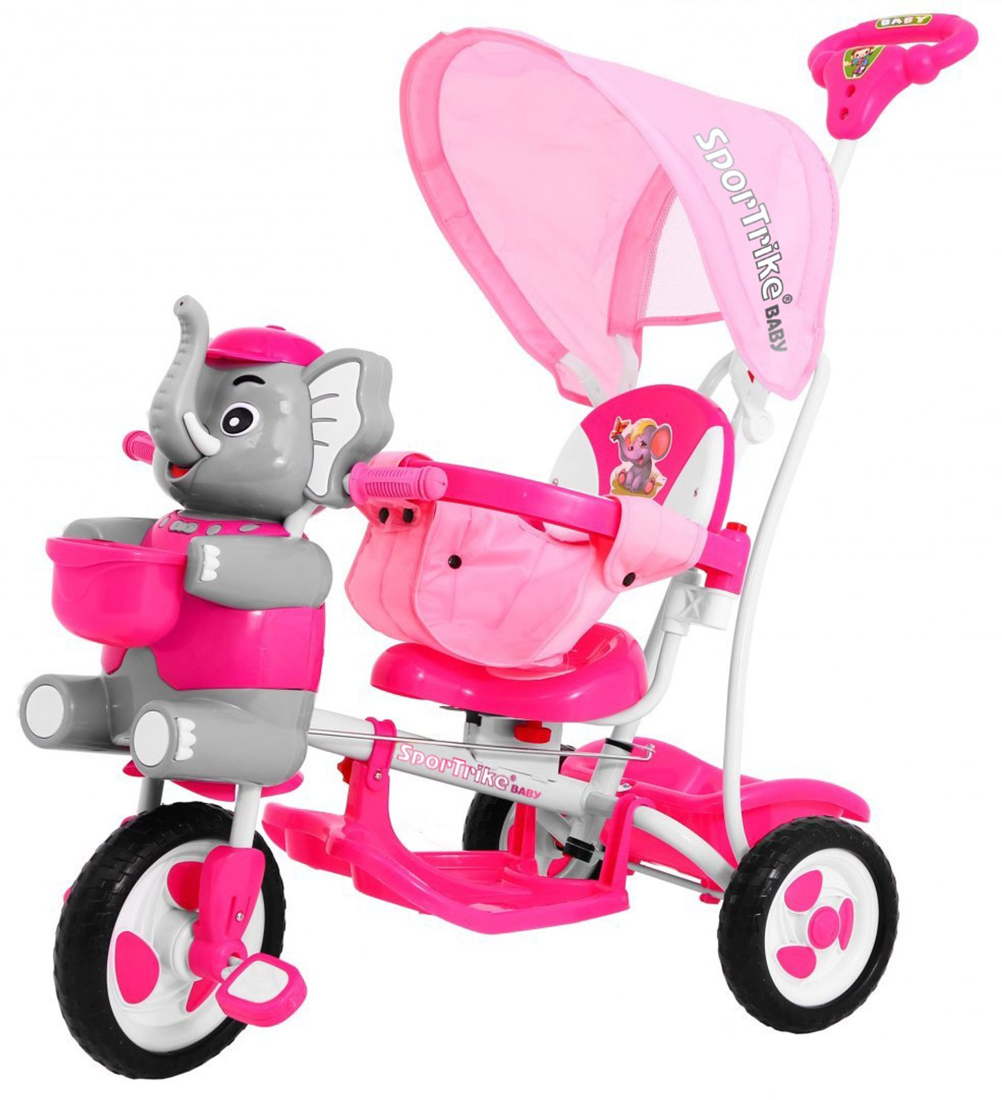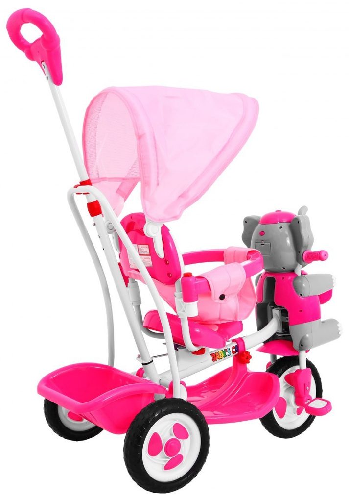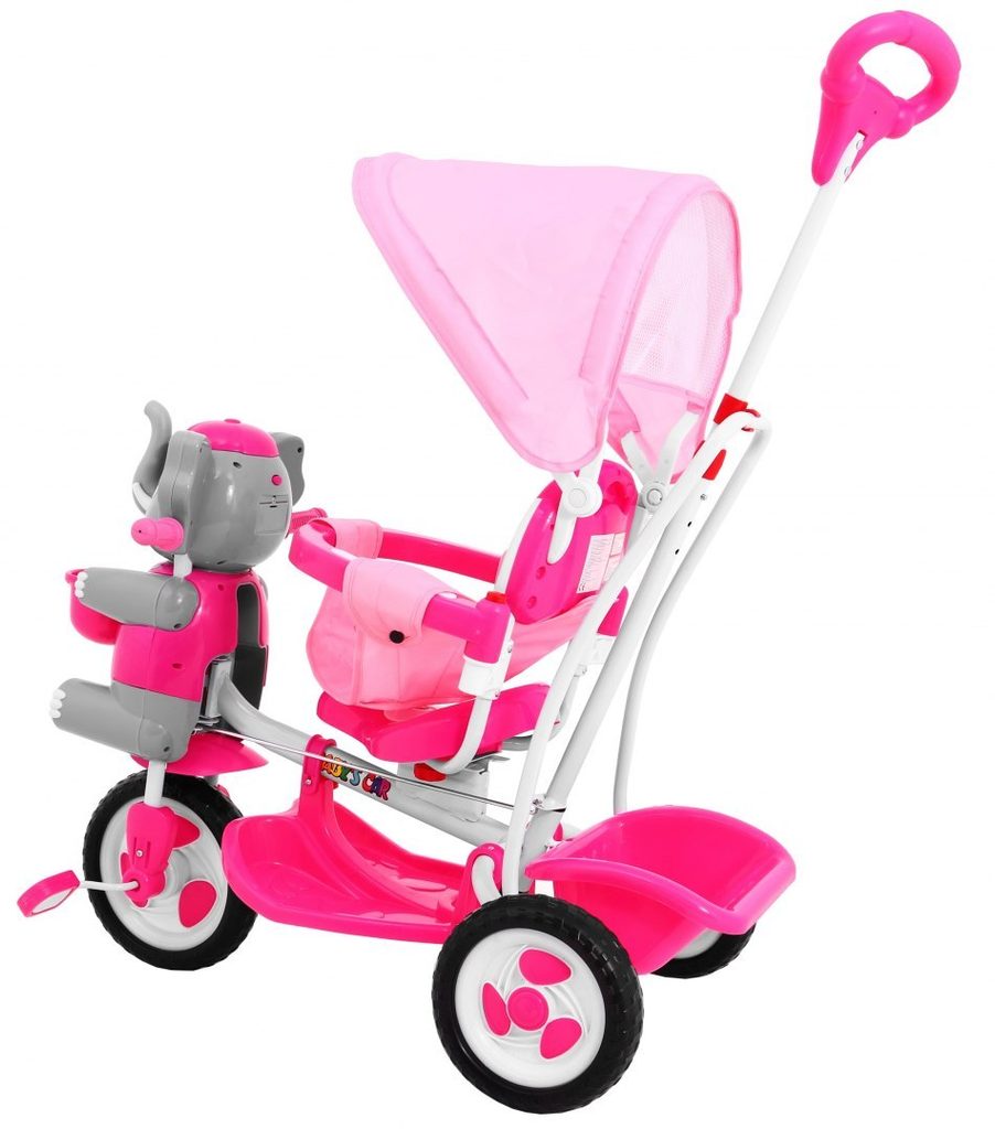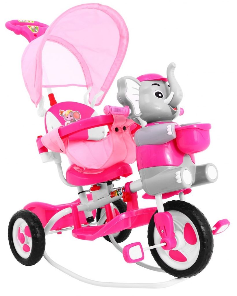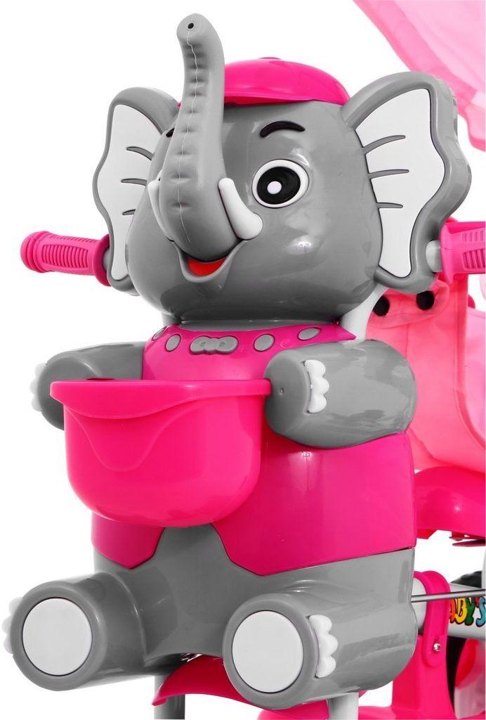 Dětská tříkolka s motivem Slona lze využít i jako kolébku. Součástí je vodící tyč, spojená s koly takže rodič může určovat směr jízdy a zároveň tříkolku tlačit. V zadní části je umístěn košík na hračky. Skládací ochranná stříška proti slunci. Lehká konstrukce z kovu a odolného plastu. Zábavu dítěte navíc umocní tlačítko na hlavě slona, které spouští veselou melodii. Vypadnutí dítěte zabraňuje bezpečnostní obruč.