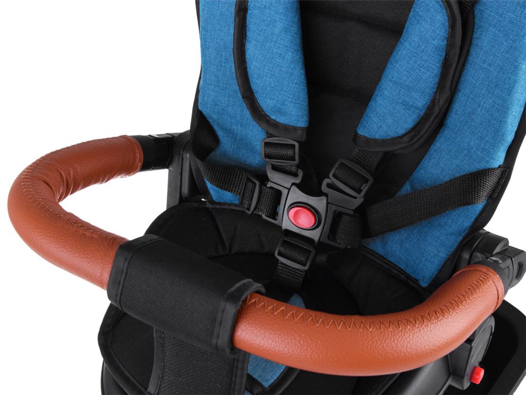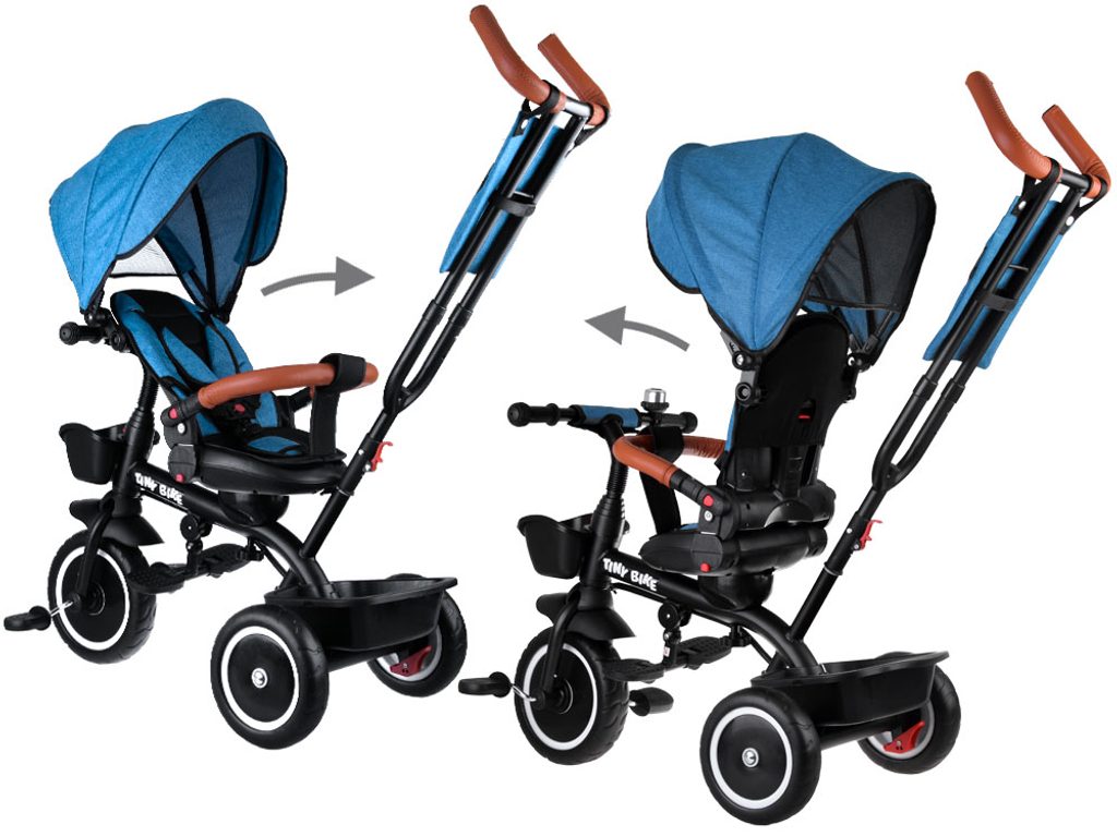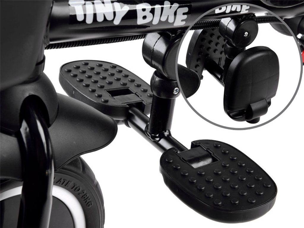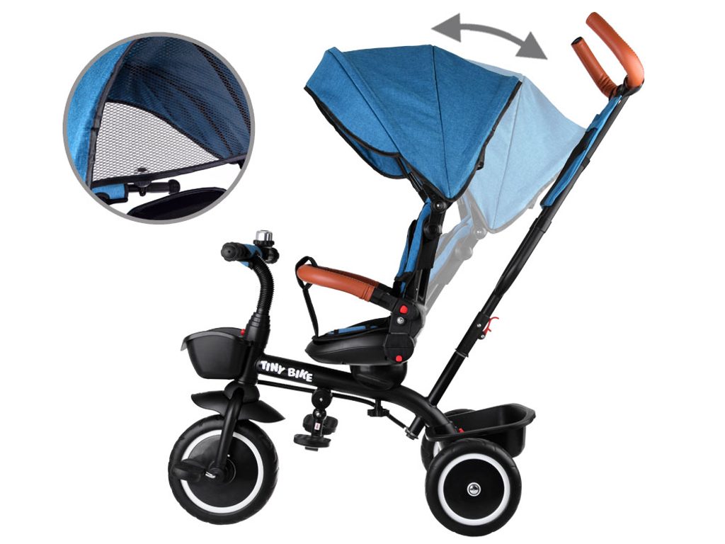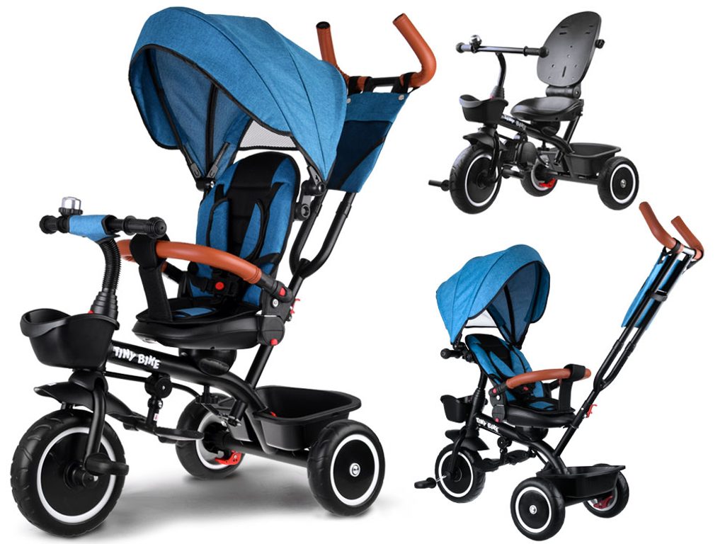 Dětská tříkolka Tiny Bike 3v1 s otočným sedadlem. Je určena pro děti od 6 měsíců do 5 let. Vybavena praktickou odnímatelnou stříškou proti slunci a dešti. V zadní části je umístěn velký koš na hračky, v přední části potom menší košík. Tříkolka má pevnou ocelovou konstrukci a odolná kola z pěnového plastu usazená v pevných plastových ráfcích. Madlo a 5bodový bezpečnostní pás zabraňují vypadnutí dítěte z kočárku. Na řídítkách je umístěný zvoneček. Pro větší bezpečnost mohou tříkolku řídit i rodiče a zadní kola mají 2 nezávislé brzdy. Sedadlo lze otočit o 360° a to ve směru jízdy nebo čelem k rodiči a navíc usnadní nastupování nejmladším dětem.