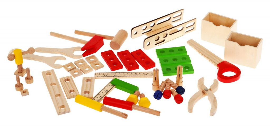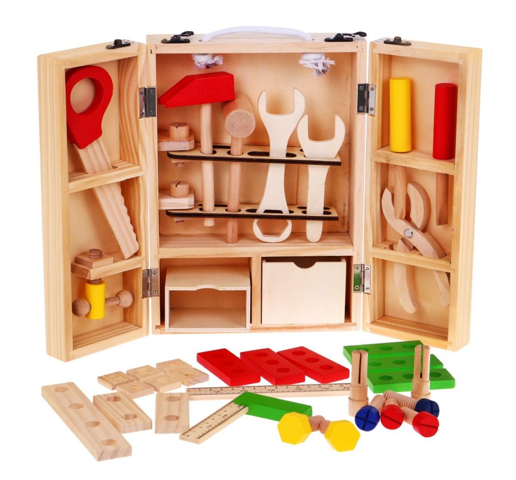 Sada dřevěného nářadí pro nejmenší kutily Wooden Toolbox. Sada obsahuje několik druhů nářadí jako je pilka, kladívko, klíč, šroubováky, pravítko a další. Vše doplňují konstrukční prvky se šrouby. Vše je uloženo v praktické dřevěné skříňce s horním úchytem pro snadné přenášení. Dítě tak může vše nosit sebou. Hračka je určena pro děti od 36 měsíců věku.