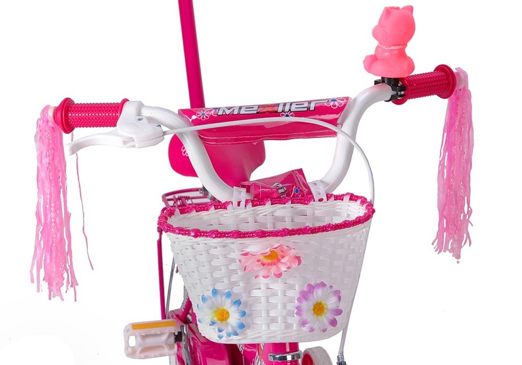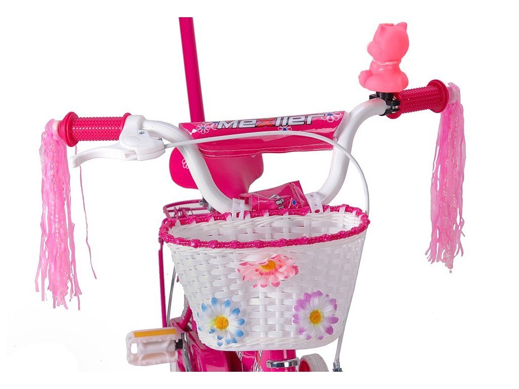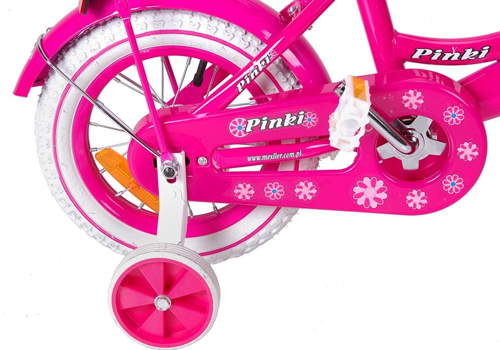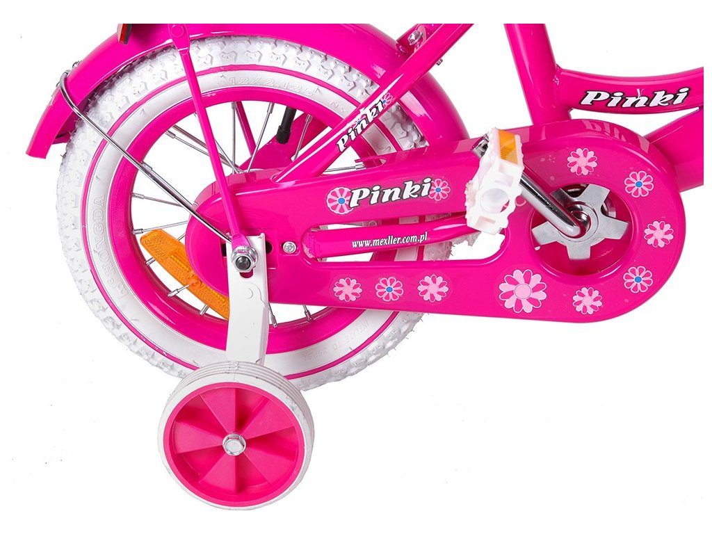 Dětské kolo Mexller Pinky s velikostí ráfků 12 palců je určeno pro nejmenší děti ve věku od 2 do 4 let s výškou do 105 cm. Kolo je opatřeno demontovatelnými balančními kolečky, dítě se tedy bude cítit hned od první jízdy bezpečně a stabilně. Kolo je vybaveno 2 druhy brzd. Brždění probíhá buď protisměrnou zadní brzdou "torpédem",která možnuje brzdit zpětným záběrem pedálů nebo lze použít přední pákovou brzdu. Proti nechtěnému namotání nohavice nebo tkaničky do řetězu má kolo kryt, který zakrývá celý řetěz. Sedadlo i řídítka jsou výškově nastavitelné. Na řídítkách je umístěn pletený košík.