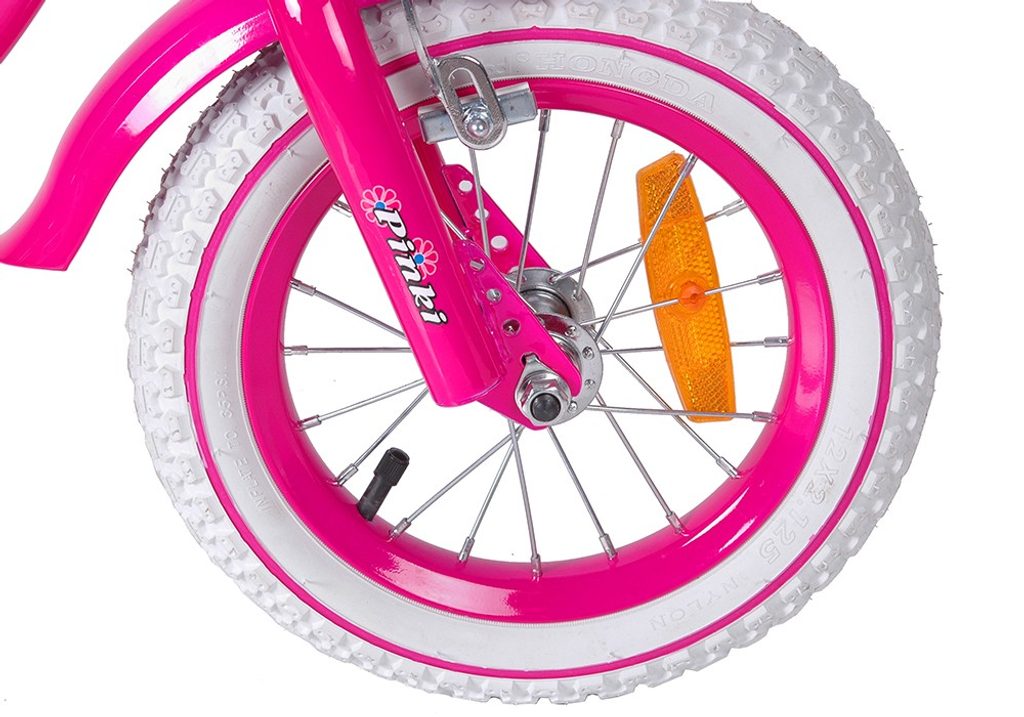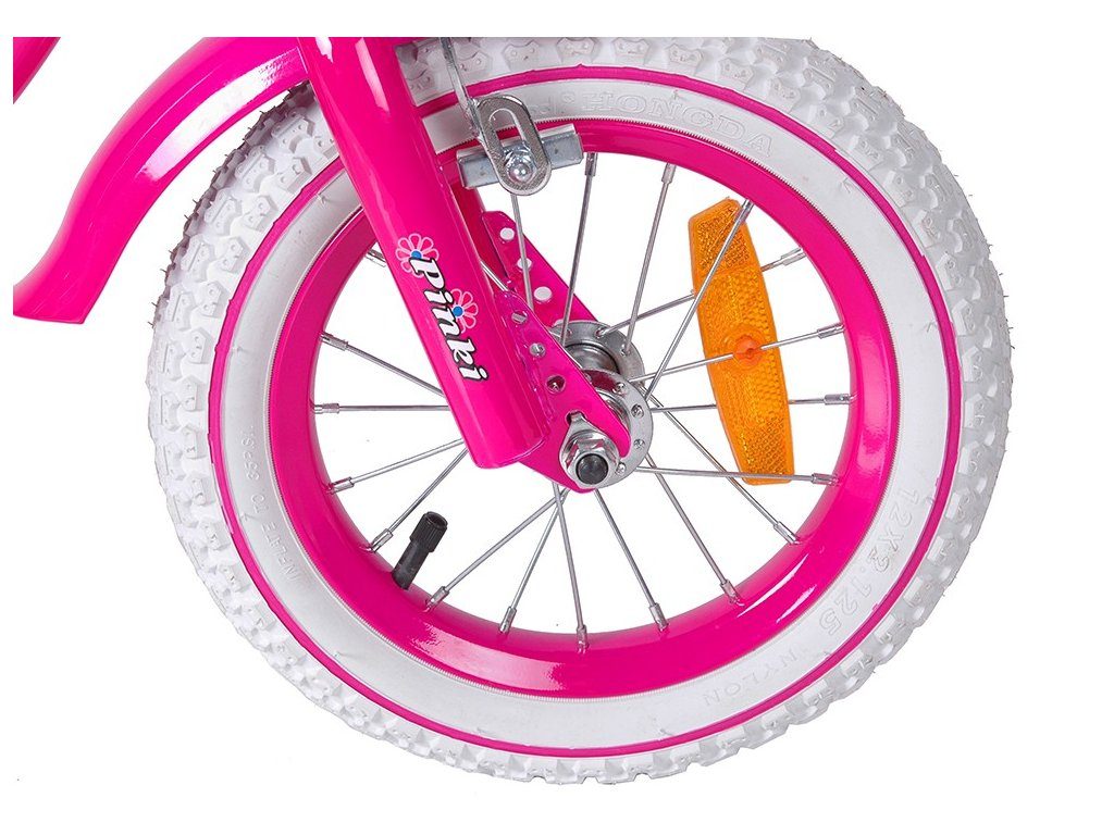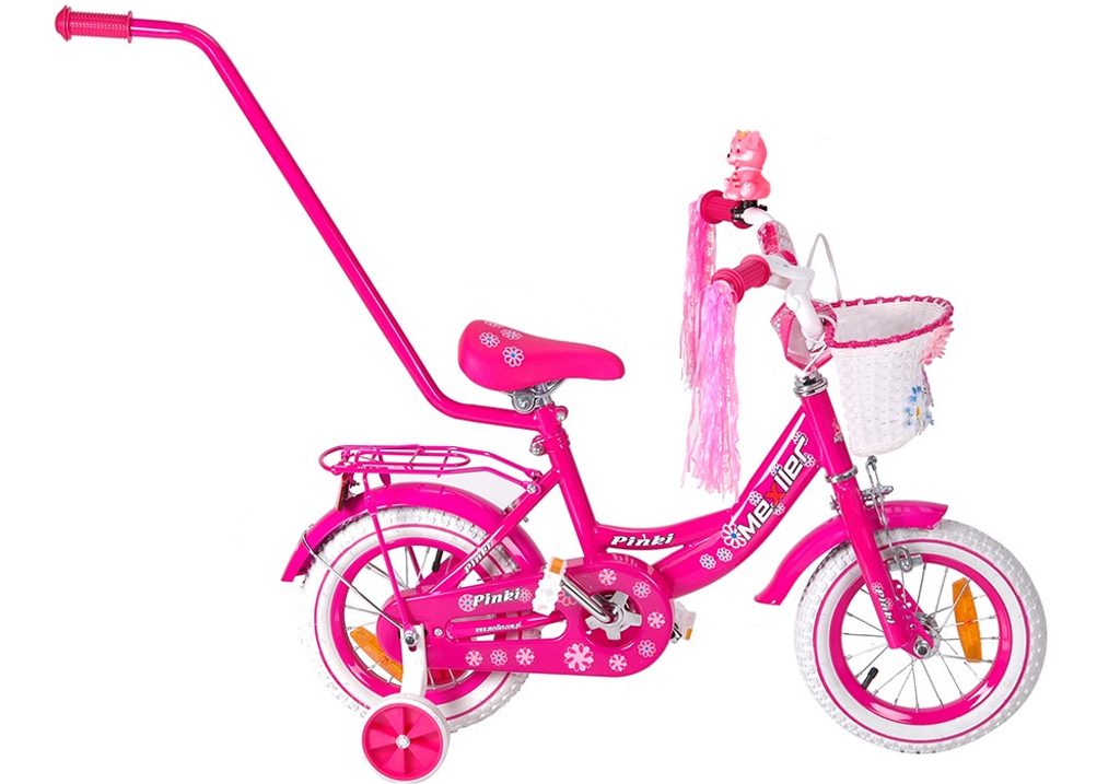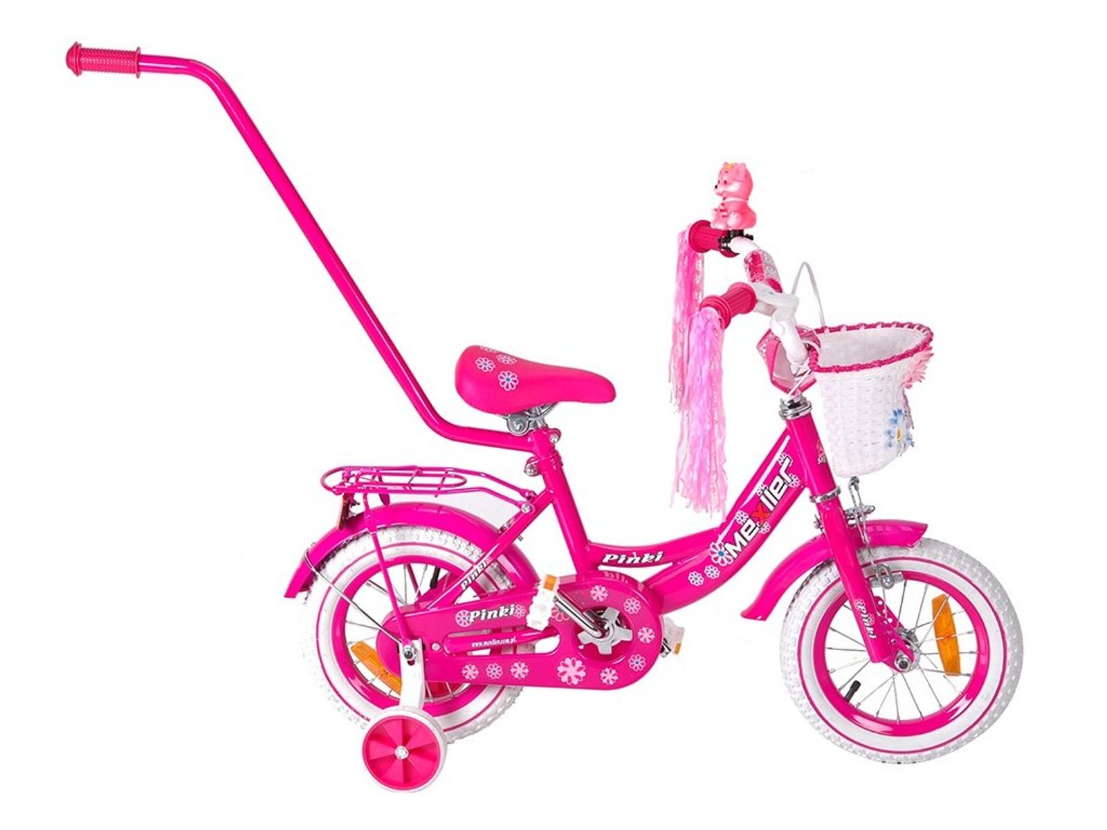 Dětské kolo Mexller Pinky s velikostí ráfků 12 palců je určeno pro nejmenší děti ve věku od 2 do 4 let s výškou do 105 cm. Kolo je opatřeno demontovatelnými balančními kolečky, dítě se tedy bude cítit hned od první jízdy bezpečně a stabilně. Kolo je vybaveno 2 druhy brzd. Brždění probíhá buď protisměrnou zadní brzdou "torpédem",která možnuje brzdit zpětným záběrem pedálů nebo lze použít přední pákovou brzdu. Proti nechtěnému namotání nohavice nebo tkaničky do řetězu má kolo kryt, který zakrývá celý řetěz. Sedadlo i řídítka jsou výškově nastavitelné. Na řídítkách je umístěn pletený košík.