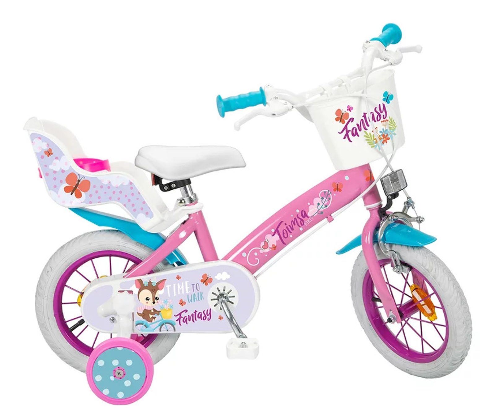 Originální dětské kolo od španělského výrobce Toimsa Fantasy Walk s velikostí ráfků 12 palců je určeno pro nejmenší děti ve věku od 3 do 4,5 let s výškou do 95 cm. Kolo je opatřeno demontovatelnými balančními kolečky, dítě se tedy bude cítit hned od první jízdy bezpečně a stabilně. Kolo je vybaveno 2 druhy brzd. Brždění probíhá buď zadní bubnovou brzdou nebo lze použít přední pákovou brzdu. Obě brzdy se ovládají pomocí páček umístěných na řídítkách. Proti nechtěnému namotání nohavice nebo tkaničky do řetězu má kolo kryt s barevným potiskem, který zakrývá celý řetěz. Sedadlo i řídítka jsou výškově nastavitelné. Za sedadlem je umístěný nosič na panenku.