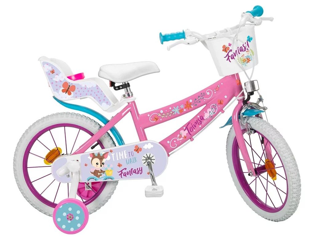 Originální dětské kolo od španělského výrobce Toimsa Fantasy Walk s velikostí ráfků 16 palců je určeno pro děti ve věku od 4 do 6 let s výškou do 105 cm. Kolo je opatřeno demontovatelnými balančními kolečky, dítě se tedy bude cítit hned od první jízdy bezpečně a stabilně. Kolo je vybaveno 2 druhy brzd. Brždění probíhá buď zadní bubnovou brzdou nebo lze použít přední pákovou brzdu. Obě brzdy se ovládají pomocí páček umístěných na řídítkách. Proti nechtěnému namotání nohavice nebo tkaničky do řetězu má kolo kryt s barevným potiskem, který zakrývá celý řetěz. Sedadlo i řídítka jsou výškově nastavitelné. Na řídítkách je umístěn košíček. V zadní části je připevněný nosič na panenky.