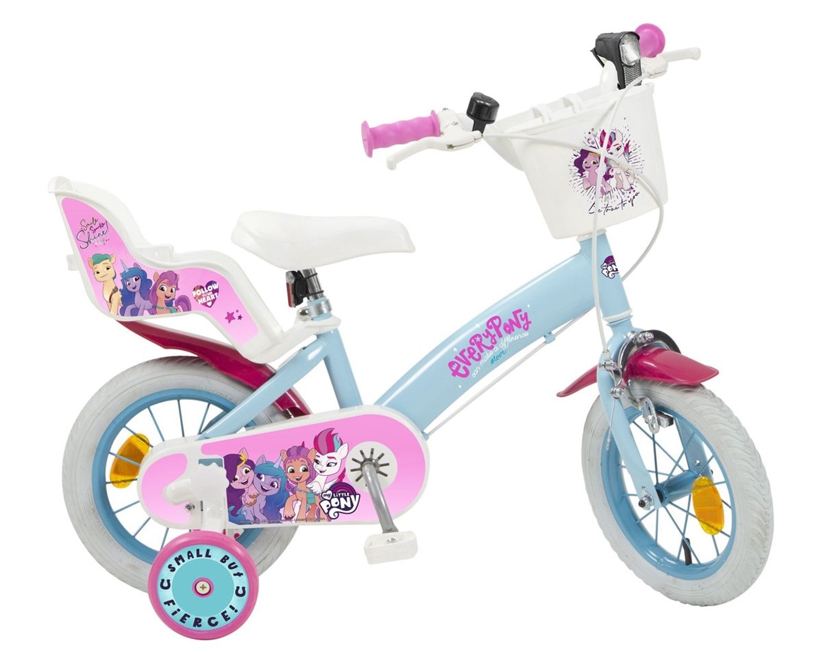 Originální dětské kolo od španělského výrobce Toimsa My Little Pony s velikostí ráfků 12 palců je určeno pro nejmenší děti ve věku od 3 do 4,5 let s výškou do 95 cm. Kolo je opatřeno demontovatelnými balančními kolečky, dítě se tedy bude cítit hned od první jízdy bezpečně a stabilně. Kolo je vybaveno 2 druhy brzd. Brždění probíhá buď zadní bubnovou brzdou nebo lze použít přední pákovou brzdu. Obě brzdy se ovládají pomocí páček umístěných na řídítkách. Proti nechtěnému namotání nohavice nebo tkaničky do řetězu má kolo kryt s barevným potiskem, který zakrývá celý řetěz. Sedadlo i řídítka jsou výškově nastavitelné. Za sedadlem je umístěný nosič na panenku.