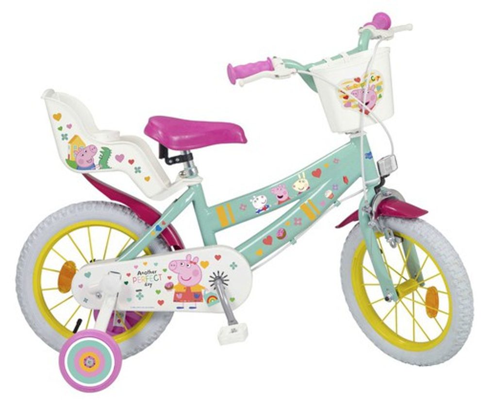 Originální dětské kolo od španělského výrobce Toimsa Peppa Pig s velikostí ráfků 14 palců je určeno pro děti ve věku od 3,5 do 5 let s výškou do 100 cm. Kolo je opatřeno demontovatelnými balančními kolečky, dítě se tedy bude cítit hned od první jízdy bezpečně a stabilně. Kolo je vybaveno 2 druhy brzd. Brždění probíhá buď zadní bubnovou brzdou nebo lze použít přední pákovou brzdu. Obě brzdy se ovládají pomocí páček umístěných na řídítkách. Proti nechtěnému namotání nohavice nebo tkaničky do řetězu má kolo kryt s barevným potiskem, který zakrývá celý řetěz. Sedadlo i řídítka jsou výškově nastavitelné. Na řídítkách je umístěn plastový košíček. V zadní části je připevněný nosič na panenku.