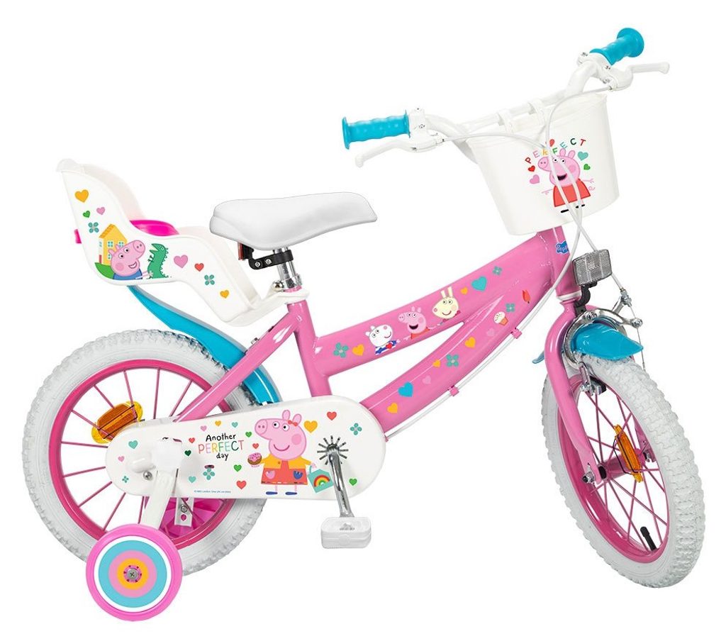 Originální dětské kolo od španělského výrobce Toimsa Peppa Pig s velikostí ráfků 14 palců je určeno pro děti ve věku od 3,5 do 5 let s výškou do 100 cm. Kolo je opatřeno demontovatelnými balančními kolečky, dítě se tedy bude cítit hned od první jízdy bezpečně a stabilně. Kolo je vybaveno 2 druhy brzd. Brždění probíhá buď zadní bubnovou brzdou nebo lze použít přední pákovou brzdu. Obě brzdy se ovládají pomocí páček umístěných na řídítkách. Proti nechtěnému namotání nohavice nebo tkaničky do řetězu má kolo kryt s barevným potiskem, který zakrývá celý řetěz. Sedadlo i řídítka jsou výškově nastavitelné. Na řídítkách je umístěn plastový košíček. V zadní části je připevněný nosič na panenku.