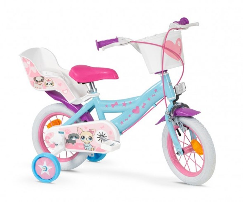 Originální dětské kolo od španělského výrobce Toimsa Pets s velikostí ráfků 12 palců je určeno pro nejmenší děti ve věku od 3 do 4,5 let s výškou do 95 cm. Kolo je opatřeno demontovatelnými balančními kolečky, dítě se tedy bude cítit hned od první jízdy bezpečně a stabilně. Kolo je vybaveno 2 druhy brzd. Brždění probíhá buď zadní bubnovou brzdou nebo lze použít přední pákovou brzdu. Obě brzdy se ovládají pomocí páček umístěných na řídítkách. Proti nechtěnému namotání nohavice nebo tkaničky do řetězu má kolo kryt s barevným potiskem, který zakrývá celý řetěz. Sedadlo i řídítka jsou výškově nastavitelné. Za sedadlem je umístěný nosič na panenku.