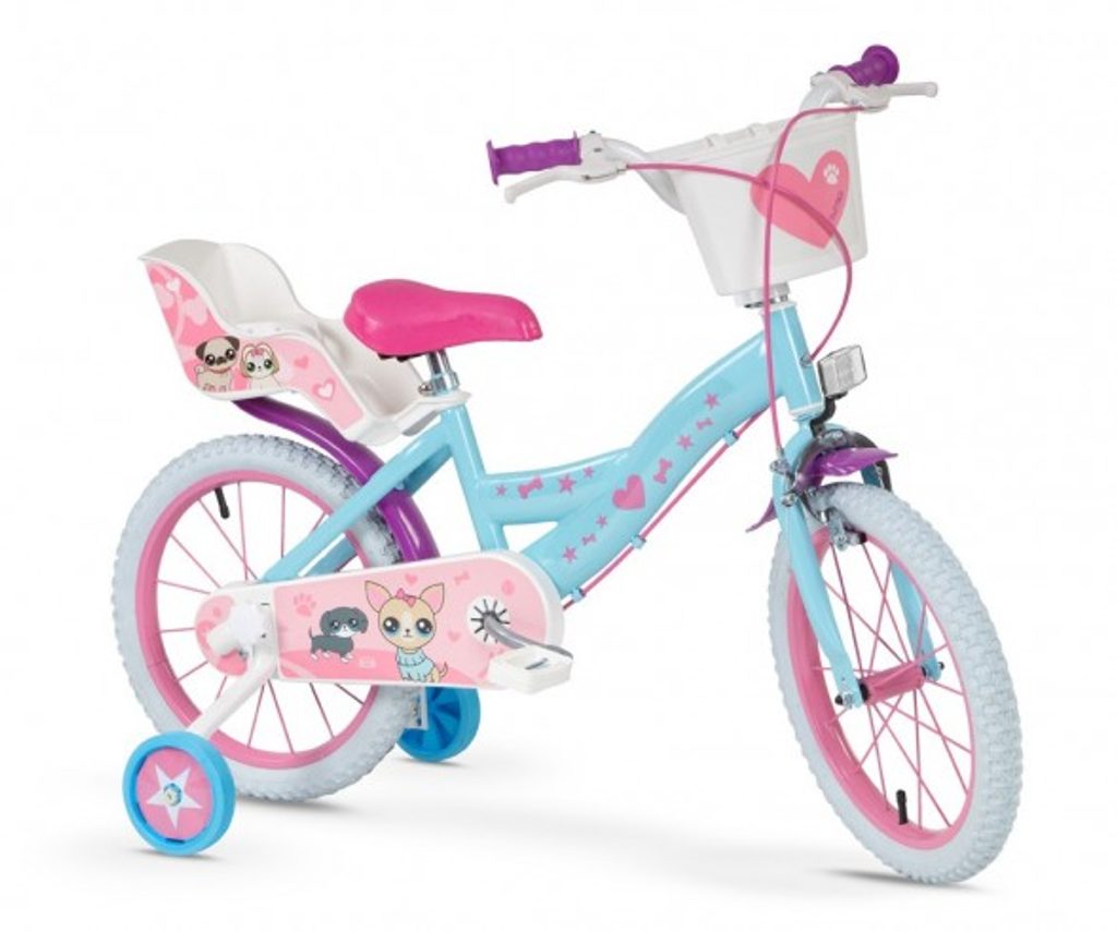 Originální dětské kolo od španělského výrobce Toimsa Pets s velikostí ráfků 16 palců je určeno pro děti ve věku od 4 do 6 let s výškou do 105 cm. Kolo je opatřeno demontovatelnými balančními kolečky, dítě se tedy bude cítit hned od první jízdy bezpečně a stabilně. Kolo je vybaveno 2 druhy brzd. Brždění probíhá buď zadní bubnovou brzdou nebo lze použít přední pákovou brzdu. Obě brzdy se ovládají pomocí páček umístěných na řídítkách. Proti nechtěnému namotání nohavice nebo tkaničky do řetězu má kolo kryt s barevným potiskem, který zakrývá celý řetěz. Sedadlo i řídítka jsou výškově nastavitelné. Na řídítkách je umístěn košíček. V zadní části je připevněný nosič na panenky.