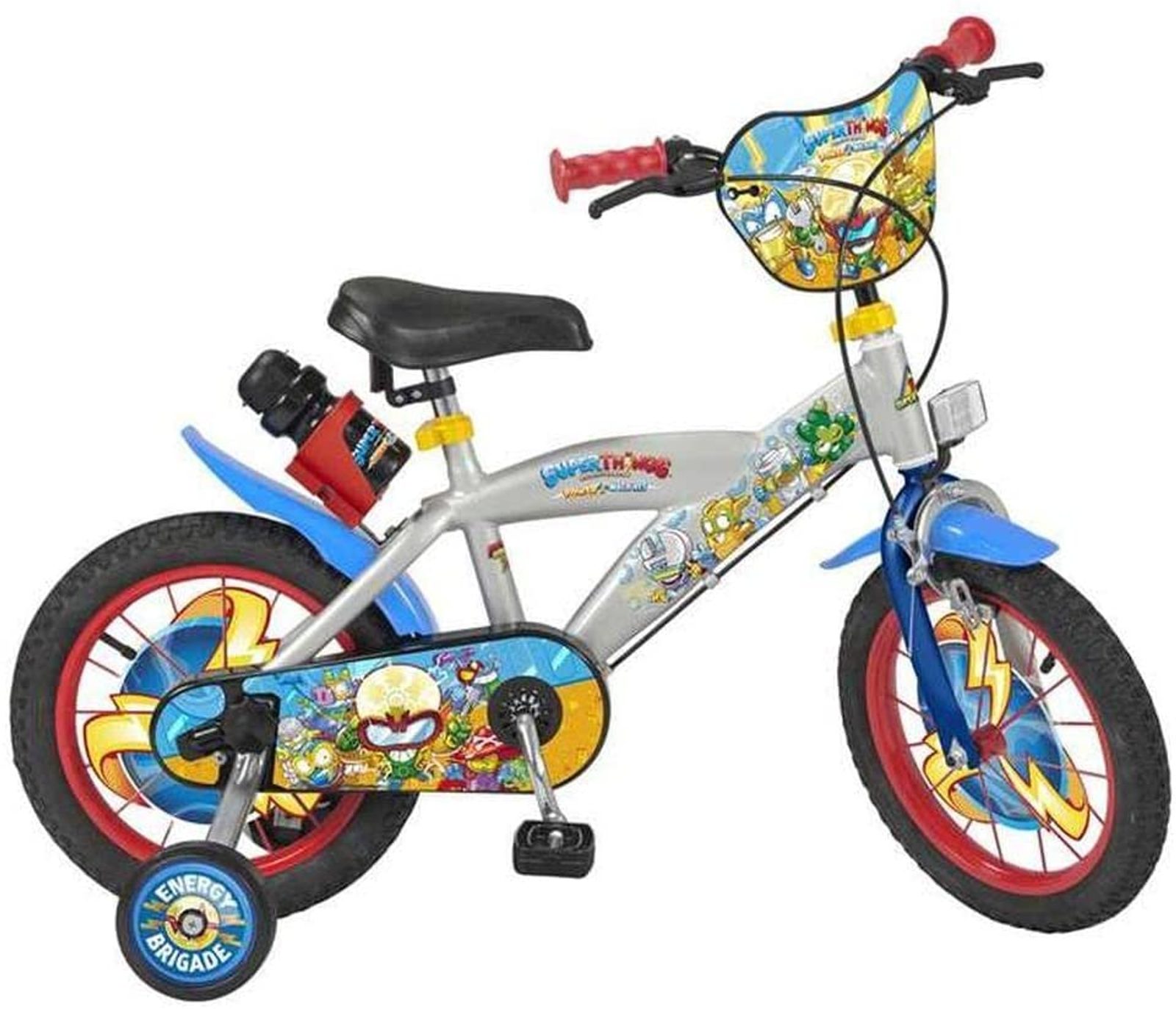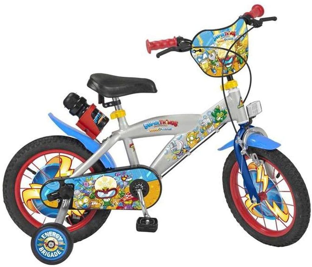 Originální dětské kolo od španělského výrobce Toimsa Superthings s velikostí ráfků 14 palců je určeno pro děti ve věku od 3,5 do 5 let s výškou do 100 cm. Kolo je opatřeno demontovatelnými balančními kolečky, dítě se tedy bude cítit hned od první jízdy bezpečně a stabilně. Kolo je vybaveno 2 druhy brzd. Brždění probíhá buď zadní bubnovou brzdou nebo lze použít přední pákovou brzdu. Obě brzdy se ovládají pomocí páček umístěných na řídítkách. Proti nechtěnému namotání nohavice nebo tkaničky do řetězu má kolo kryt s barevným potiskem, který zakrývá celý řetěz. Sedadlo i řídítka jsou výškově nastavitelné. V zadní části je připevněný nosič s lahví na pití.