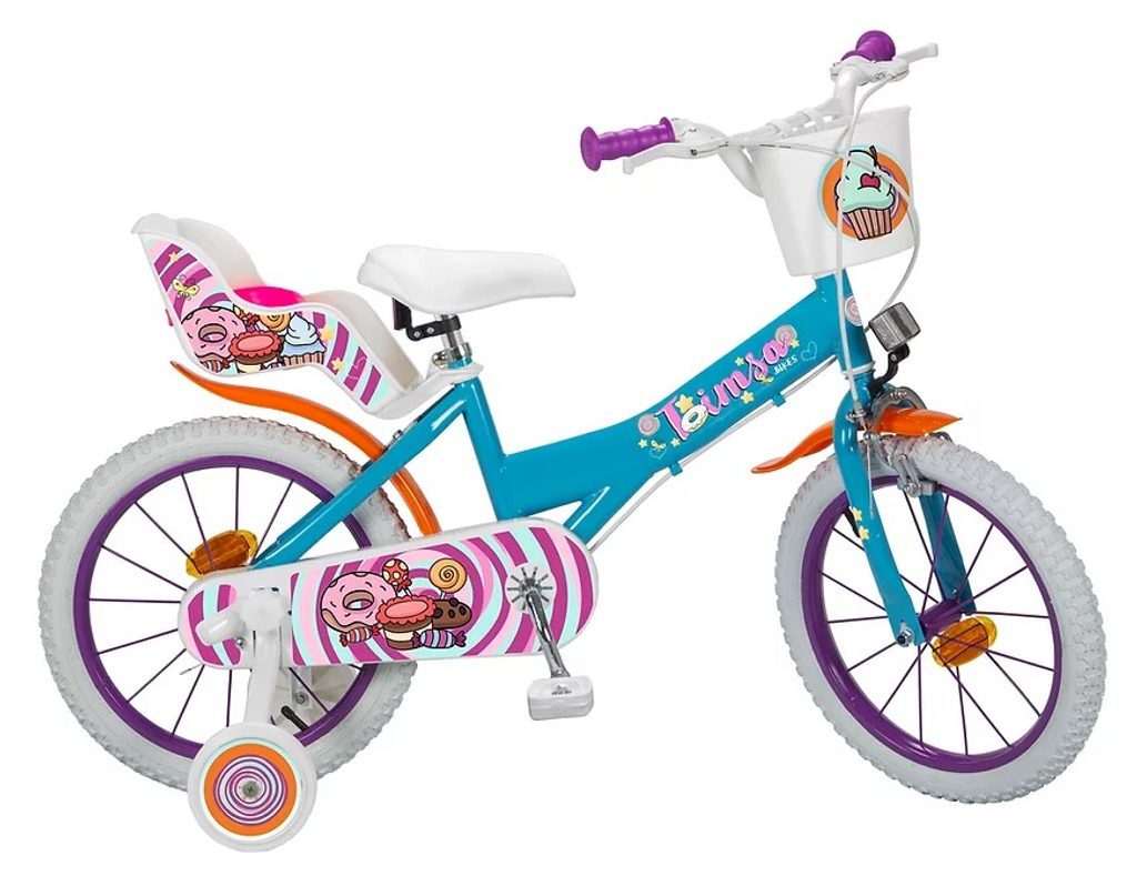 Originální dětské kolo od španělského výrobce Toimsa Sweet Fantasy s velikostí ráfků 16 palců je určeno pro děti ve věku od 4 do 6 let s výškou do 105 cm. Kolo je opatřeno demontovatelnými balančními kolečky, dítě se tedy bude cítit hned od první jízdy bezpečně a stabilně. Kolo je vybaveno 2 druhy brzd. Brždění probíhá buď zadní bubnovou brzdou nebo lze použít přední pákovou brzdu. Obě brzdy se ovládají pomocí páček umístěných na řídítkách. Proti nechtěnému namotání nohavice nebo tkaničky do řetězu má kolo kryt s barevným potiskem, který zakrývá celý řetěz. Sedadlo i řídítka jsou výškově nastavitelné. Na řídítkách je umístěn košíček. V zadní části je připevněný nosič na panenky.