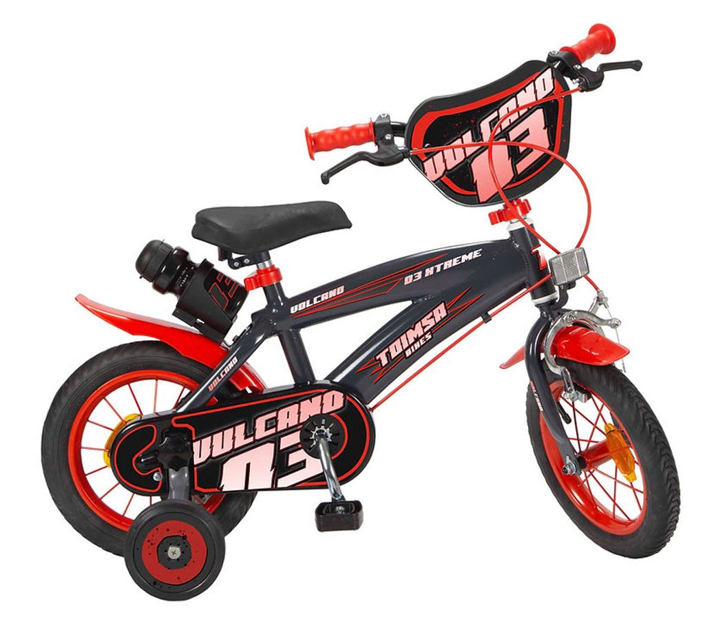Originální dětské kolo od španělského výrobce Toimsa Vulcano s velikostí ráfků 12 palců je určeno pro nejmenší děti ve věku od 3 do 4,5 let s výškou do 95 cm. Kolo je opatřeno demontovatelnými balančními kolečky, dítě se tedy bude cítit hned od první jízdy bezpečně a stabilně. Kolo je vybaveno 2 druhy brzd. Brždění probíhá buď zadní bubnovou brzdou nebo lze použít přední pákovou brzdu. Obě brzdy se ovládají pomocí páček umístěných na řídítkách. Proti nechtěnému namotání nohavice nebo tkaničky do řetězu má kolo kryt s barevným potiskem, který zakrývá celý řetěz. Sedadlo i řídítka jsou výškově nastavitelné. Za sedadlem je umístěný nosič s lahví na pití.