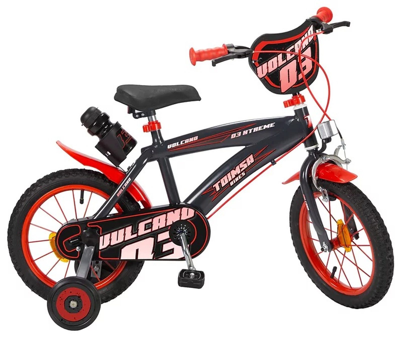 Originální dětské kolo od španělského výrobce Toimsa Vulcano s velikostí ráfků 14 palců je určeno pro děti ve věku od 3,5 do 5 let s výškou do 100 cm. Kolo je opatřeno demontovatelnými balančními kolečky, dítě se tedy bude cítit hned od první jízdy bezpečně a stabilně. Kolo je vybaveno 2 druhy brzd. Brždění probíhá buď zadní bubnovou brzdou nebo lze použít přední pákovou brzdu. Obě brzdy se ovládají pomocí páček umístěných na řídítkách. Proti nechtěnému namotání nohavice nebo tkaničky do řetězu má kolo kryt s barevným potiskem, který zakrývá celý řetěz. Sedadlo i řídítka jsou výškově nastavitelné. V zadní části je připevněný nosič s lahví na pití.