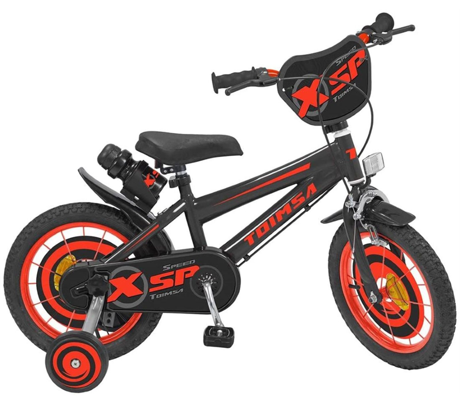 Originální dětské kolo od španělského výrobce Toimsa XSP Speed s velikostí ráfků 14 palců je určeno pro děti ve věku od 3,5 do 5 let s výškou do 100 cm. Kolo je opatřeno demontovatelnými balančními kolečky, dítě se tedy bude cítit hned od první jízdy bezpečně a stabilně. Kolo je vybaveno 2 druhy brzd. Brždění probíhá buď zadní bubnovou brzdou nebo lze použít přední pákovou brzdu. Obě brzdy se ovládají pomocí páček umístěných na řídítkách. Proti nechtěnému namotání nohavice nebo tkaničky do řetězu má kolo kryt s barevným potiskem, který zakrývá celý řetěz. Sedadlo i řídítka jsou výškově nastavitelné. V zadní části je připevněný nosič s lahví na pití.