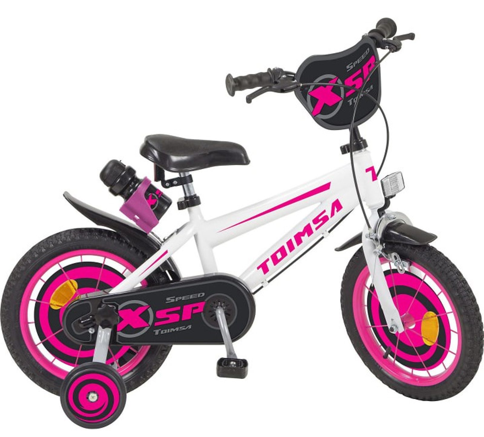 Originální dětské kolo od španělského výrobce Toimsa XSP Speed s velikostí ráfků 14 palců je určeno pro děti ve věku od 3,5 do 5 let s výškou do 100 cm. Kolo je opatřeno demontovatelnými balančními kolečky, dítě se tedy bude cítit hned od první jízdy bezpečně a stabilně. Kolo je vybaveno 2 druhy brzd. Brždění probíhá buď zadní bubnovou brzdou nebo lze použít přední pákovou brzdu. Obě brzdy se ovládají pomocí páček umístěných na řídítkách. Proti nechtěnému namotání nohavice nebo tkaničky do řetězu má kolo kryt s barevným potiskem, který zakrývá celý řetěz. Sedadlo i řídítka jsou výškově nastavitelné. V zadní části je připevněný nosič s lahví na pití.