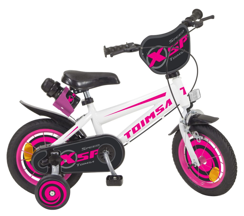 Originální dětské kolo od španělského výrobce Toimsa XSP White s velikostí ráfků 12 palců je určeno pro nejmenší děti ve věku od 3 do 4,5 let s výškou do 95 cm. Kolo je opatřeno demontovatelnými balančními kolečky, dítě se tedy bude cítit hned od první jízdy bezpečně a stabilně. Kolo je vybaveno 2 druhy brzd. Brždění probíhá buď zadní bubnovou brzdou nebo lze použít přední pákovou brzdu. Obě brzdy se ovládají pomocí páček umístěných na řídítkách. Proti nechtěnému namotání nohavice nebo tkaničky do řetězu má kolo kryt s barevným potiskem, který zakrývá celý řetěz. Sedadlo i řídítka jsou výškově nastavitelné. Za sedadlem je umístěný nosič s lahví na pití.