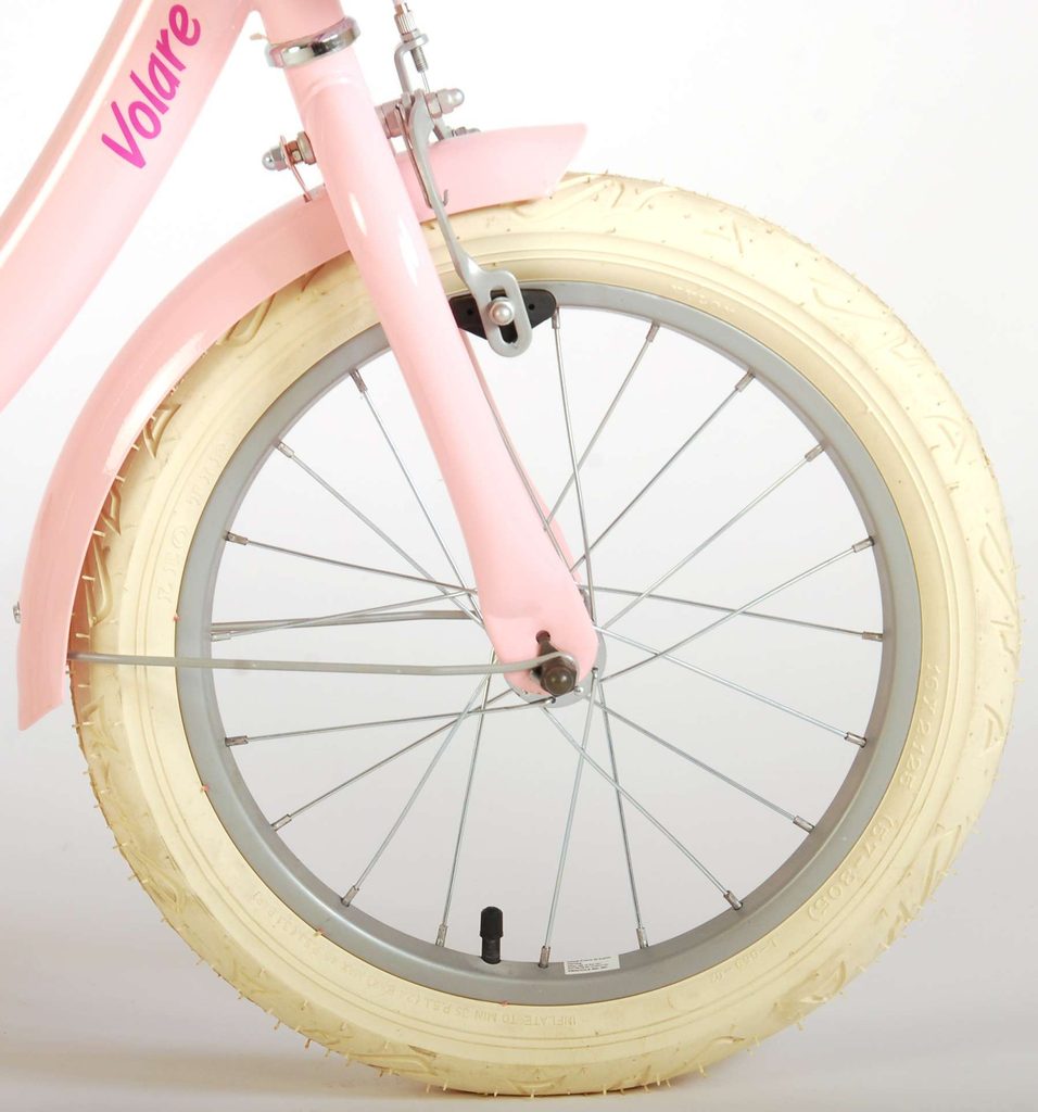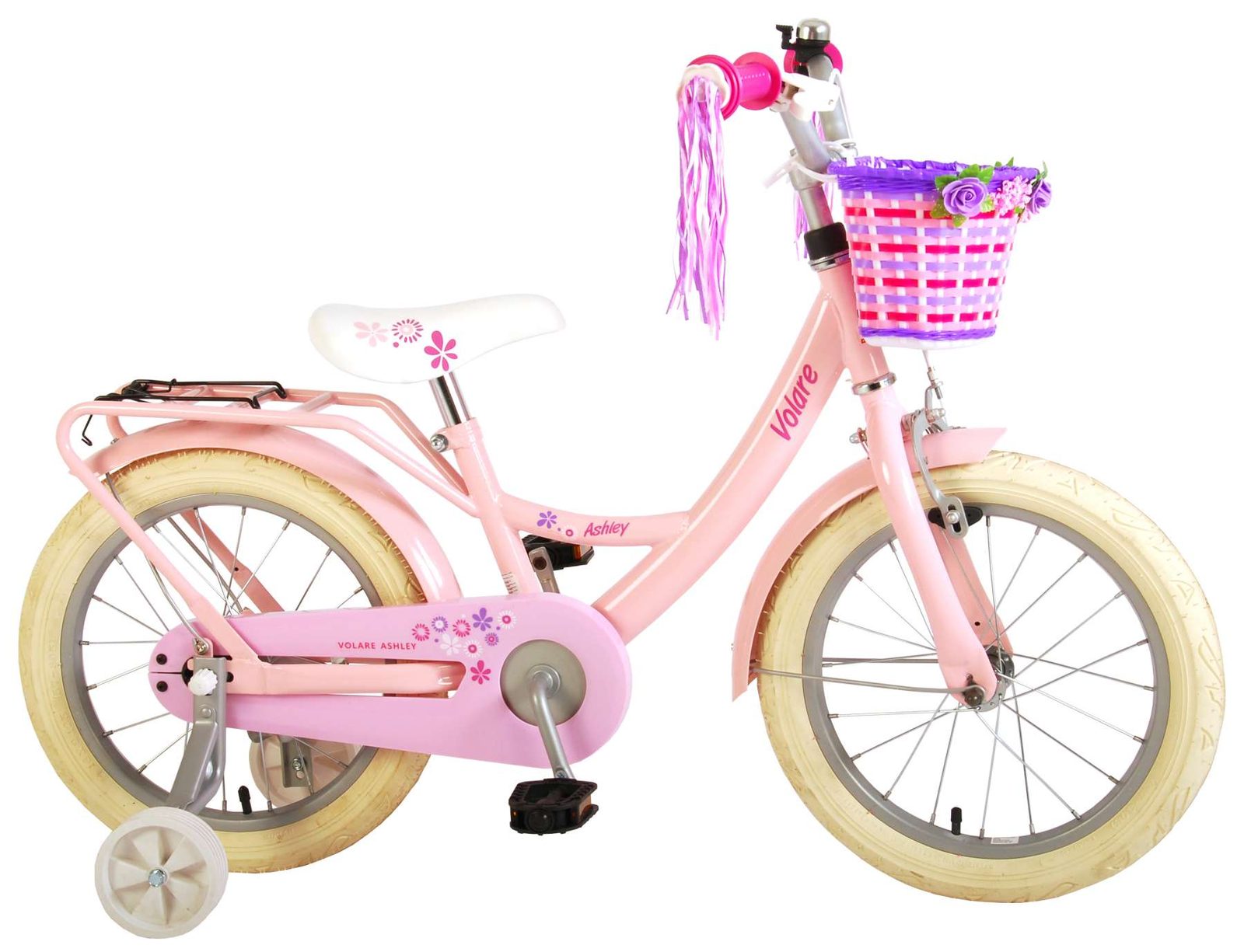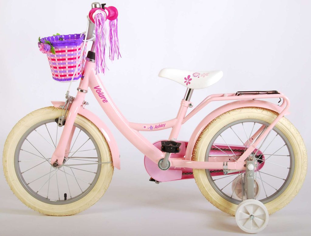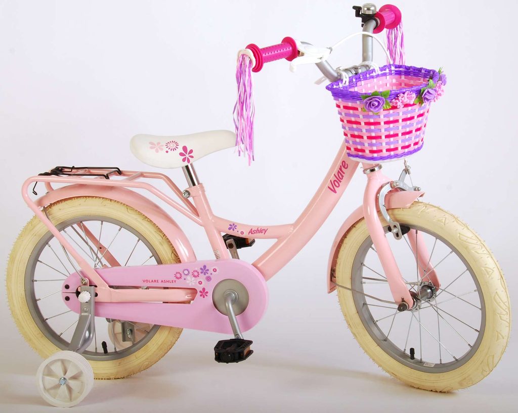 Originální dětské kolo od holandského výrobce Volare AshleyII s velikostí ráfků 16 palců je určeno pro děti ve věku od 4 do 6 let s výškou do 105 cm. Kolo je opatřeno demontovatelnými balančními kolečky, dítě se tedy bude cítit hned od první jízdy bezpečně a stabilně. Kolo je vybaveno 2 druhy brzd. Brždění probíhá buď protisměrnou zadní brzdou "torpédem", která umožnuje brzdit zpětným záběrem pedálů nebo lze použít přední pákovou brzdu. Proti nechtěnému namotání nohavice nebo tkaničky do řetězu má kolo kryt s barevným potiskem, který zakrývá celý řetěz. Sedadlo i řídítka jsou výškově nastavitelné. Na řídítkách je umístěn košíček a zvonek. V zadní části je připevněný nosič na panenky.