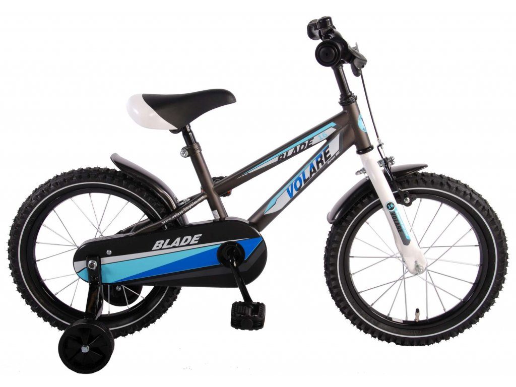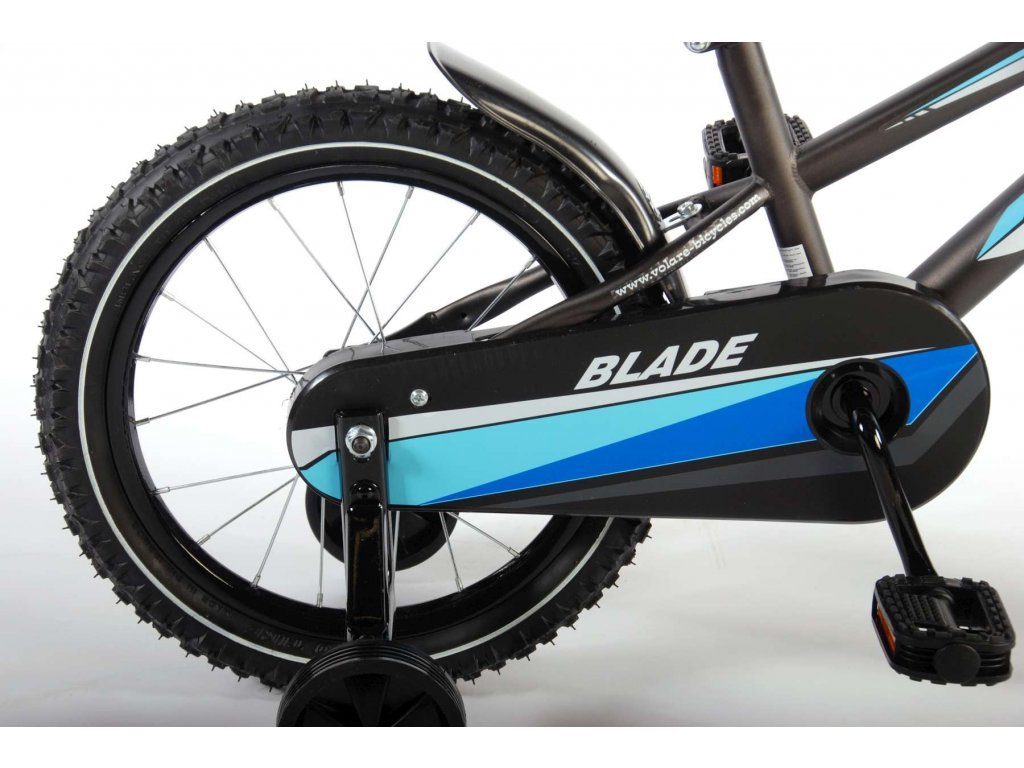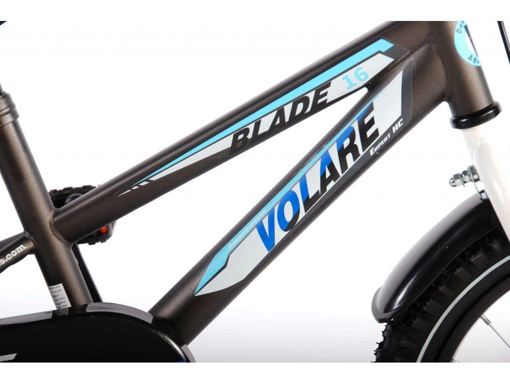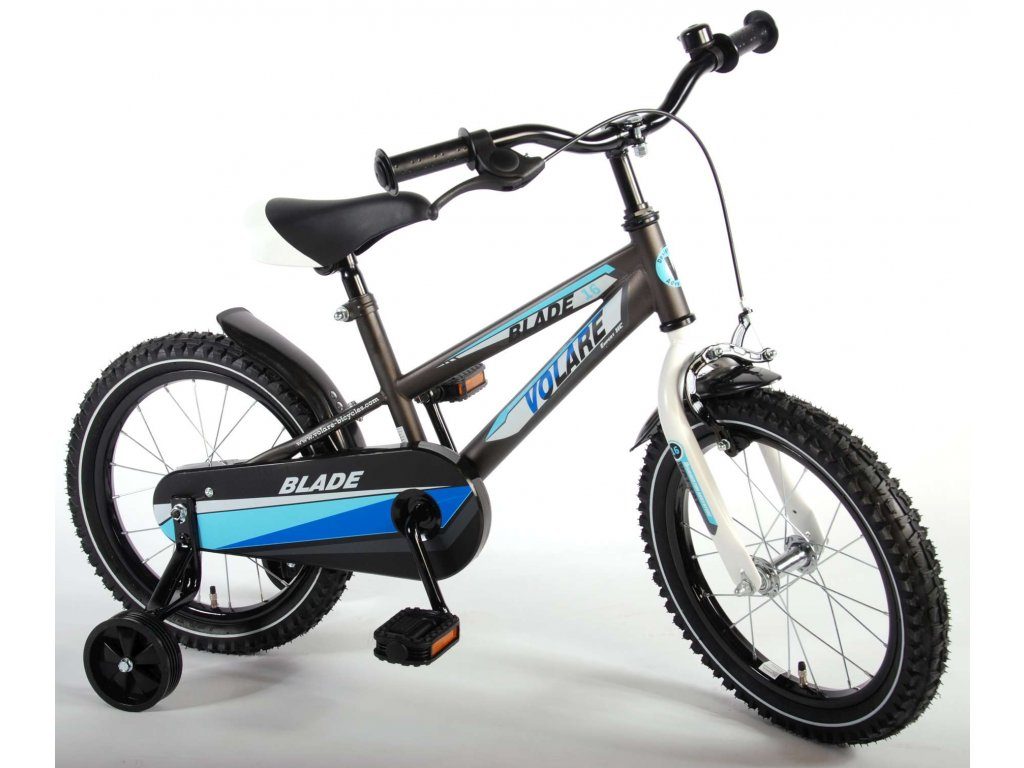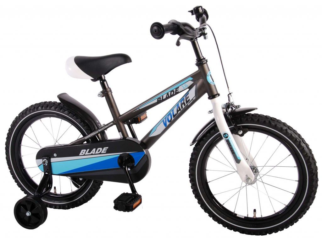 Originální dětské kolo od holandského výrobce Volare Blade Gray s velikostí ráfků 16 palců je určeno pro děti ve věku od 4 do 6 let s výškou do 105 cm. Kolo je opatřeno demontovatelnými balančními kolečky, dítě se tedy bude cítit hned od první jízdy bezpečně a stabilně. Kolo je vybaveno 2 druhy brzd. Brždění probíhá buď protisměrnou zadní brzdou "torpédem",která možnuje brzdit zpětným záběrem pedálů nebo lze použít přední pákovou brzdu. Proti nechtěnému namotání nohavice nebo tkaničky do řetězu má kolo kryt s barevným potiskem, který zakrývá celý řetěz. Sedadlo i řídítka jsou výškově nastavitelné. Za sedadlem je umístěný nosič s lahví na pití.
