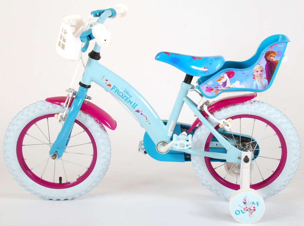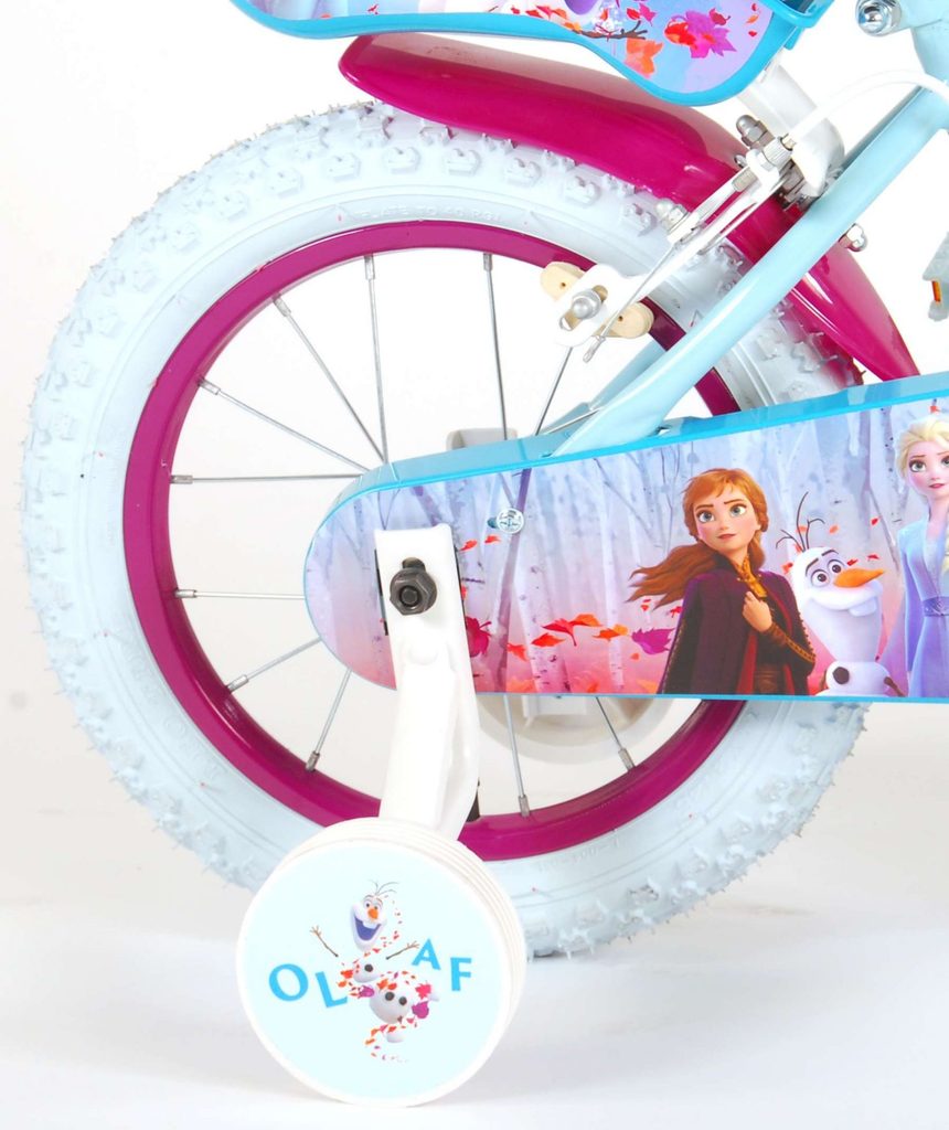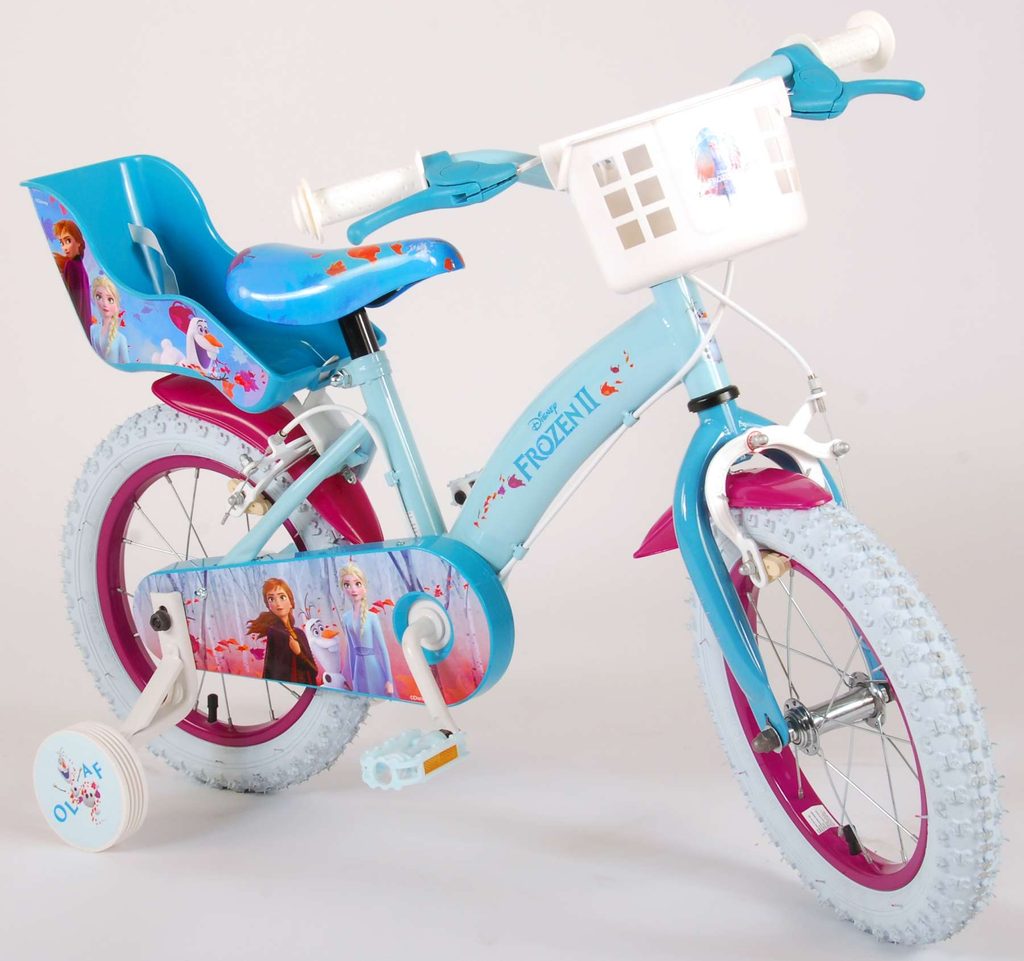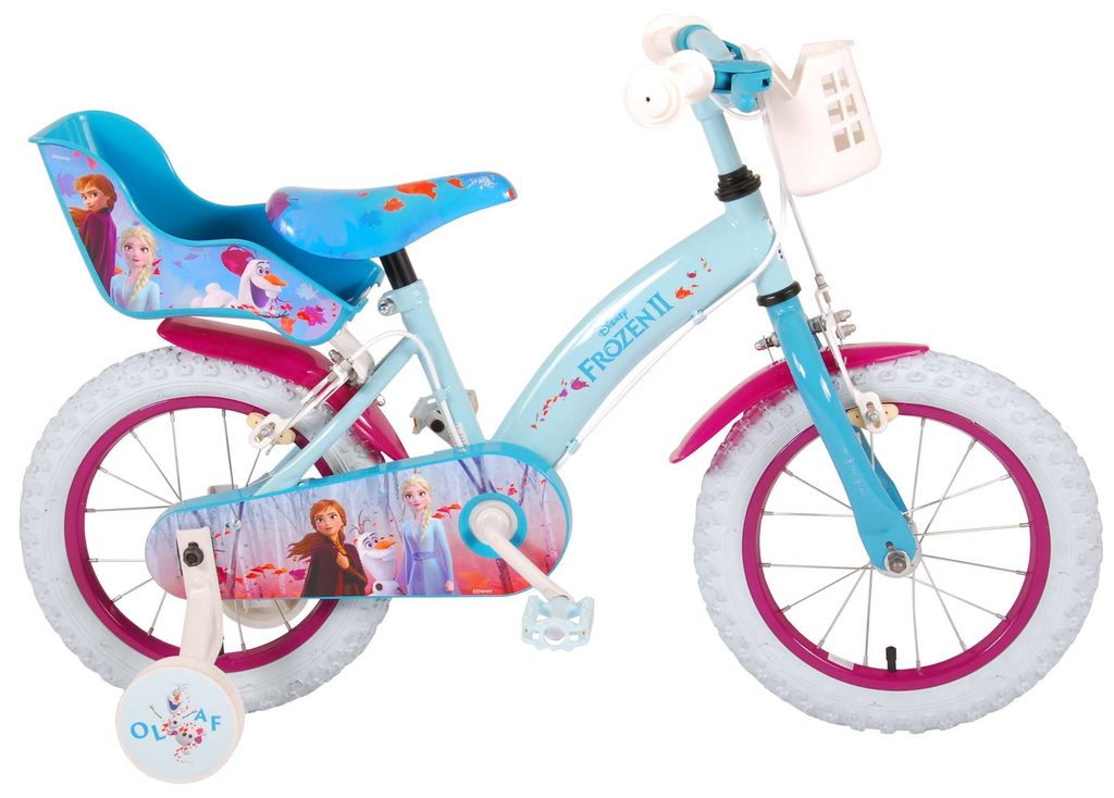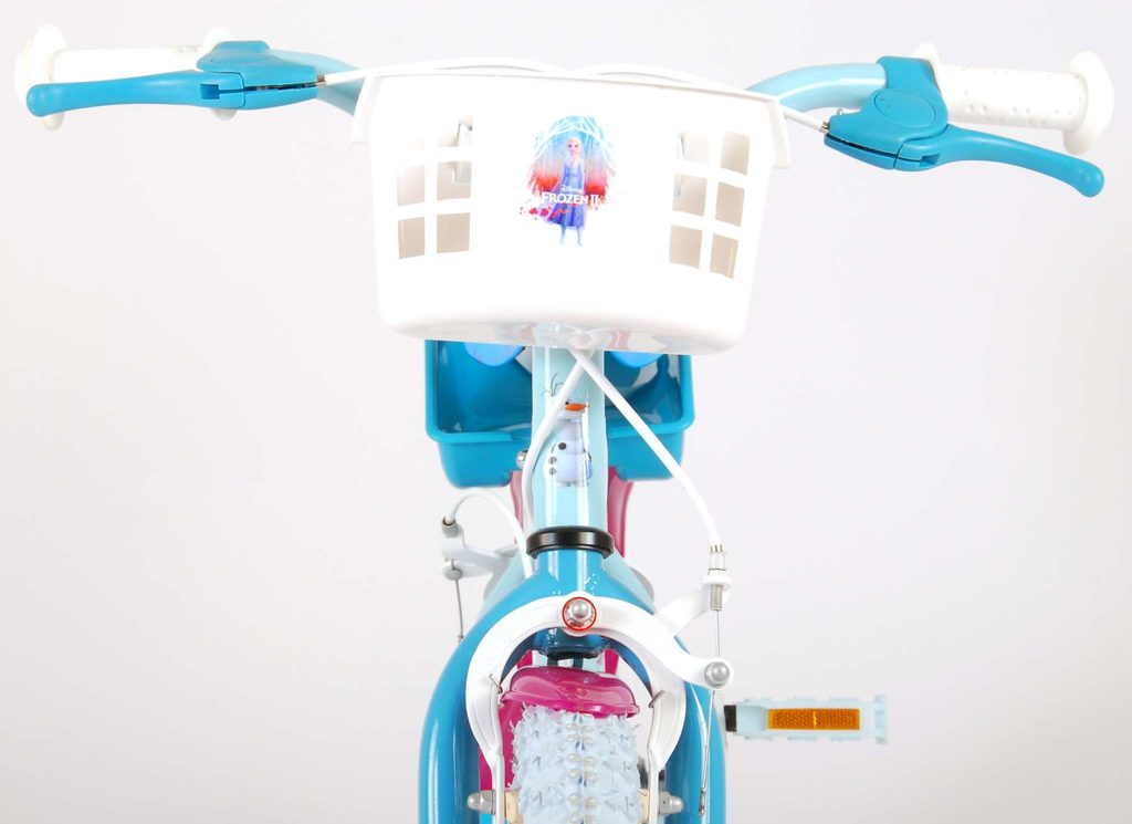 Originální dětské kolo od holandského výrobce Volare FrozenII (licence Disney) s velikostí ráfků 14 palců je určeno pro děti ve věku od 3,5 do 5 let s výškou do 100 cm. Kolo je opatřeno demontovatelnými balančními kolečky, dítě se tedy bude cítit hned od první jízdy bezpečně a stabilně. Kolo je vybaveno 2 druhy brzd. Brždění probíhá přední nebo zadní pákovou brzdou. Proti nechtěnému namotání nohavice nebo tkaničky do řetězu má kolo kryt s obrázky, který zakrývá celý řetěz. Sedadlo i řídítka jsou výškově nastavitelné. V zadní části je umístěný nosič na panenky a v přední části je košík na hračky.