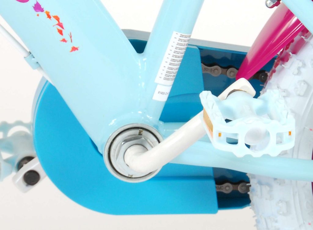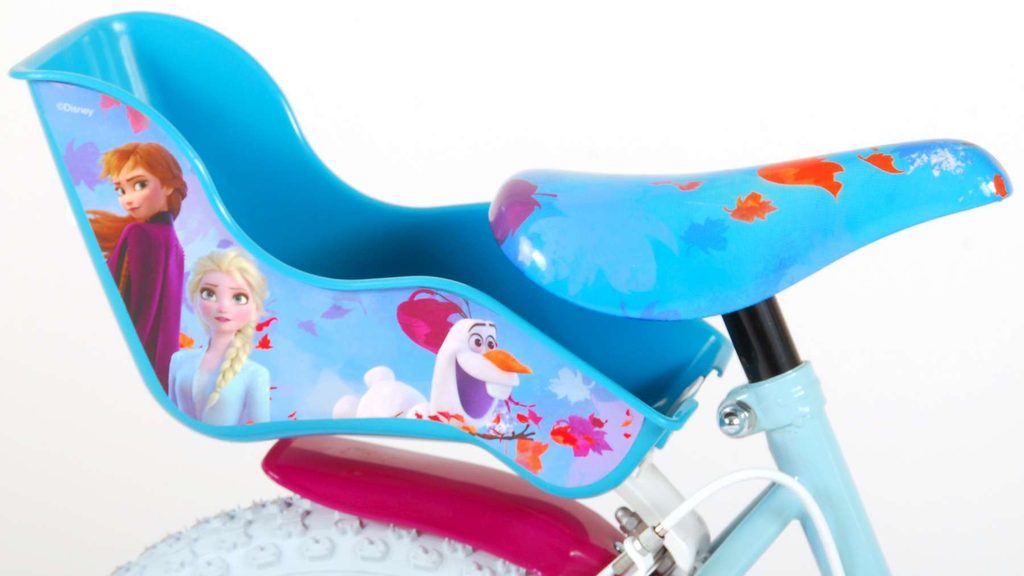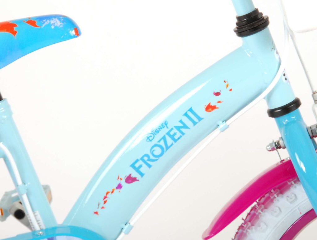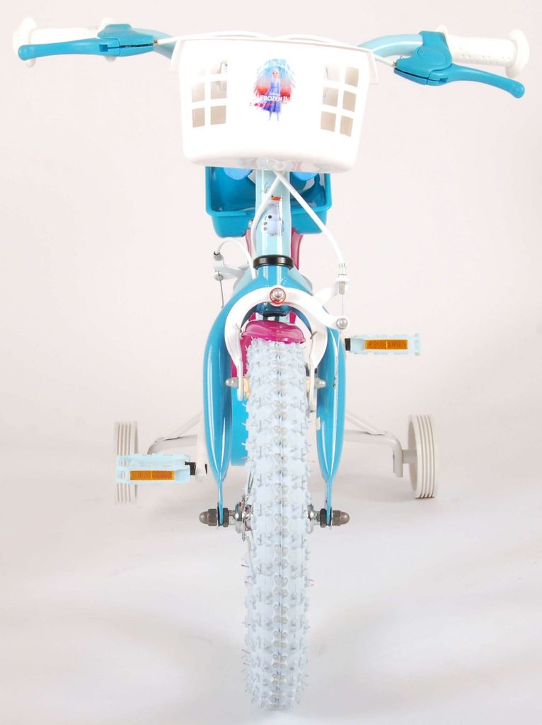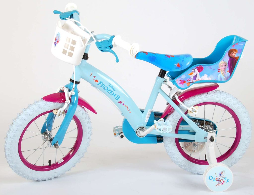 Originální dětské kolo od holandského výrobce Volare FrozenII (licence Disney) s velikostí ráfků 14 palců je určeno pro děti ve věku od 3,5 do 5 let s výškou do 100 cm. Kolo je opatřeno demontovatelnými balančními kolečky, dítě se tedy bude cítit hned od první jízdy bezpečně a stabilně. Kolo je vybaveno 2 druhy brzd. Brždění probíhá přední nebo zadní pákovou brzdou. Proti nechtěnému namotání nohavice nebo tkaničky do řetězu má kolo kryt s obrázky, který zakrývá celý řetěz. Sedadlo i řídítka jsou výškově nastavitelné. V zadní části je umístěný nosič na panenky a v přední části je košík na hračky.